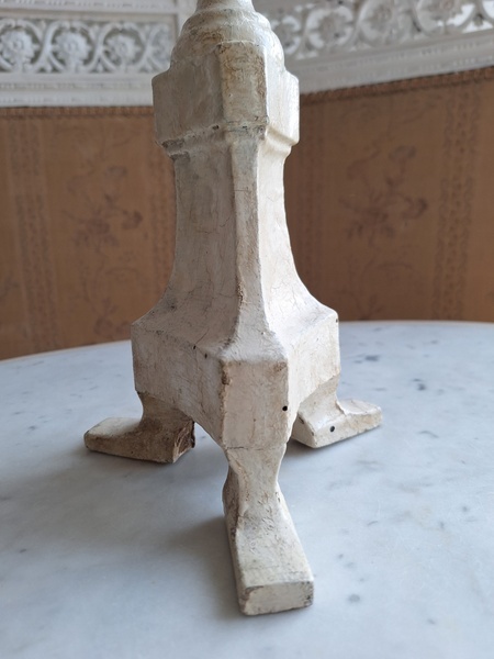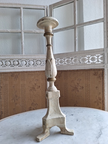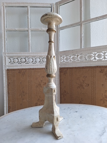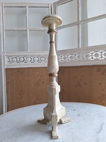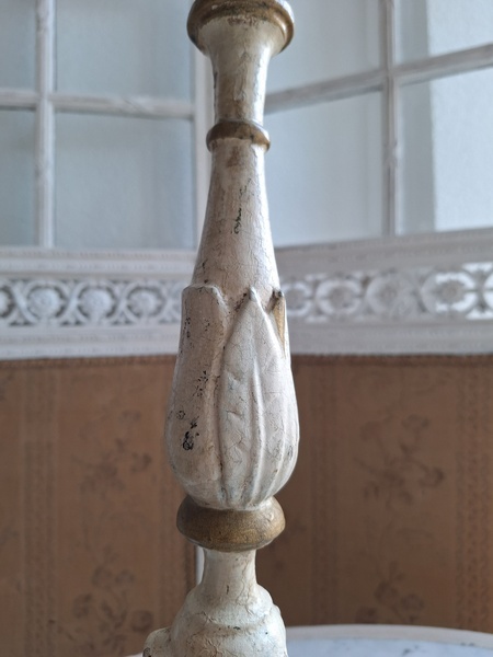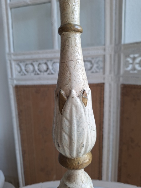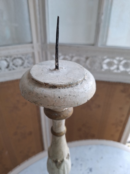 アンティークウッドキャンドスティック/キャンドルホルダーです。カトリック教会で使用されていた物です。こちらは南フランスで見つけたイタリア製のキャンドルスティックです。南フランスへはイタリアから販売に来られるディーラーさんも多いのでこういった物が南仏で手に入ります。シャビーテイストが何とも言えず一目惚れしたお品です。とても気に入っていたので我が家で3本使っています。2本くらいから使われるとおしゃれですよ。もし希望がありましたら1本、お譲りさせていただきます。大変古い物です。虫食いが見られますが1年以上こちらに置いてから販売していますのでご安心ください。イタリア製/1880-1900年代ごろ