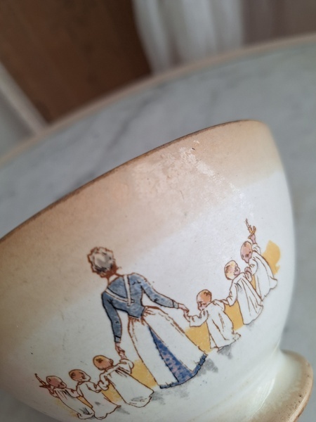 アンファンリシャールカフェオレボウル/サルググミンヌです。フランスのイラストレーター、Enfant Richard(アンファン リシャール)が手掛けたシリーズでフランスをはじめヨーロッパではコレクターが多いアイテムです。当店で扱ったウォッシュテーブルも描かれています。可愛すぎます♪20年買い付けしていますがカフェオレボウルは初めて出逢いました。上の色褪せがあったのと価格が高くて迷って一度は立ち去りましたがやっぱり気になって戻って買い付けしました。あれからもう5年程度経ちましたが、やっぱり出逢いはありません。残念ながら縁にご覧のような色褪せがあるのですがフットに小さな欠け、内側に窯傷の小さなホールがある以外はヒビや貫入、大きな欠けはありません。とても高かったので円高になるのを待っていましたがレートが安定しないので更新します。現レートで価格設定していますので高くなっていますが本当にレアなお品です。フランス製/1900年初頭