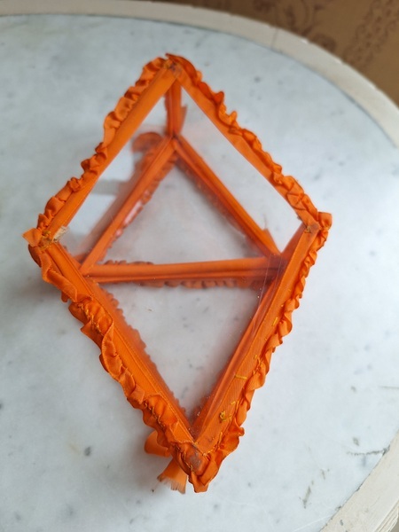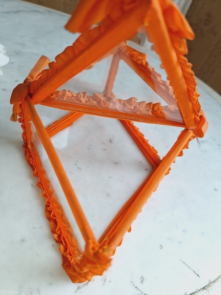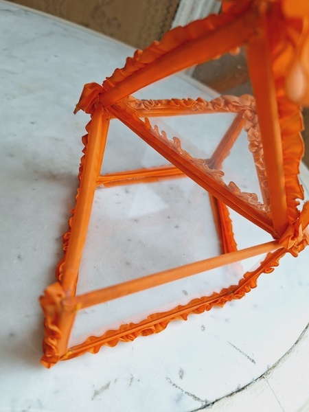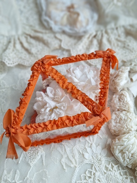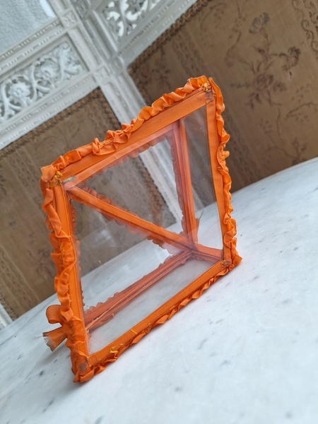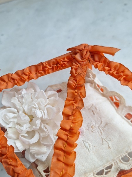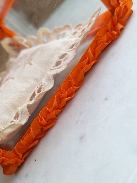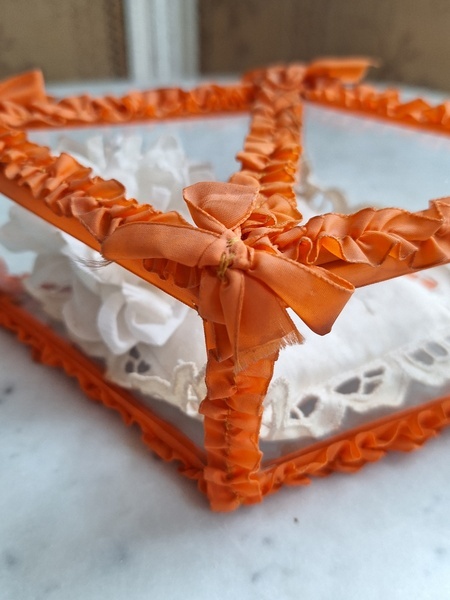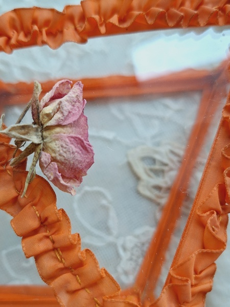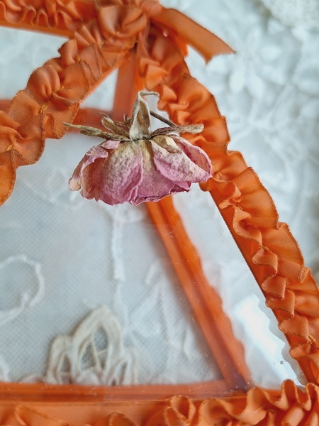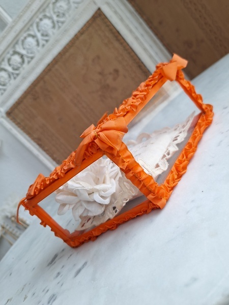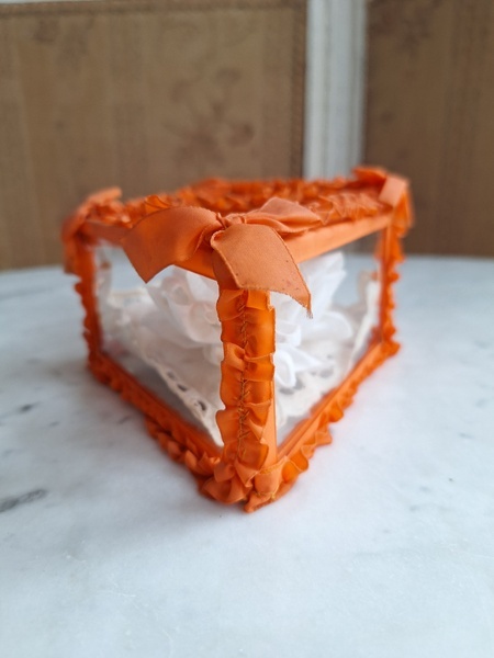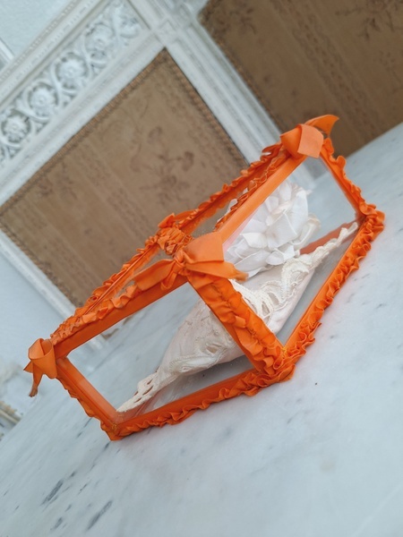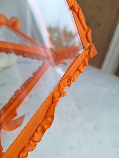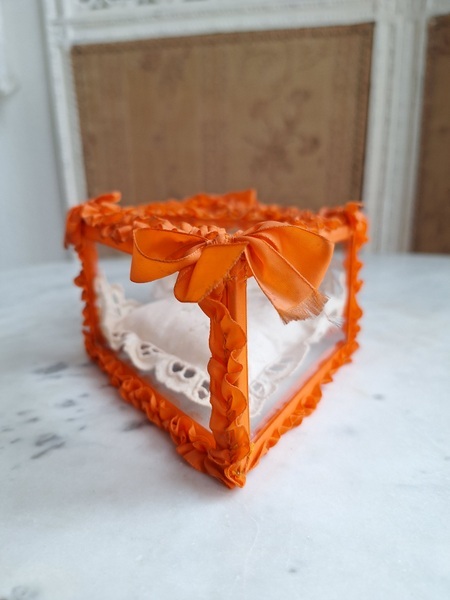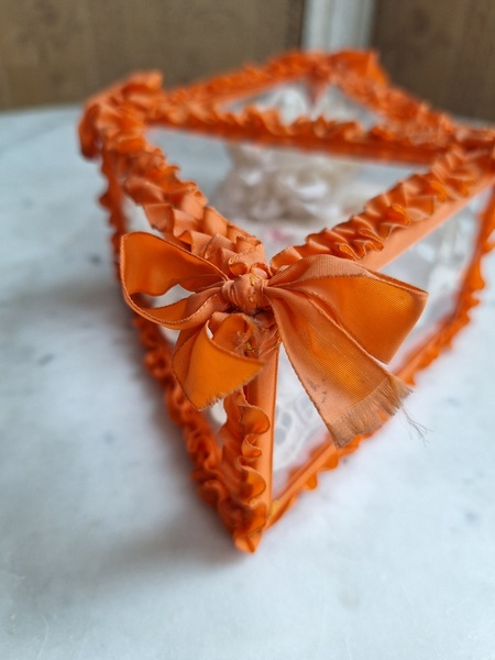 リボン装飾ガラスケースです。ハンドワークのガラスケースです。くしゅくしゅのリボンで装飾されています。カラフルなお色がお好きな方に。最後の画像の傷は底です。他、傷はありますが角度によって見える感じです。特に中にクッションと布花が付いていますので気になる感じはないです。パリのディーラーさんから。パリのお宅から出て来た物です。クッションと布花付です。フランス/1950年代ごろ