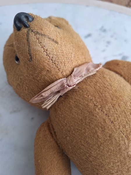 フレンチテディベアです。正統派の美人さんです。手脚はジョイントで動きます。目はガラス製、中は藁、鼻はプラスチック、口はこのようになっているのがオリジナルです。今までに何度か扱いました。ランス製/1940-50年代ごろ