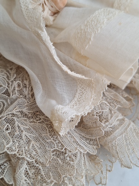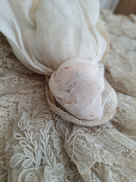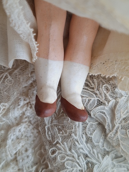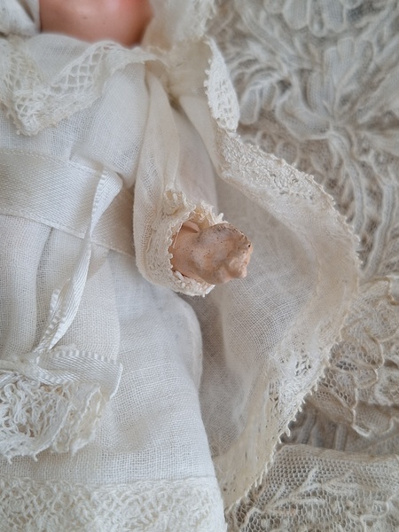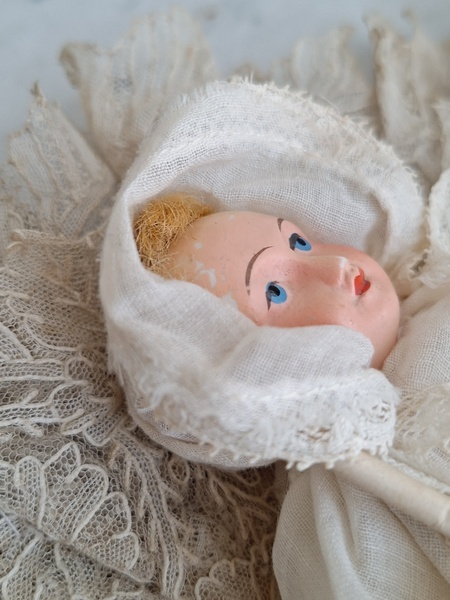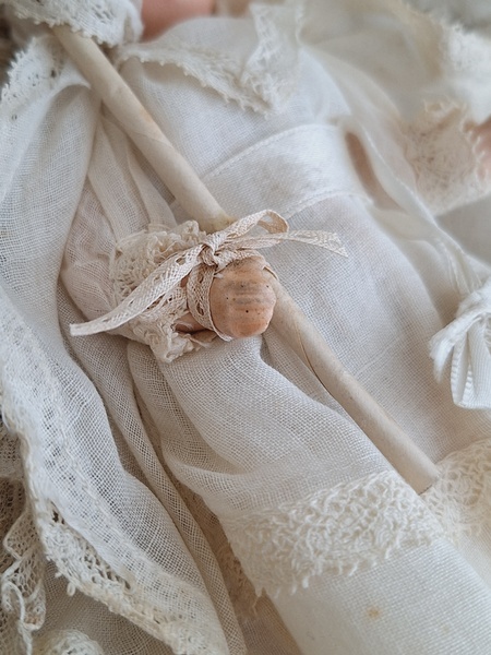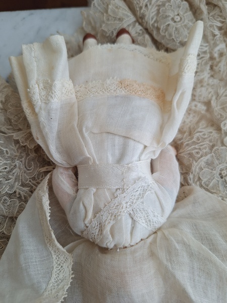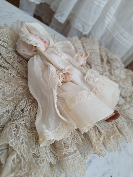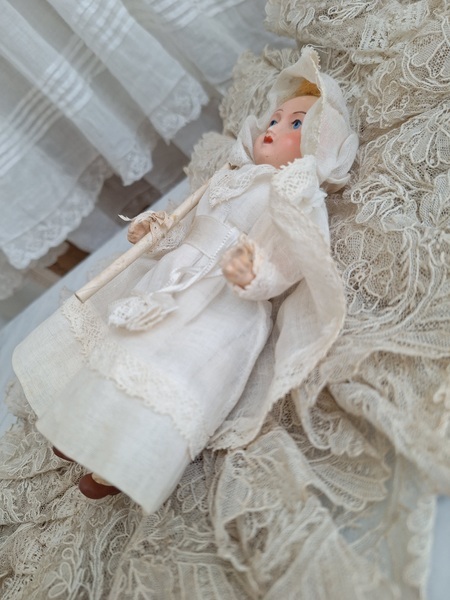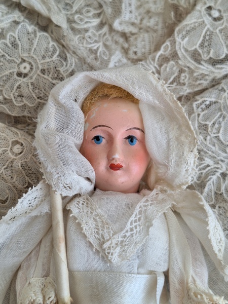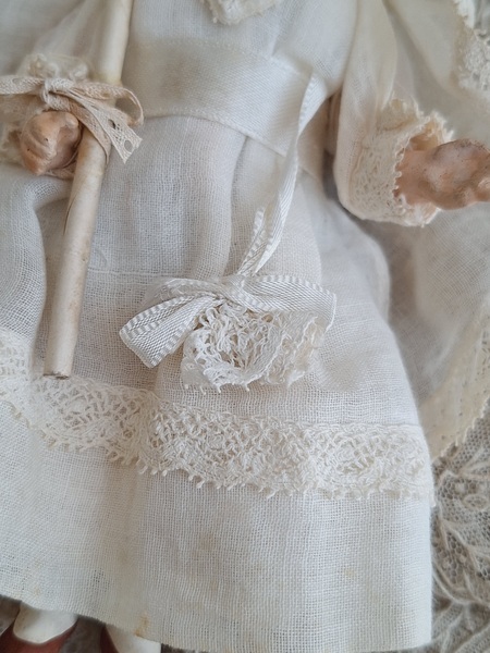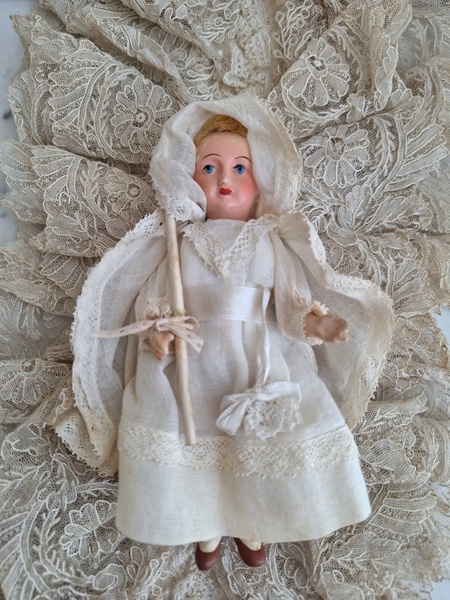 フレンチコミュニオンビスクドールです。首がカバーされているので確認出来ませんがお顔からUnis Franceのドールかと思います。いずれにしてもフランスのドールで間違いありません。ヘッドはビスク、ボディはコンポジション、手足、首はジョイントで動きます。ベールやオモニエールなど可愛い小物も揃っています。ヘッドの掛かっているベールはドールに固定されていたようで外れているためペイントが薄くなっている箇所あります。ドール自体はとても良い状態です。あとヘッドの辺りのベールに痛みがあります。こちらのようなビスクのコミュニオンドールですと現地では当店の価格の2.3倍で販売されています。フランス製/1920-30年代ごろ