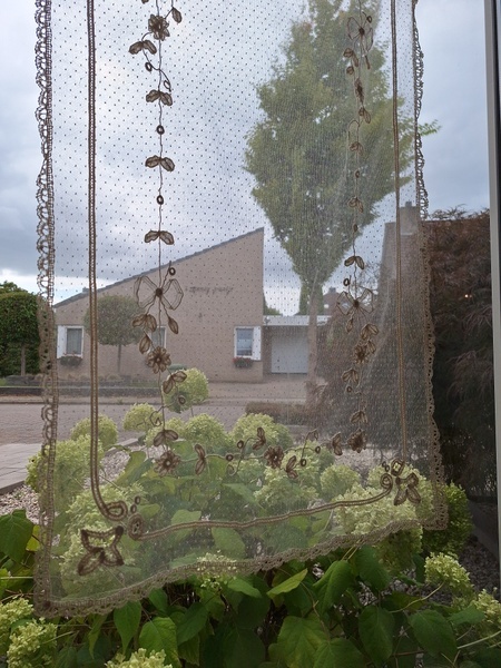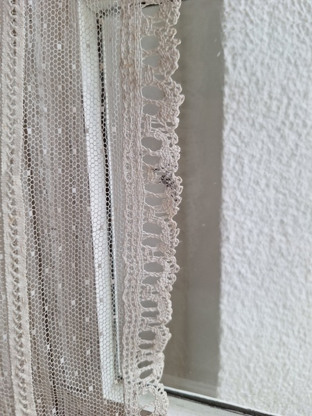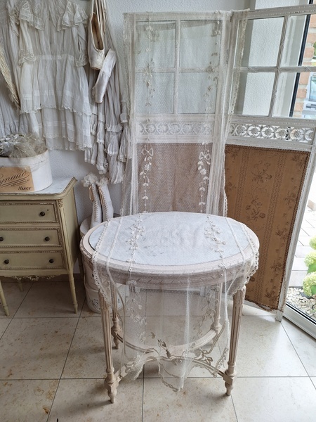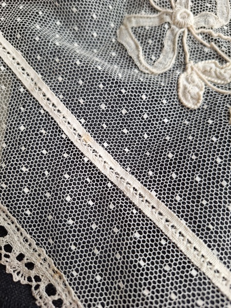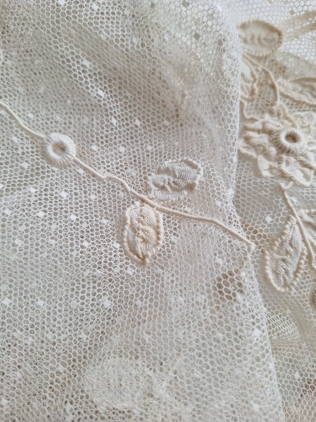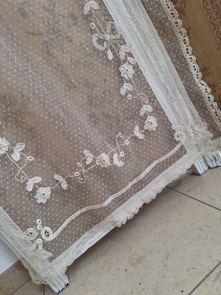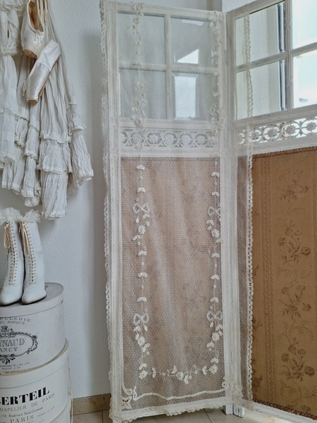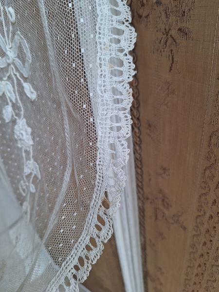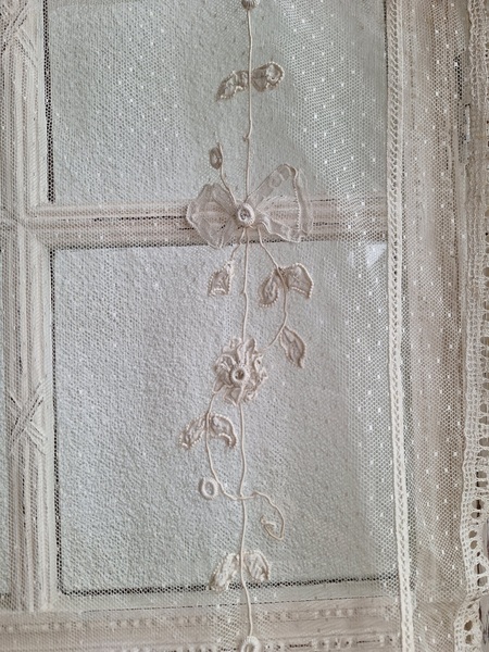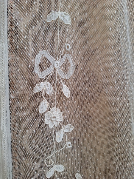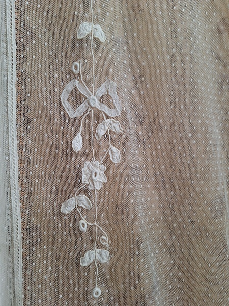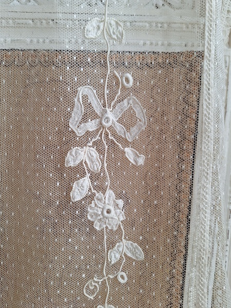 アンティークレースカーテンです。トッド柄に花とリボンのガーランド柄が愛らしいカーテンです。ご覧のようなレースの小さな痛み、色褪せがありますが近年見かける物としては良い状態と思います。最近はフランス人ディーラーさんがレースを買い占めてしまわれるので市場に出ず、オンラインなどで販売されてしまうためこういったレースの入荷自体が困難になっています。お探しの方はどうぞ。フランス/1930年代ごろ