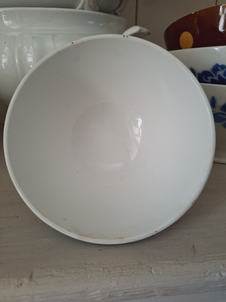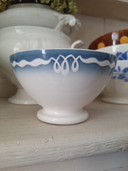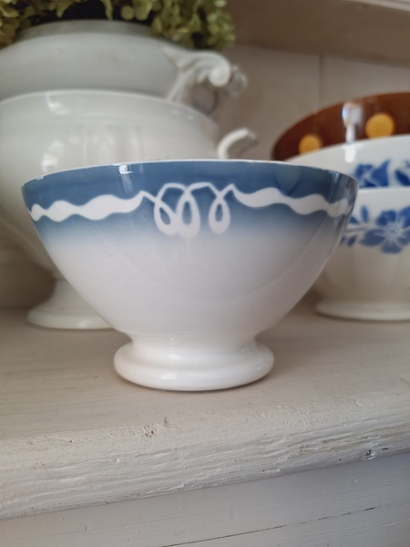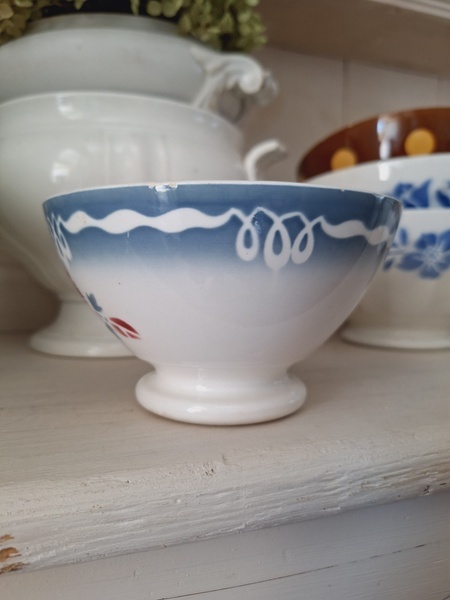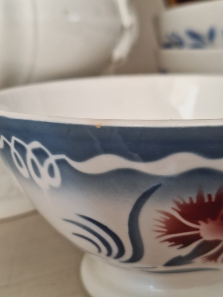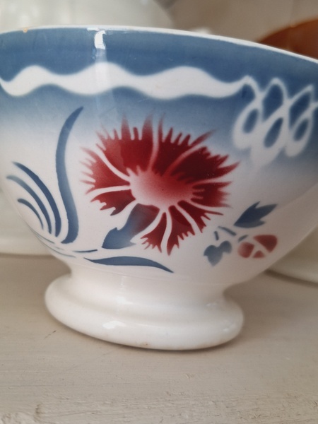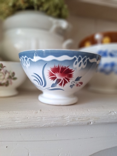 ディゴワンカーネーション柄カフェオレボウルです。底の裏に色褪せ、縁に表面が剥がれたような感じの箇所がありますがヒビや貫入は見られず良い状態です。有名メーカーのボウルももうこのような状態の物は見かけなくなりました。ボウルをお探しの方はどうぞ。フランス製/1940-50年代ごろ