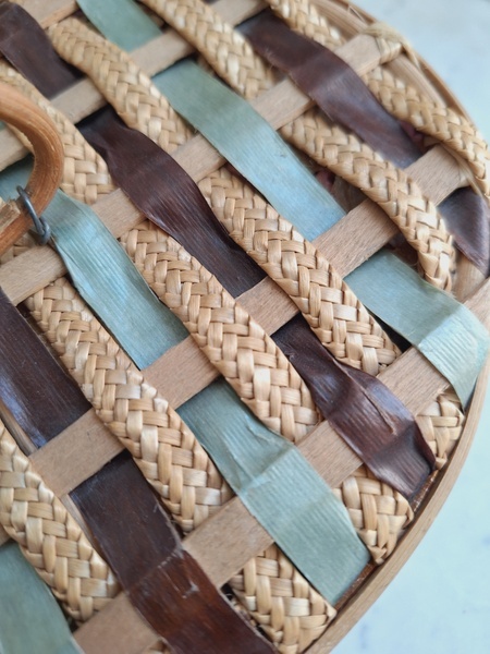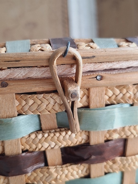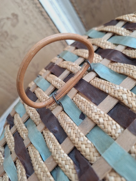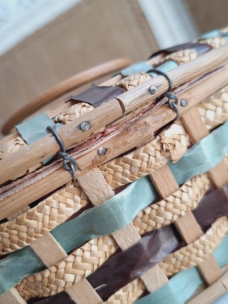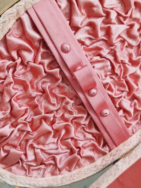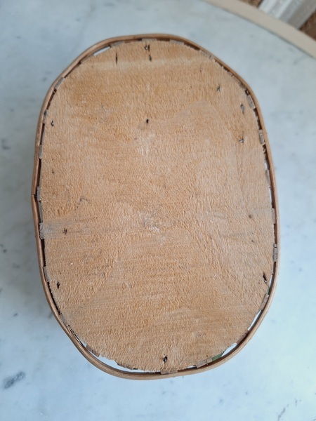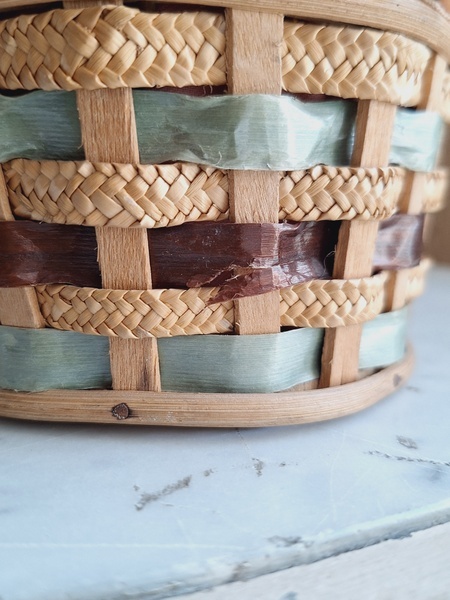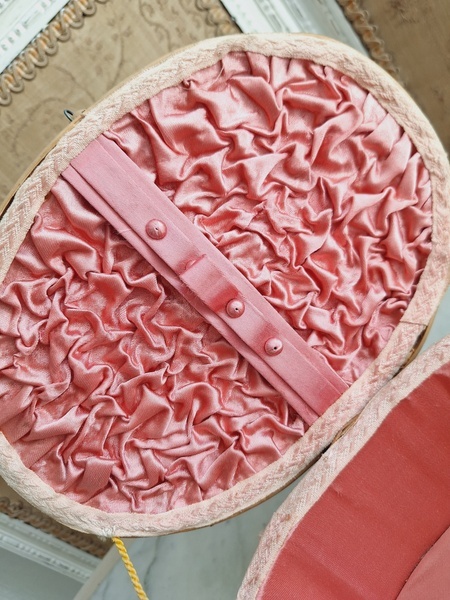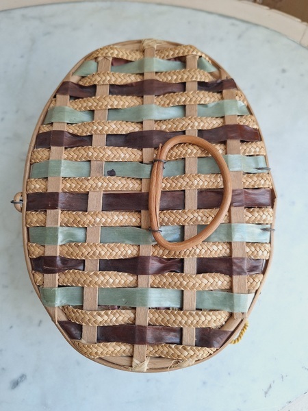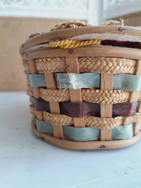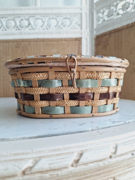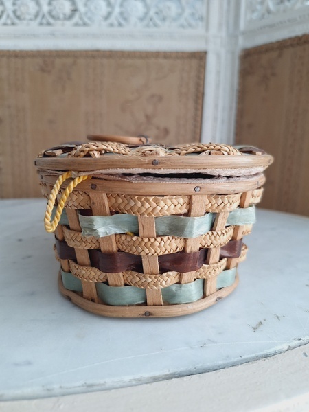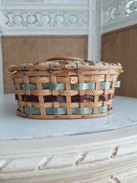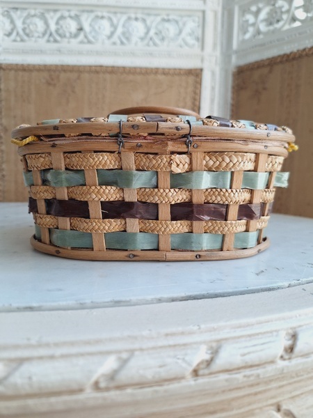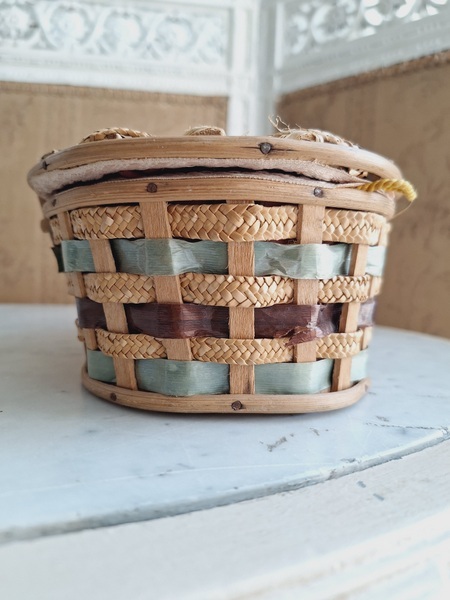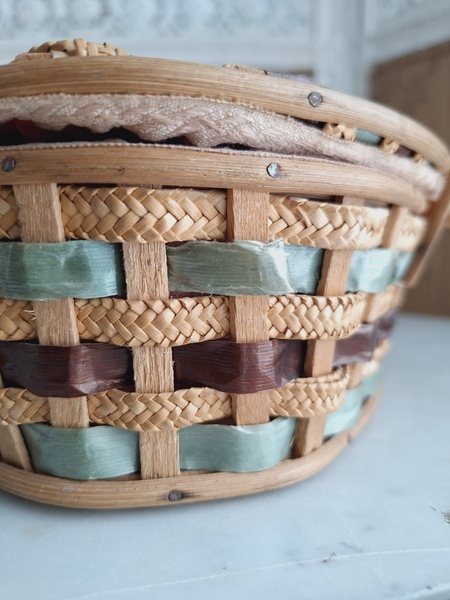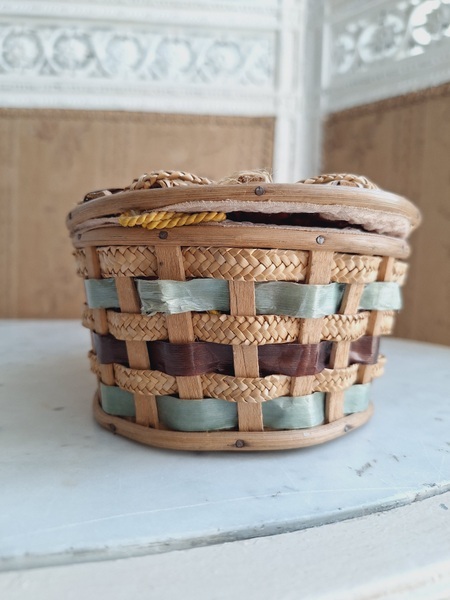 ピンククッション付ソーイングバスケットです。籐にブルーとブラウンのバンドの組み合わせが可愛いバスケットです。中は状態の良いクッション付きです。クッション付きのバスケットは内外とも痛んでいる物が多くて買い付け出来る物が少ないのです。若干最後の画像のような小さな痛みはありますが良い状態と思います。フランス/1930-40年代ごろ