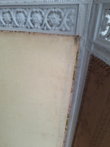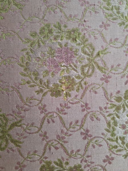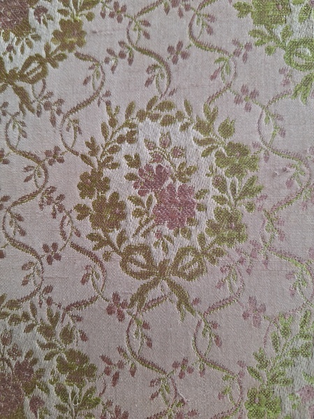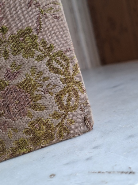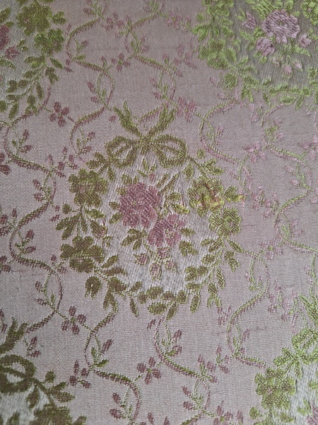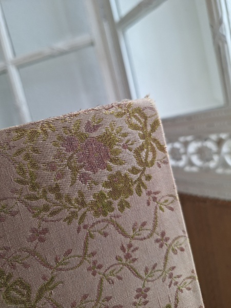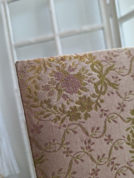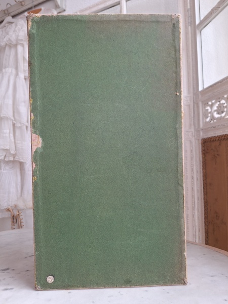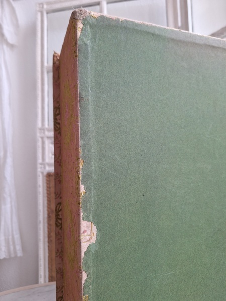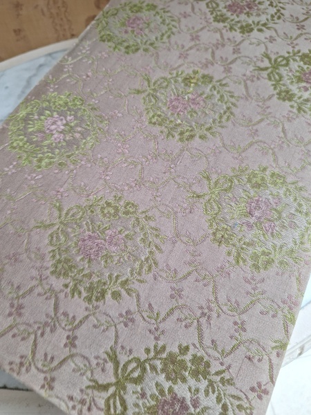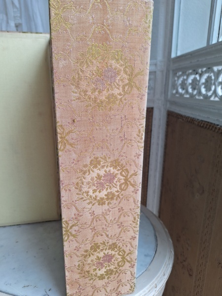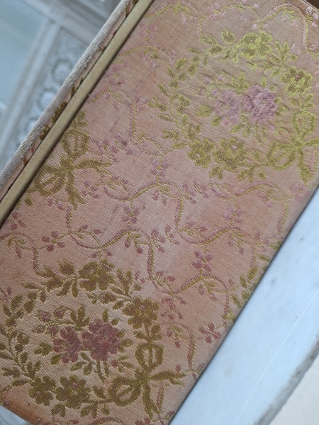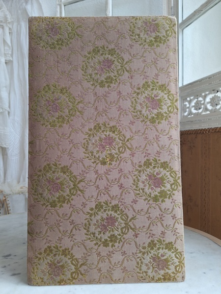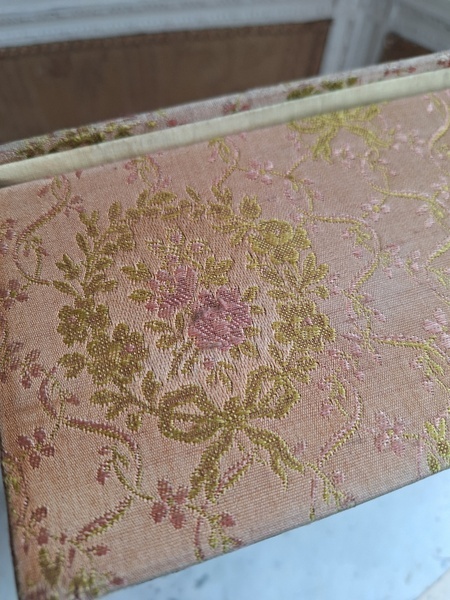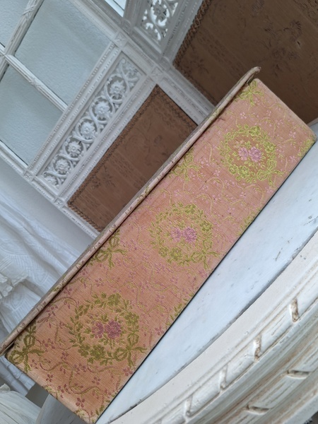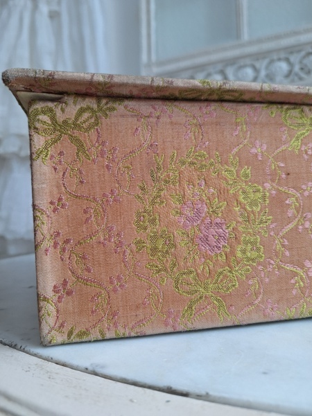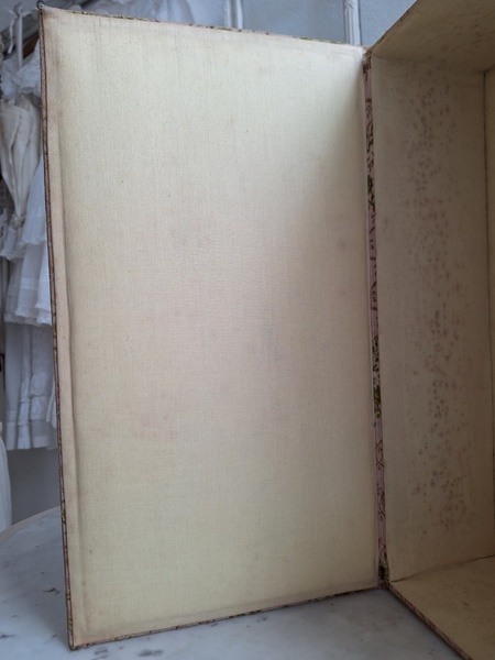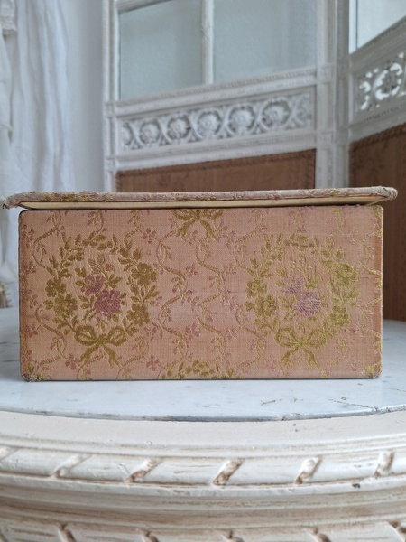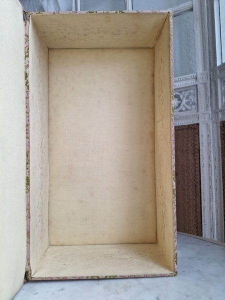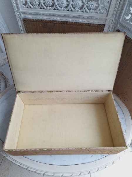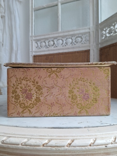 アンティークカルトナージュボックスです。花とリボンのガーランド柄の愛らしい生地が使われています。カーテンのような美しい生地です。側面に若干色褪せはありますがオリジナルがピンクなので目立つ感じは無いと思います。ボックス自体の品質が良く、内側は綿が入ったクッション付きです。生地に色褪せがありますがレースなどでアレンジされても素敵ですよ。品質の良いボックス、中にクッションがあり、大きなサイズなので5キロのお荷物になっています。他の商品と同梱される事をお勧めします。フランス製/1920年代ごろ