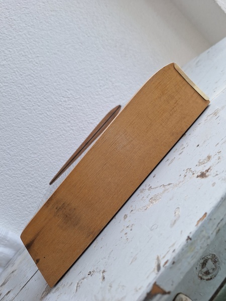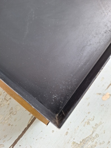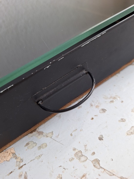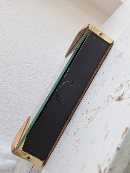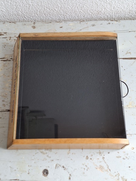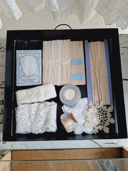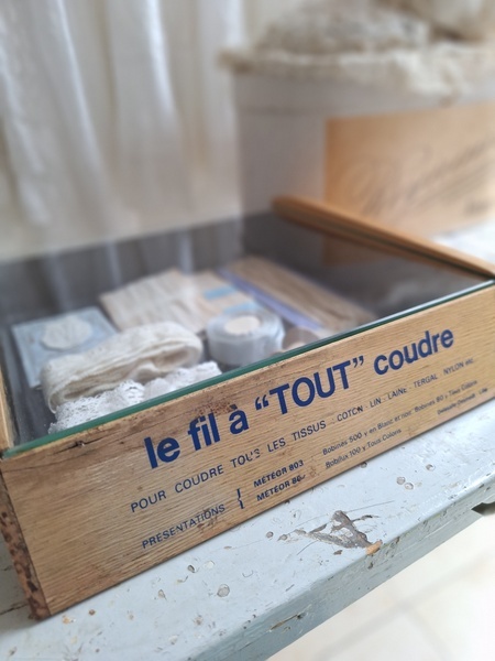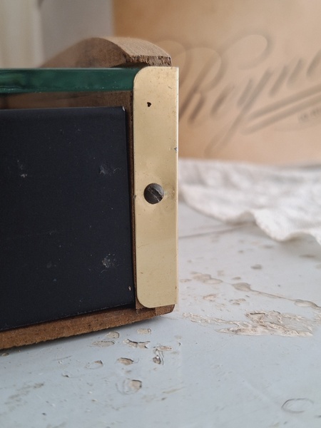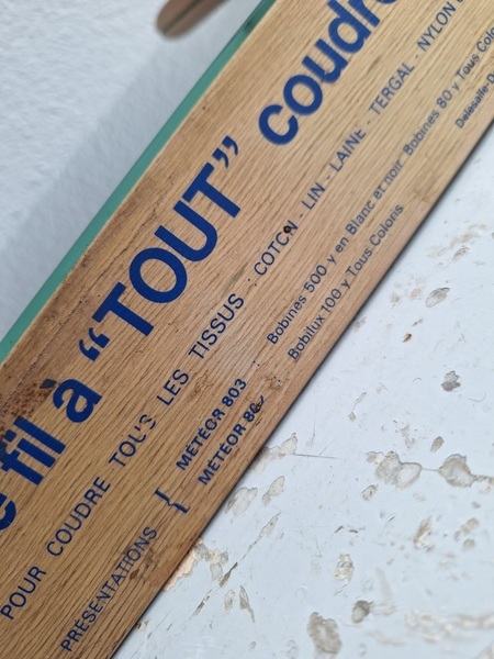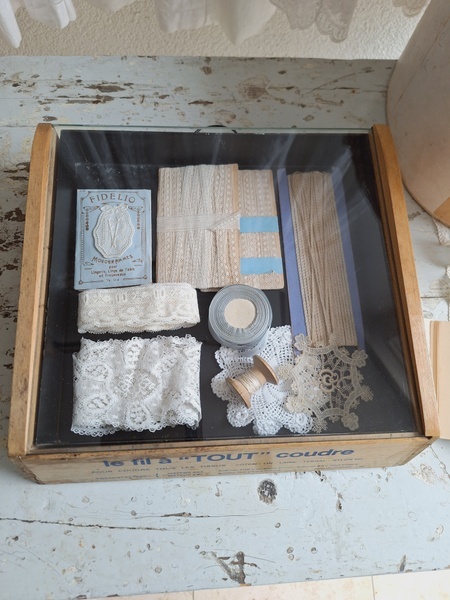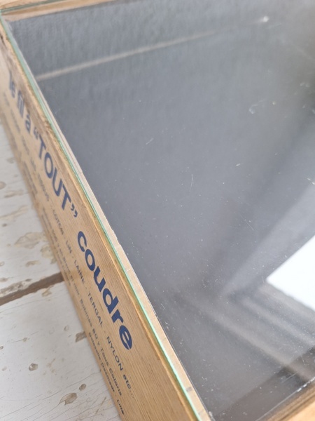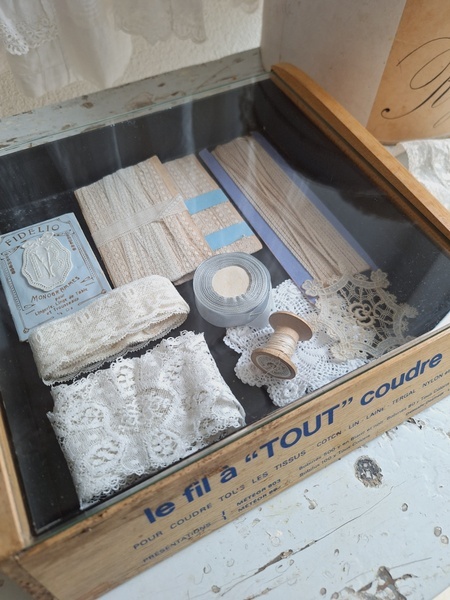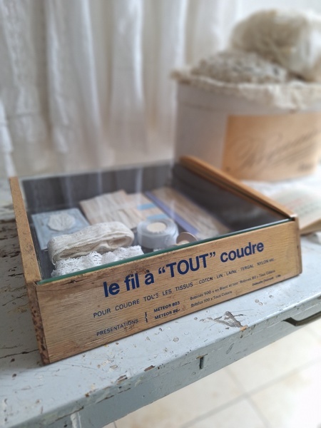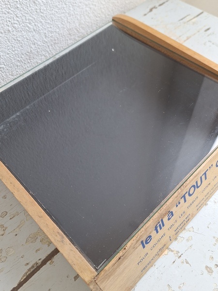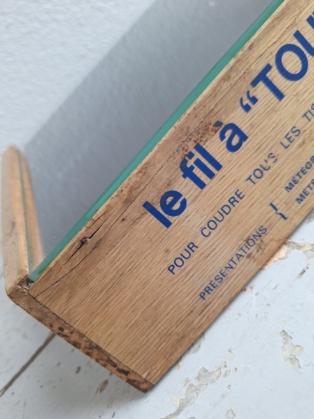 アンティークメルスリーショーケースです。ロゴは”あらゆるものを縫う糸”と書かれていて糸の素材などが記載されています。素材は木製、天板はとても厚いガラス、トレイはブリキです。ブリキの引き出しの下の方はオリジナルから5ミリほど隙間があります。ケースの向かって左の文字の辺りの表面に少しヒビが見られます。ガラスに小さな傷が若干ありますが全体的に良い状態です。何度か見た事があったのですが販売されていなかったり、たかっ買ったりで買い付け出来なかったのですが今回良いご縁がありました。何を入れても素敵にディスプレイ出来ますよ。フランス製/1940-50年代ごろ