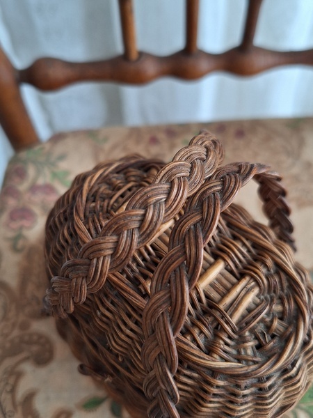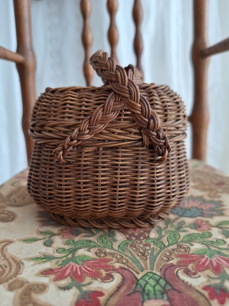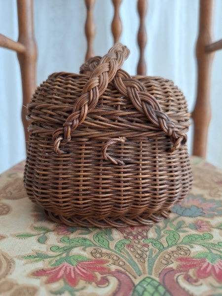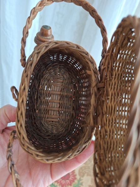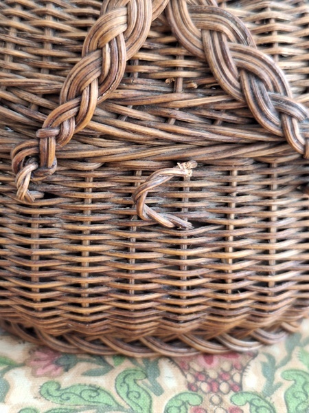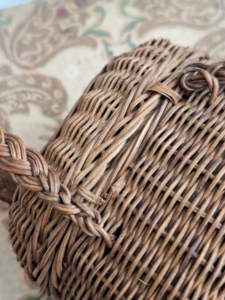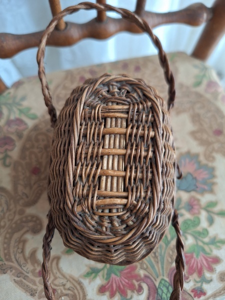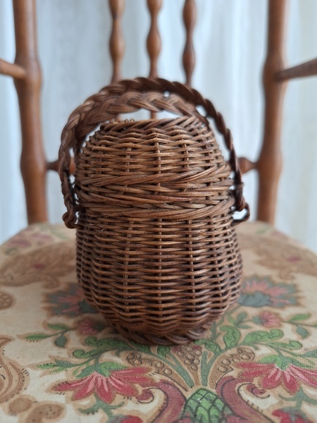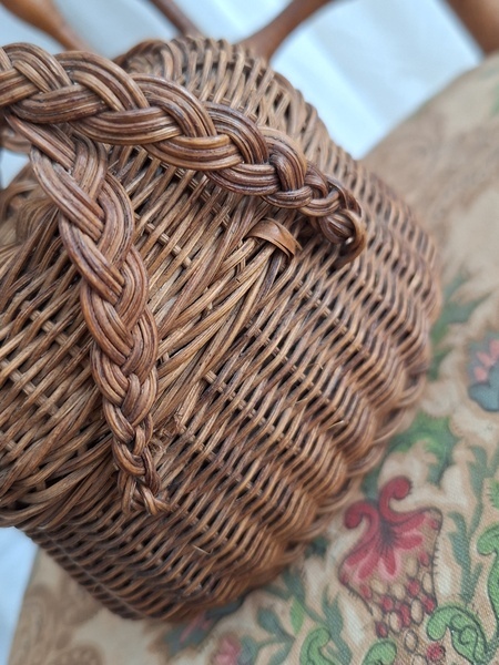 アンティークドールバスケットです。飴色の落ち着いた雰囲気のあるバスケットです。蓋の留め具が紛失、本体の留め具は残っていますが折れています。取れる状態ではないです。留め具は紛失している物が多いです。私は後ろの留め具が付いている物を重視して買い付けしています。このままでも気にならないと思いますが前面はリボンやレース、布花などを付けてアレンジ出来ると思いますよ。フランス/1940年代ごろ