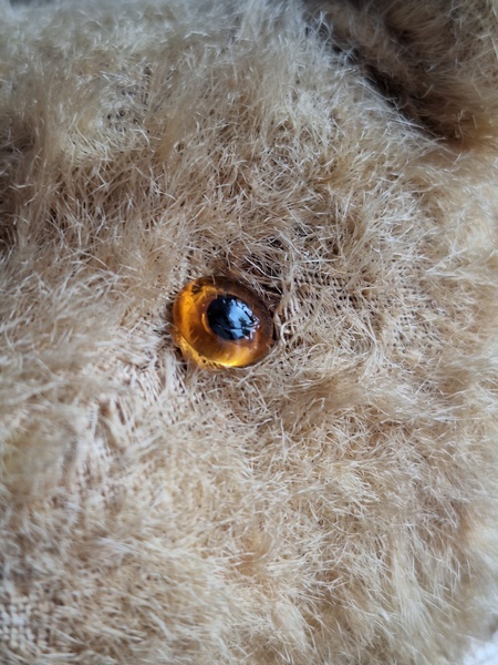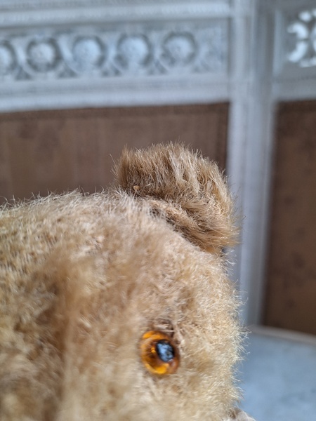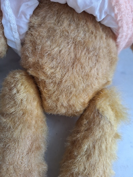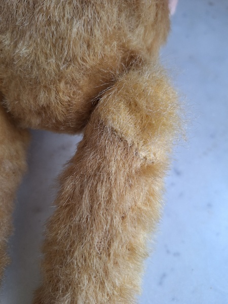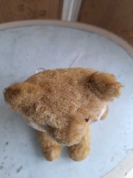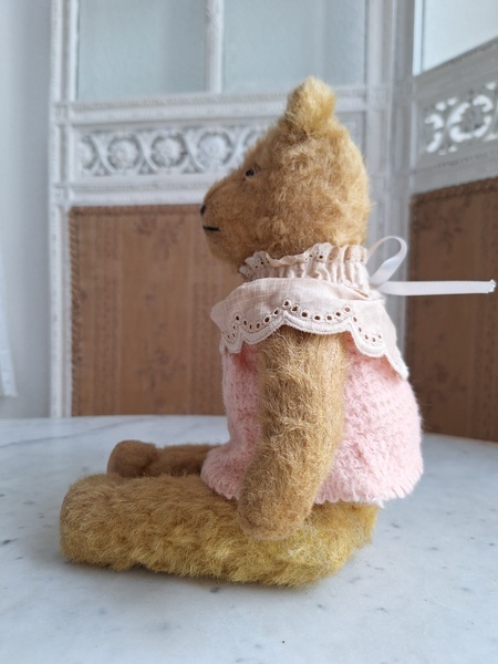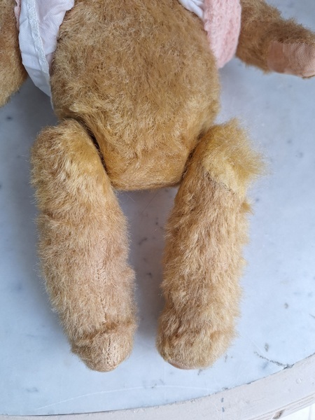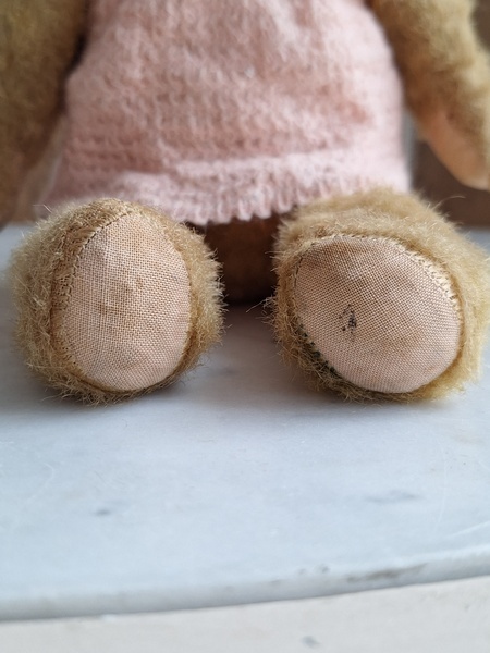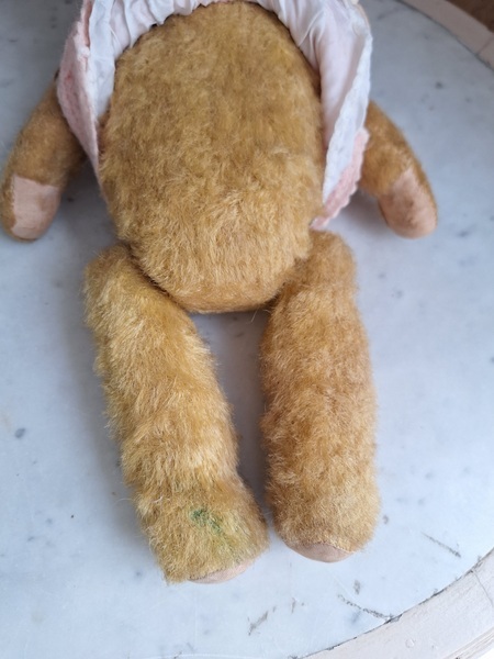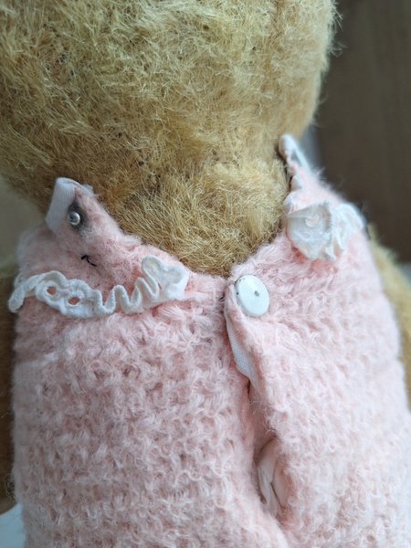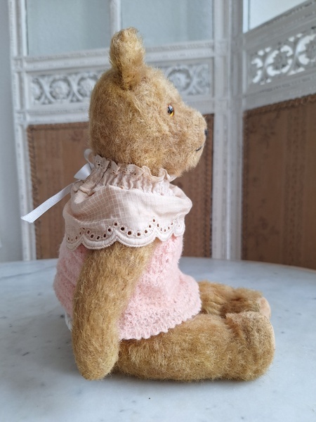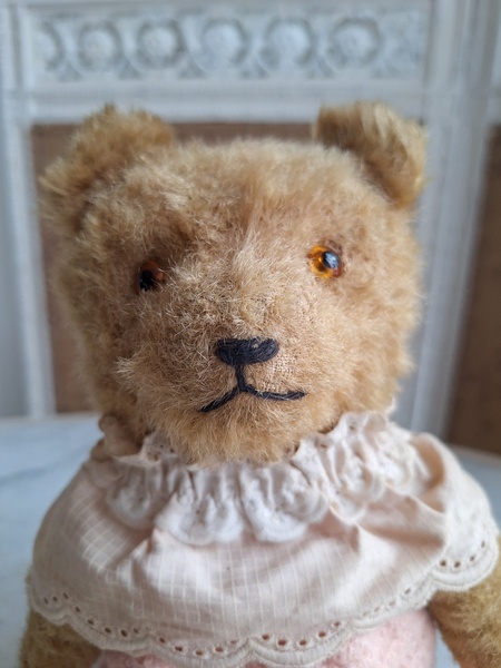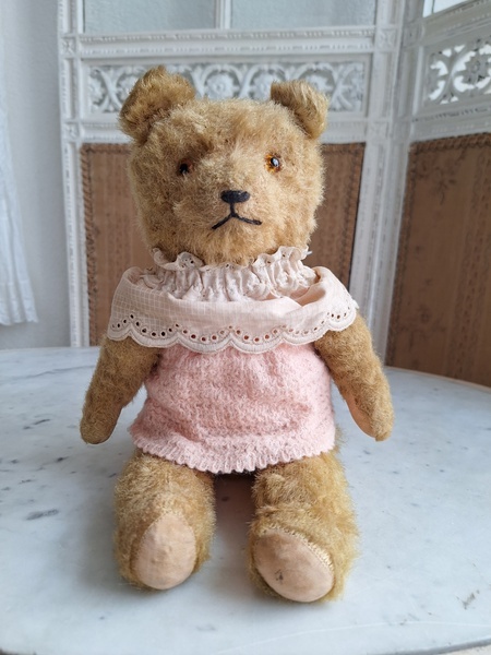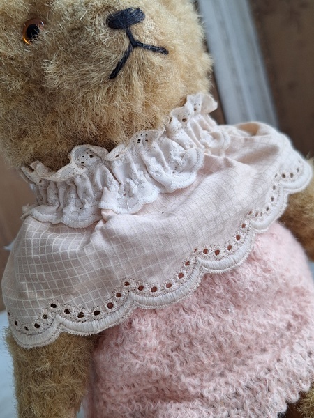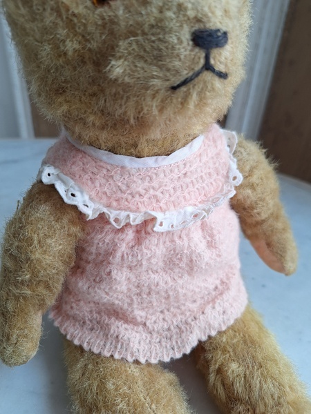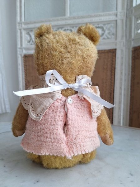 アンティークテディベアです。ヴィンテージのニットと付け襟を身に着けたベアちゃんです。中は藁、目はガラス製、手脚はジョイントで動きます。ベアコレクターさんから仕入れられたパリのディーラー様から譲っていただきました。最後から3枚目の画像の向かって右の脚に補修したように見えているかもしれませんがオリジナルから生地が2パーツ使われているようです。オリジナル時は毛があったので見えなかったようです。あと腕の金具が入っている部分に痛みは見られます。ベアに多い状態です。ご使用にはご心配ありません。付け襟でちょうど隠れていますので気にならないと思います。綺麗なお顔立ちのベアちゃんです。お洋服着せたベアちゃんは可愛いですね。フランス/1950年代ごろ