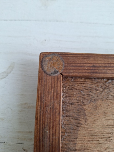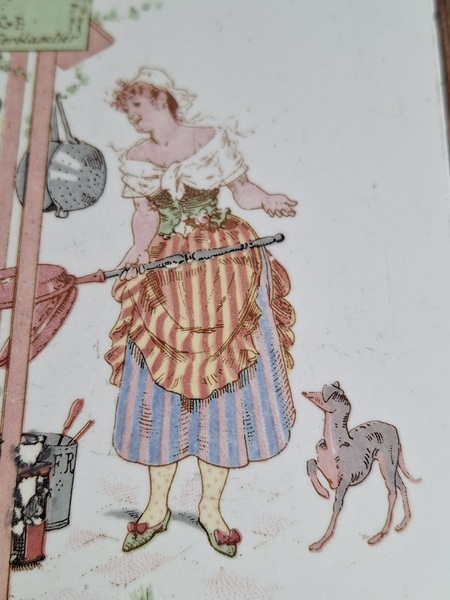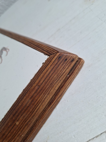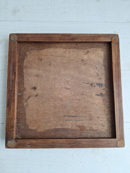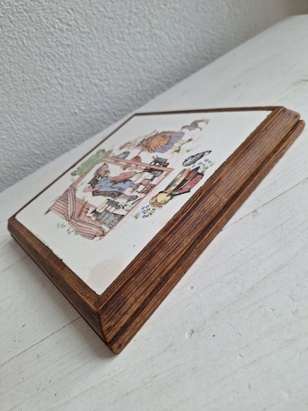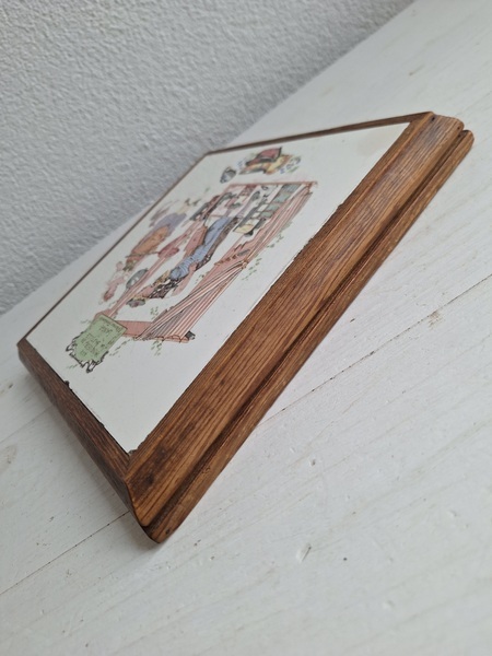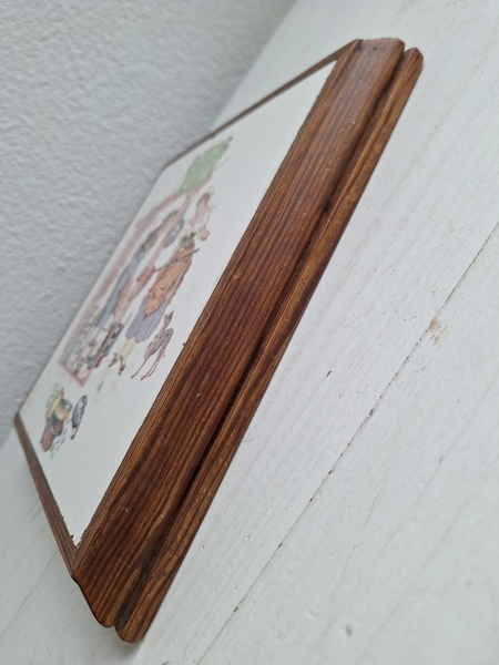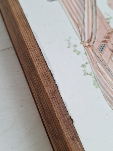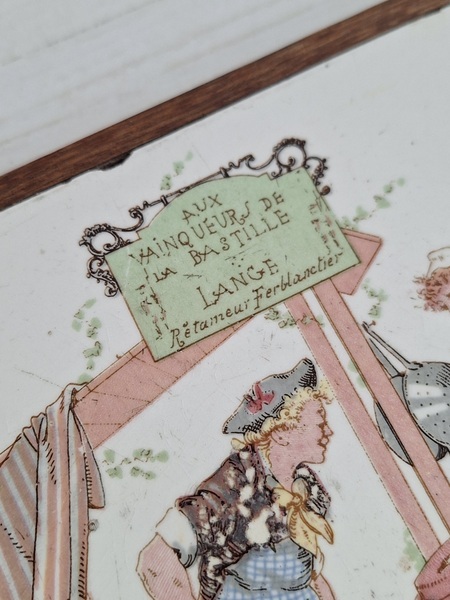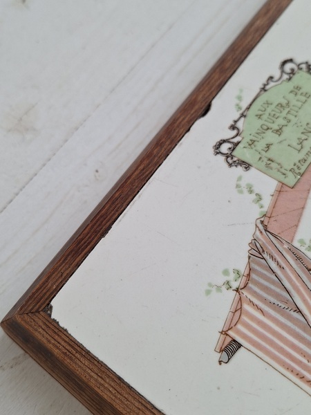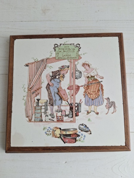 アンファンリシャールトリベットです。木製の枠付きのトリベットです。トリベットの縁に小さなチップがあります枠がありますのでそんなに気になる感じはないと思います。表面に傷等はありますがヒビがありません。古い雰囲気がお好きな方ですと良い感じの状態と思います。裏に滑り止めのフェルトパットを付けられています。フランス製/1900年初頭