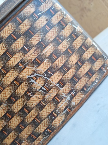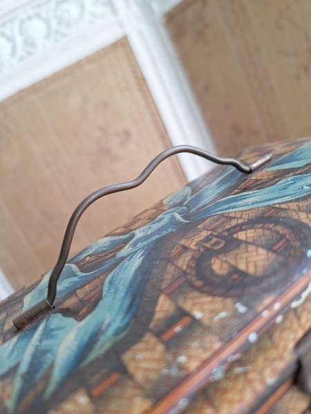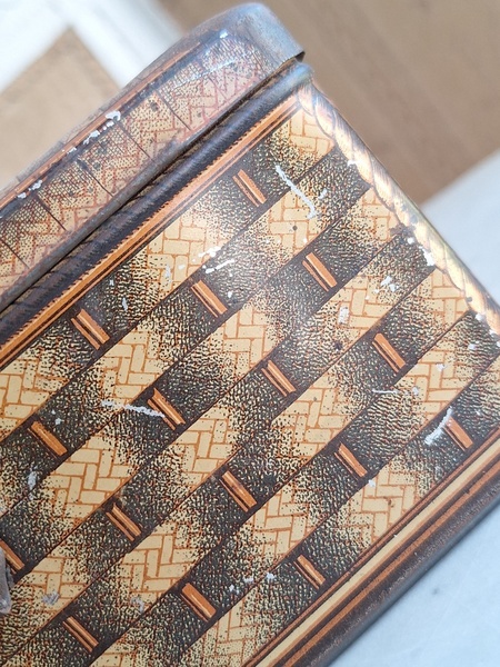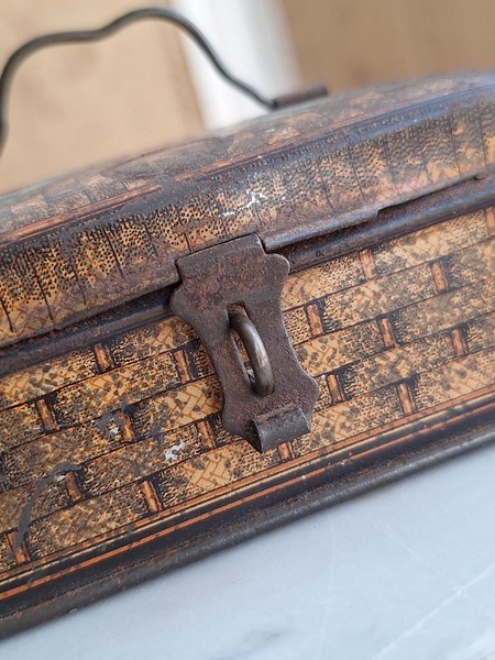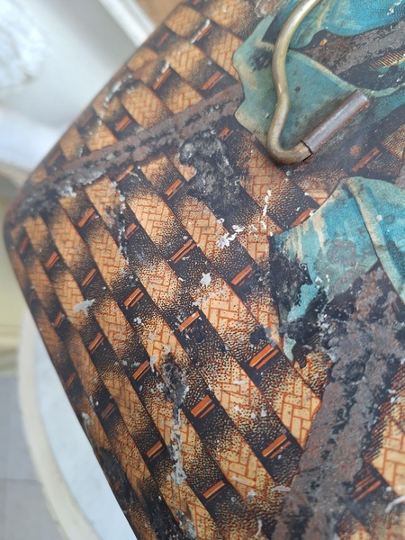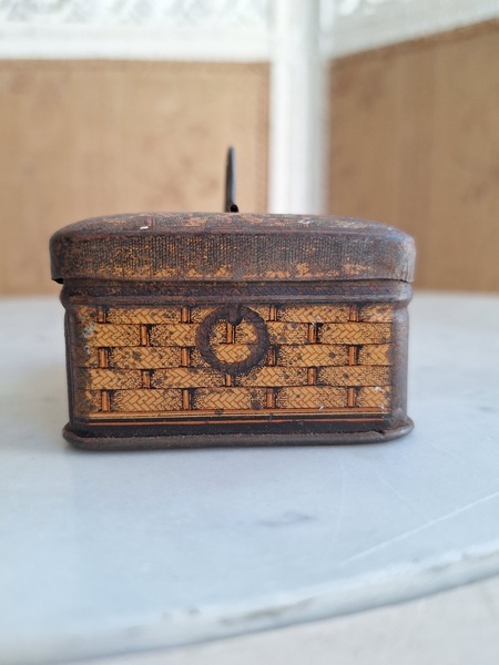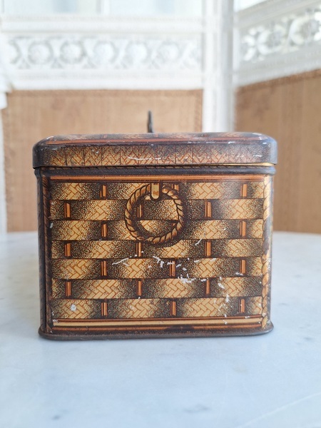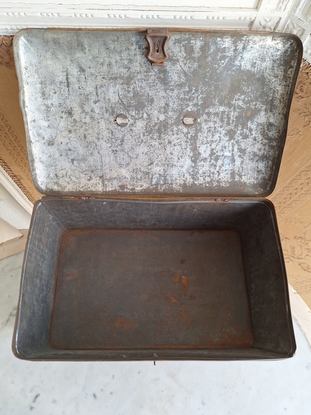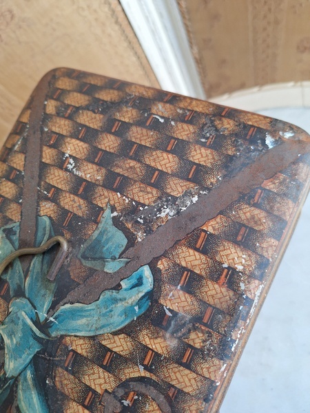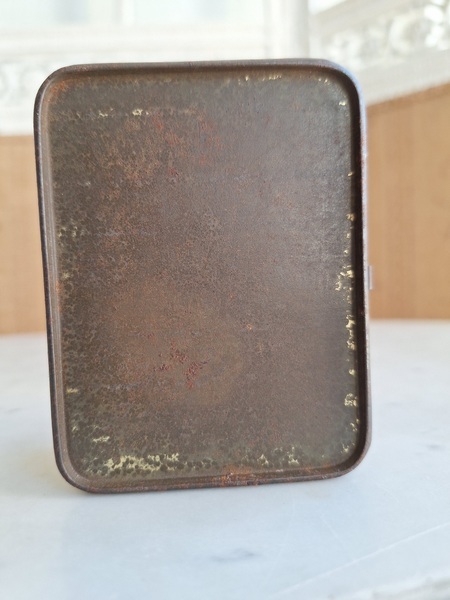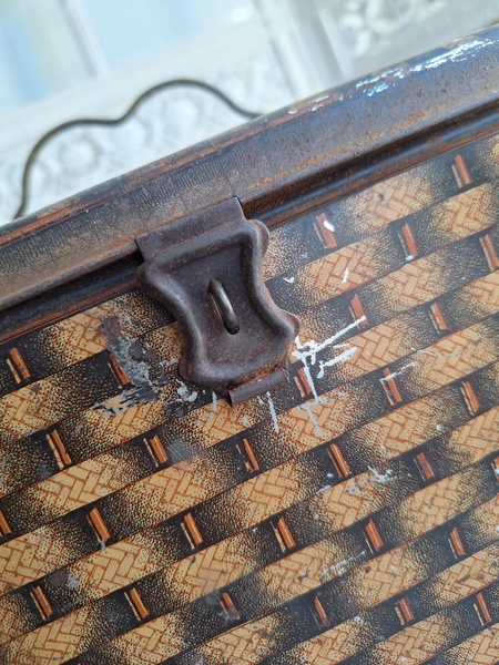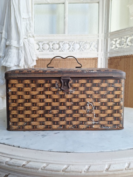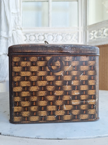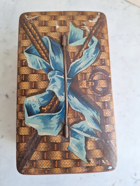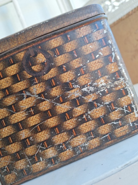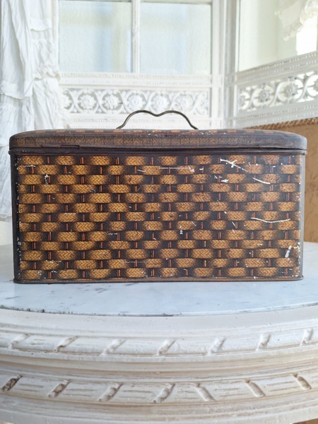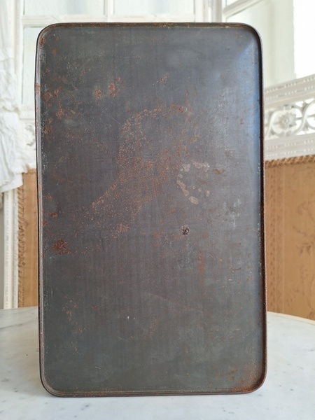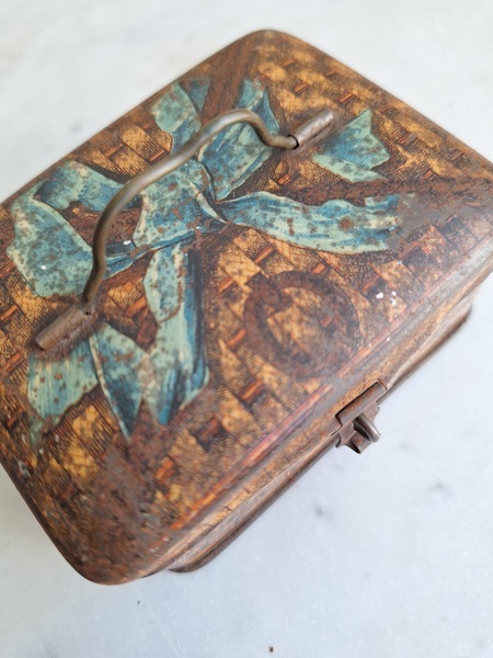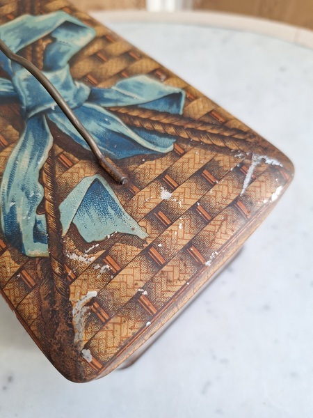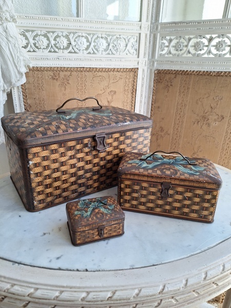 リボン柄ブリキバスケットです。大きなリボンが印象的なブリキのバスケットです。サイズは3種あります。別売りさせていたただきます。小さめのサイズはドールやベアと飾っても可愛いですよ。大きなサイズは床に置いたり、シェルフに飾られても存在感があります。この大きなサイズは初めて見ました。雰囲気が変わらないようさび付きがありますので簡単にふき取りしてお手入れはしていますが錆が気になる方はクリーナーなどでお手入れください。3点セットで購入しなければいけなかったのですがCは蓋に凹みの跡がありますが比較的綺麗に元に戻されています。価格にて調節しています。ブリキ独特の変色、傷、汚れ等あります。ご理解の上、ご注文ください。ベルギー/ヴィンテージ