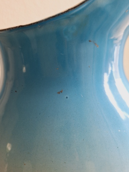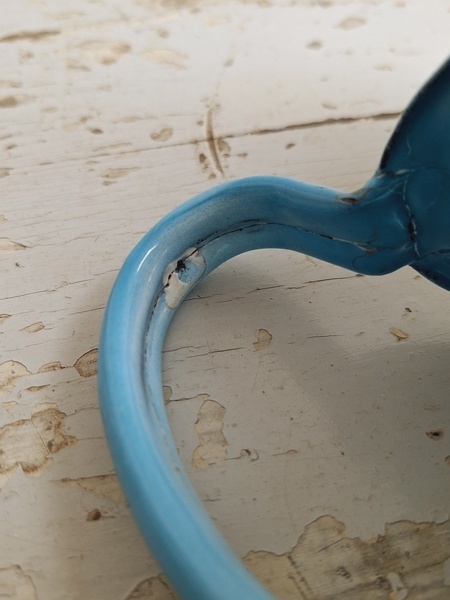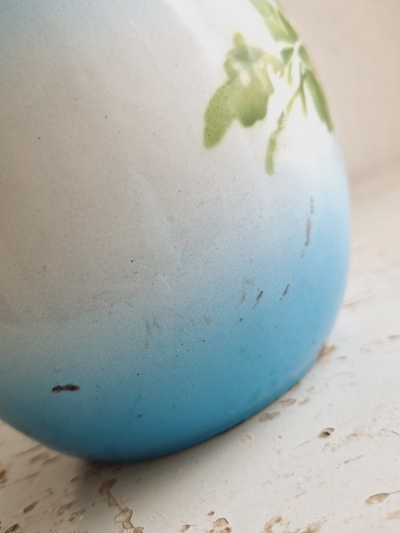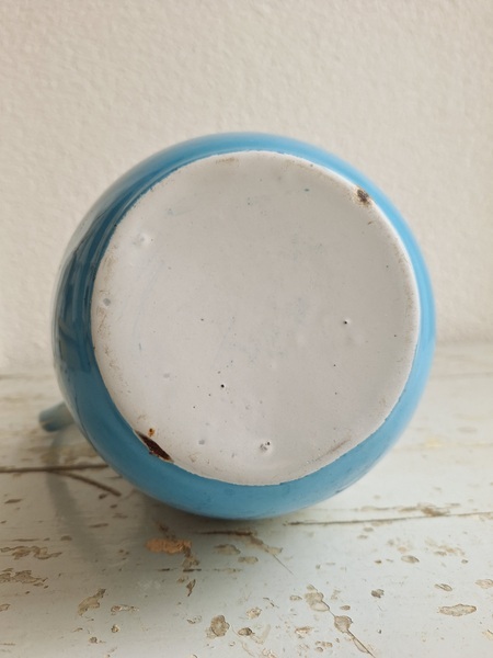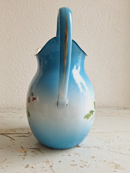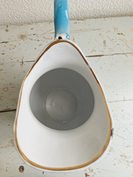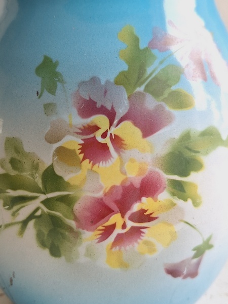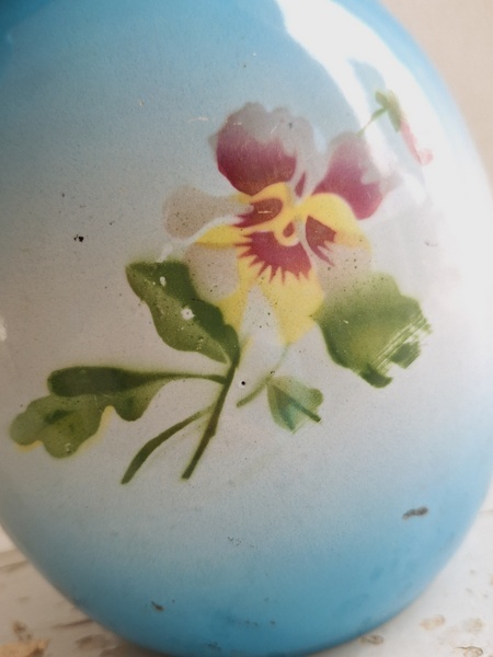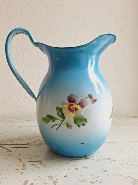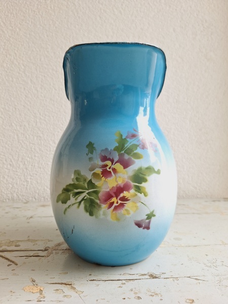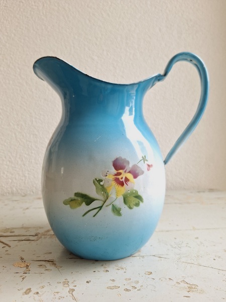パンジー柄ホーローピッチャーです。後ろ面以外は柄が入っています。この形のピッチャーは数が少ないのです。ぽってりフォルムが可愛いですね。艶ががあり、柄が綺麗に残っていてホーローの大きな欠けも見られず良い状態と思います。フランス/1940年代ごろ