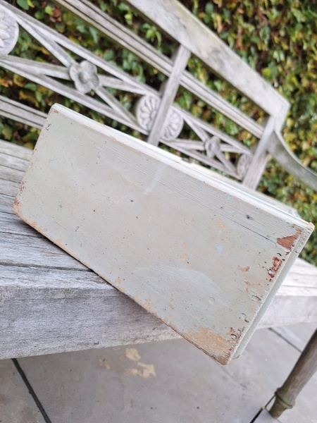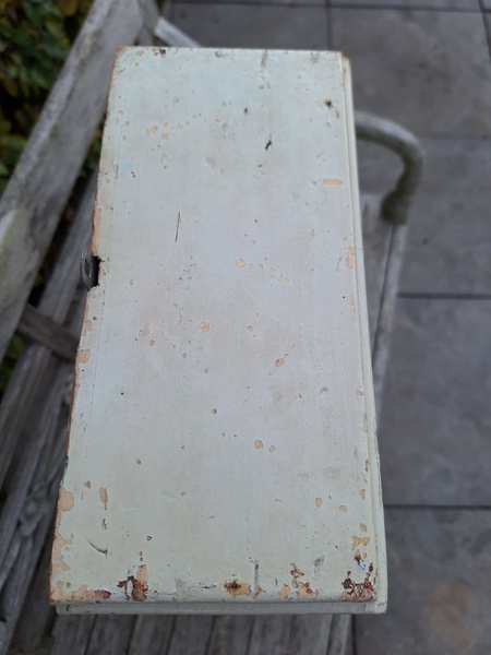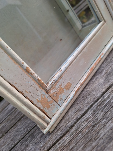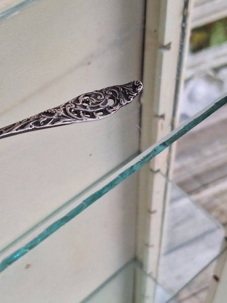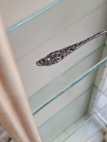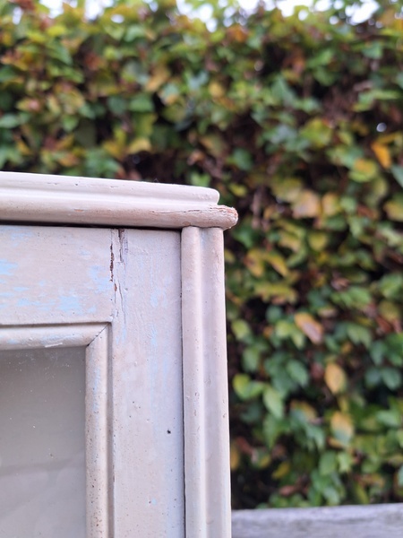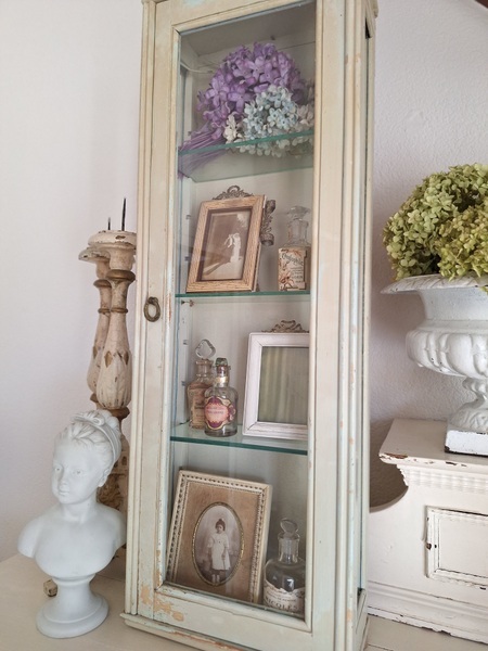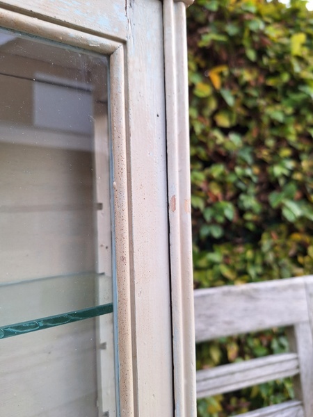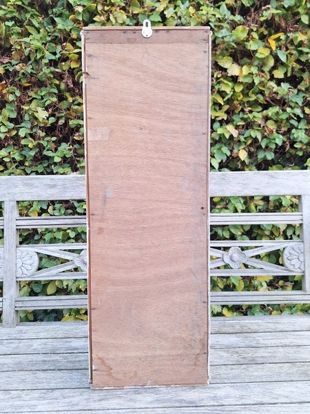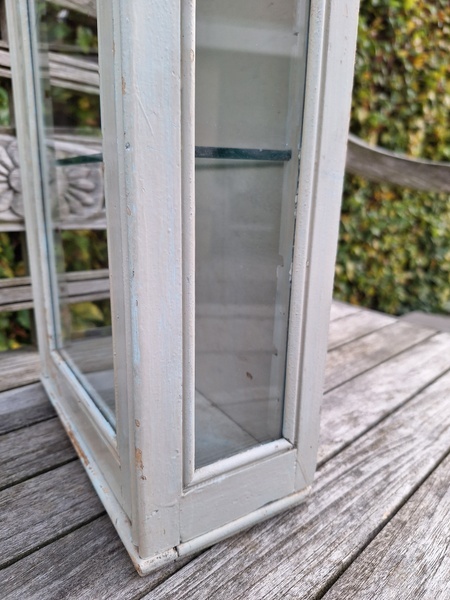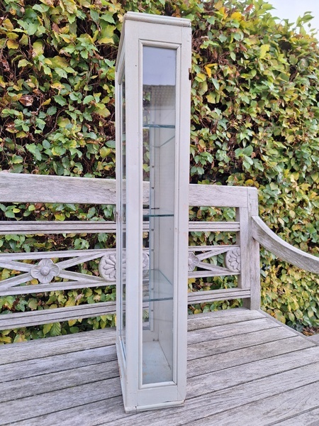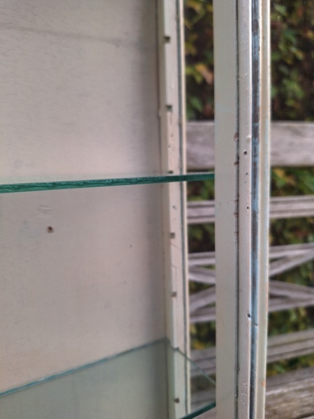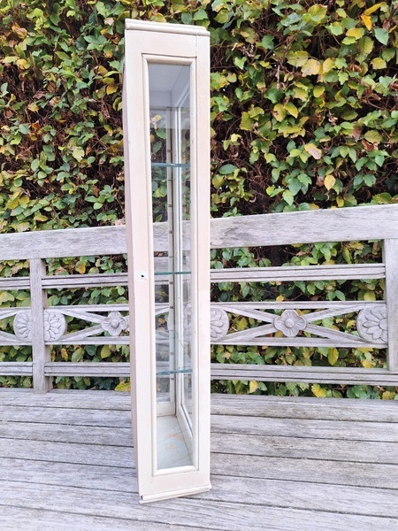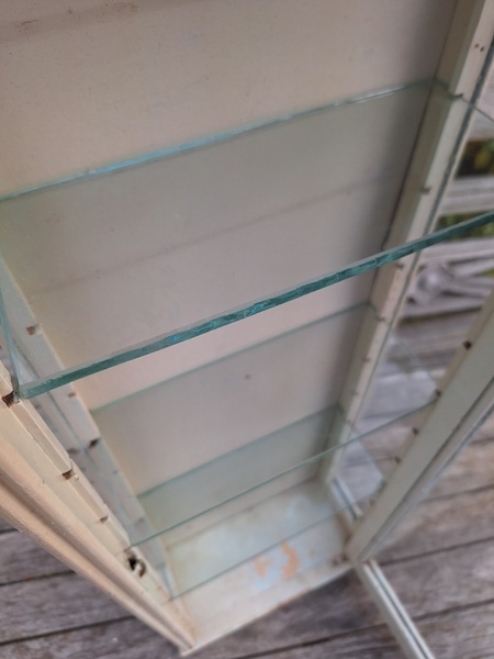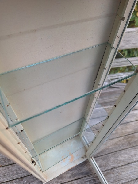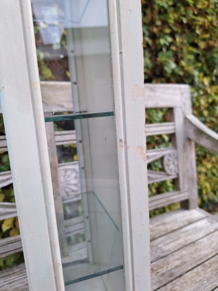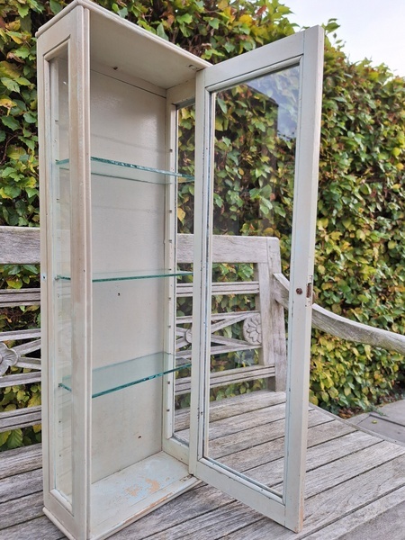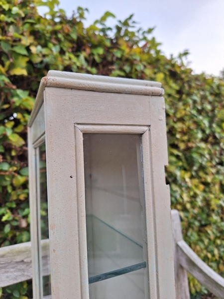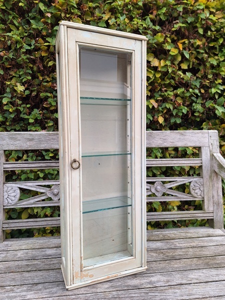 アンティークガラスキャビネットです。個人的にもとっても気に入っていますが小物のコレクションを見せて飾るのに便利です。ペイント感もちょっとシャビ―な雰囲気で良い感じですね。細長なのでもうおうちにスペースが無いと言う方にもちょっとした隙間に掛けていただけると思いますよ。大体、良い状態ですがガラスに傷、使用時の理由で後ろ側の板に小さな穴が空いている箇所があります。ガラス版は固定でサイズ調整が不可です。それぞれ高さが17,16,16,19センチまでの物は置けます。ご覧のように香水瓶やフォトスタンドなど置いていただけますよ。奥行と幅は下記からサイズをご参考になさってください。重さは4キロあります。上にフックがありこの状態で掛けられてたようですが、L字型のフックを下に2箇所固定して壁に設置されるとより安心だと思います。フランス/1940年代ごろ