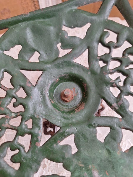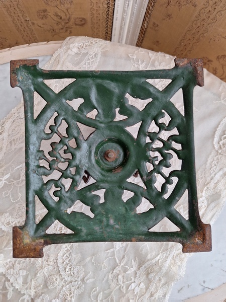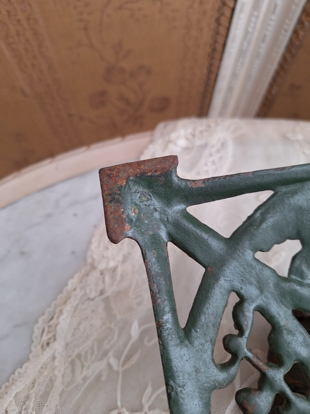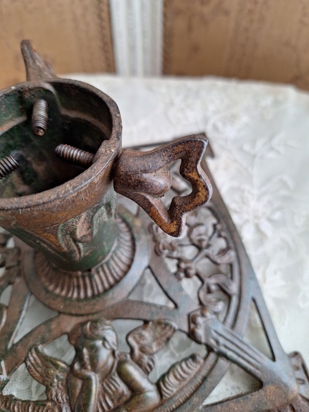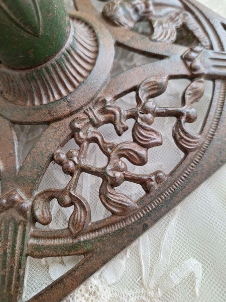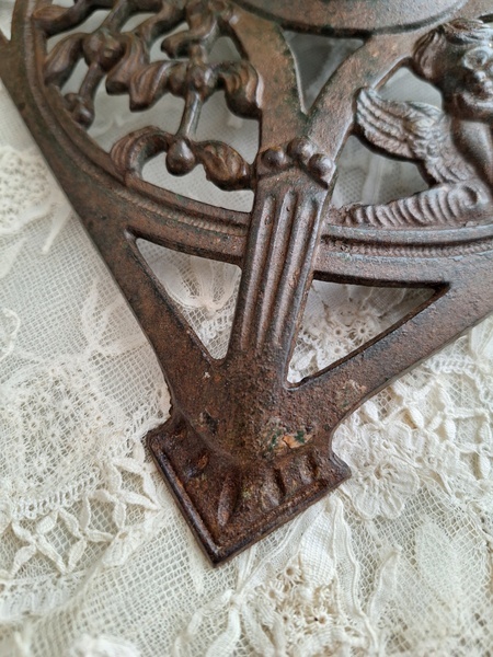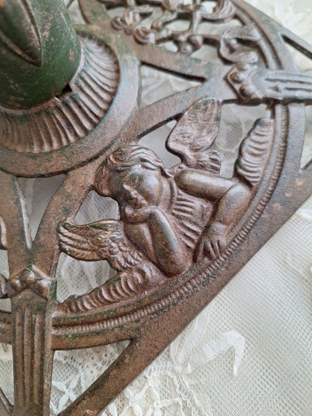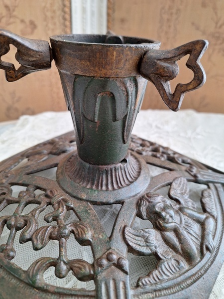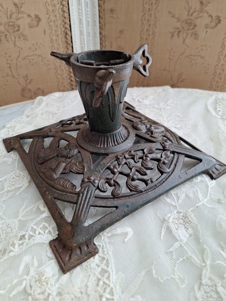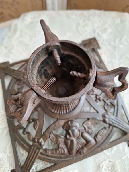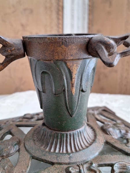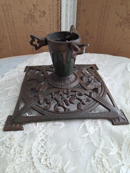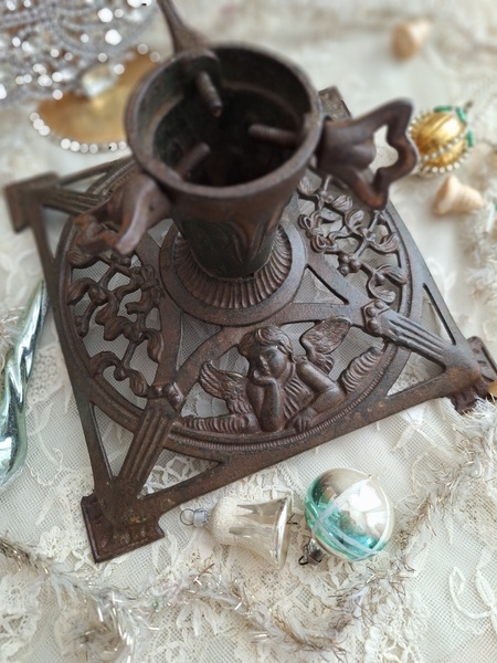 アイアン製クリスマスツリースタンドです。天使とヤドリギの透かしが美しいツリースタンドです。ツリーを差し込む箇所の直径は5センチです。スタンド自体は1.6キロあります。最近は日本でも本物のもみの木を飾れる方も増えたようですね。このままテーブルの上などでガラスのオーナメントなどと飾られても素敵ですよ。ドイツ/1950年代ごろ