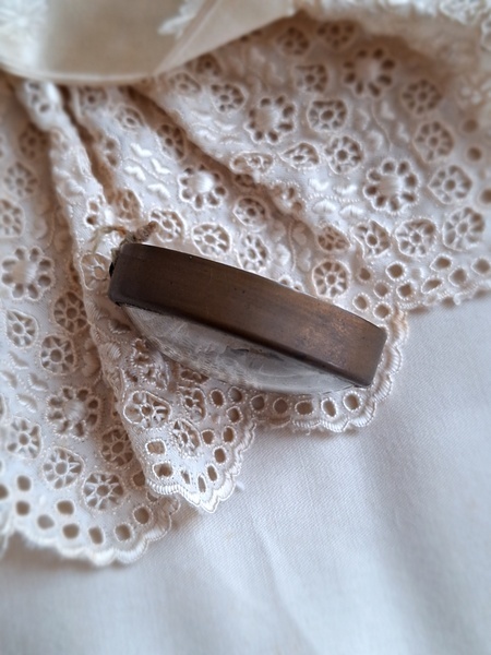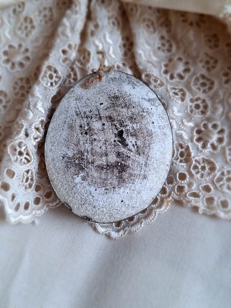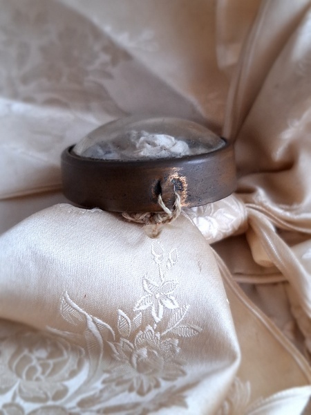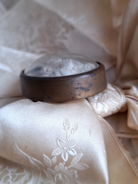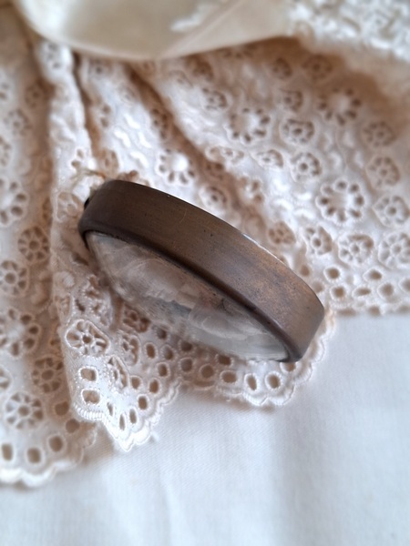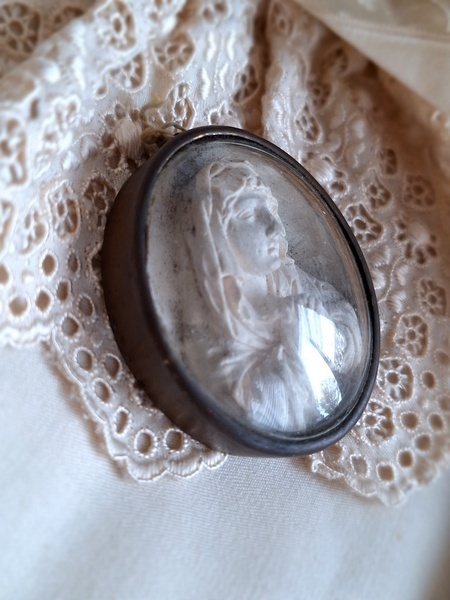 アンティークマリア小さなメダイヨンです。優しいマリア様のお顔に惹かれて買い付けしました。手のひらにすっぽり入る小さなサイズですが木製のフレームの大きなメダイヨンと同じくらいの価格で販売されています。こちらのようなボウルガラスのメダイヨンは状態の良い物はもうほとんどなく、とても高いかこちらのような埃が入っている物が多くなっています。上のリングが紛失していますがリングなどを付けていただくのも良いですが古いレースやリボンを通された方が素敵かもしれません。こちらも内側に埃は見られますが100年以上前の物として考えると良い状態です。フランス製/1900年初頭