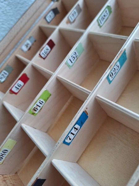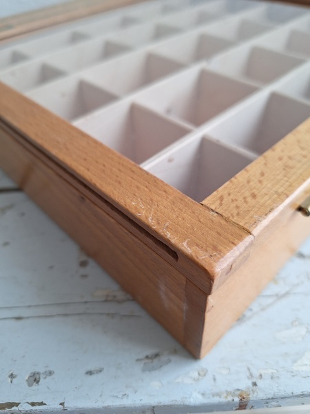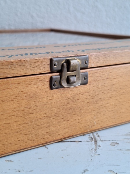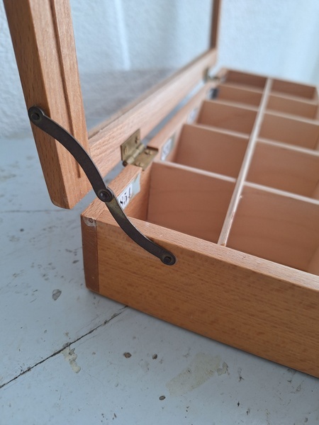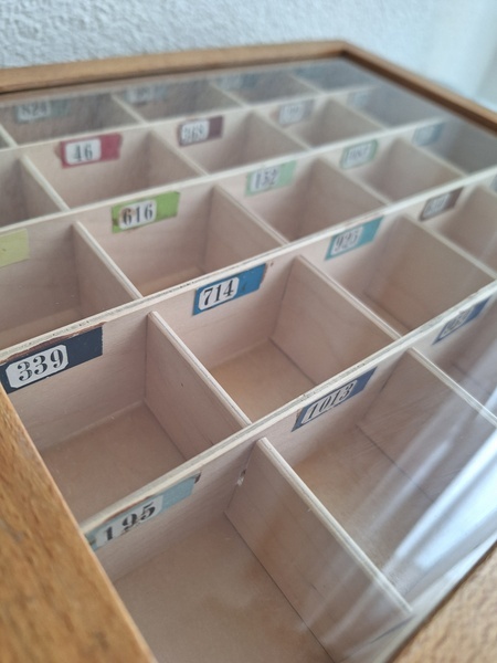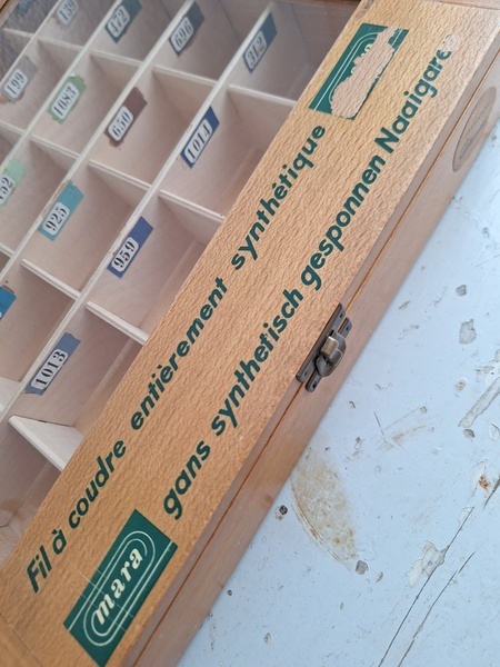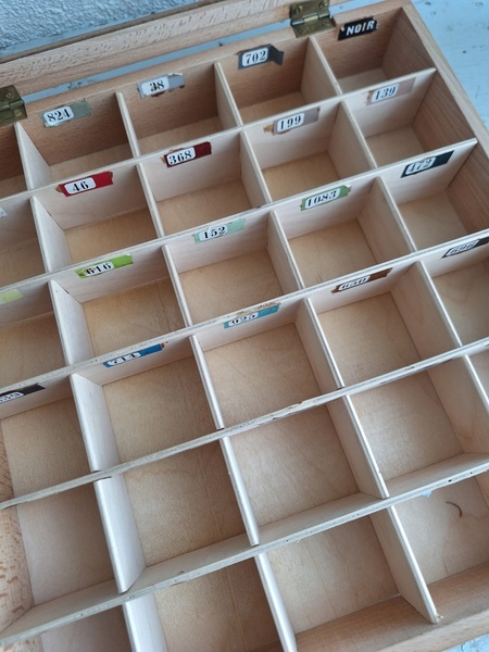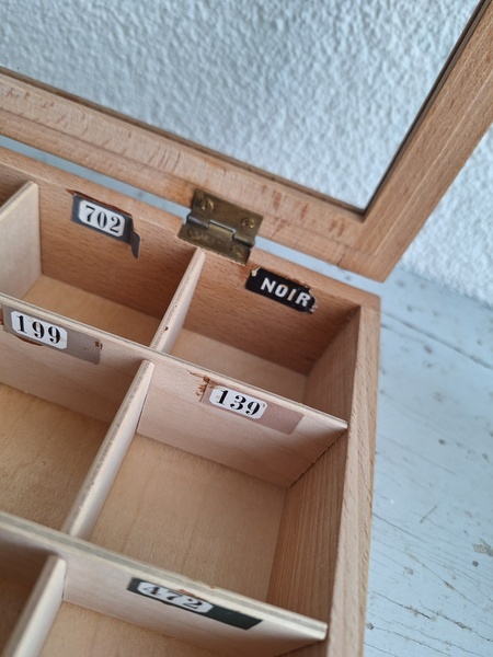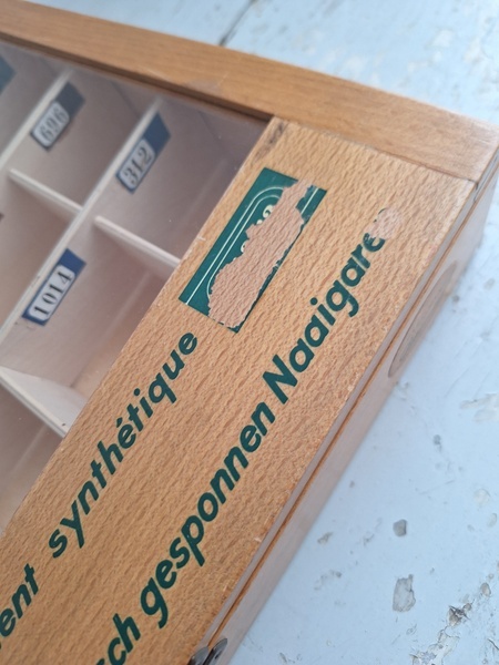 ギッターマンスプールケースです。フランス語とオランダ語記載があるのでベルギーで使用されていたケースのようです。ギッターマンのケースだと通常4段、6段くらいの物が多いのですがこちらのようなケースは珍しいです。アクセサリーなどの小物の整理にも便利です。仕切りが外せるかと言うお問い合わせがよくあるのですが完全に固定されている感じはないので比較的取りやすい感じです。ドイツ製/ヴィンテージ