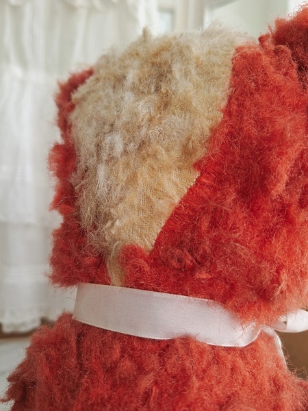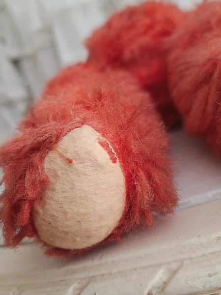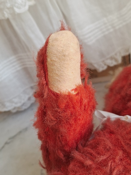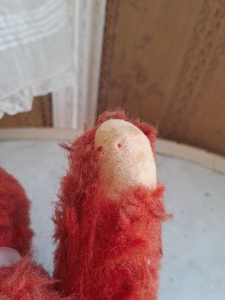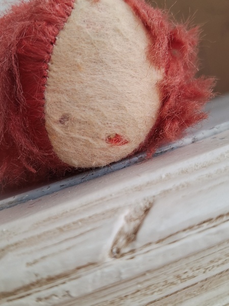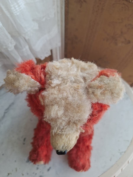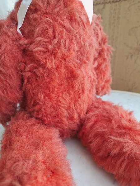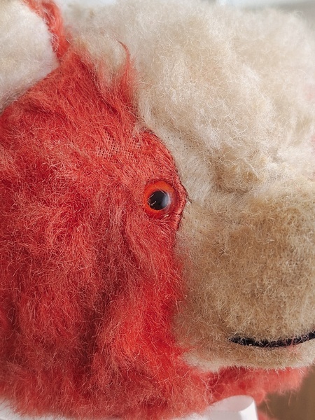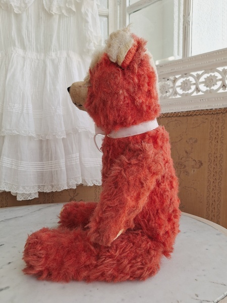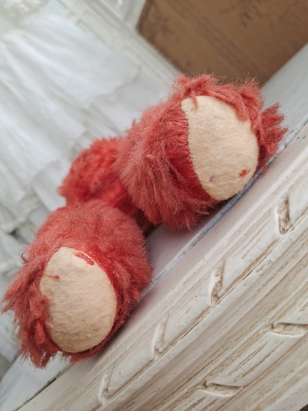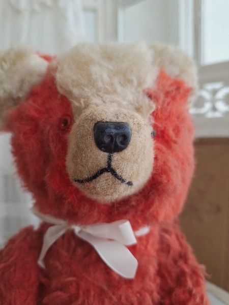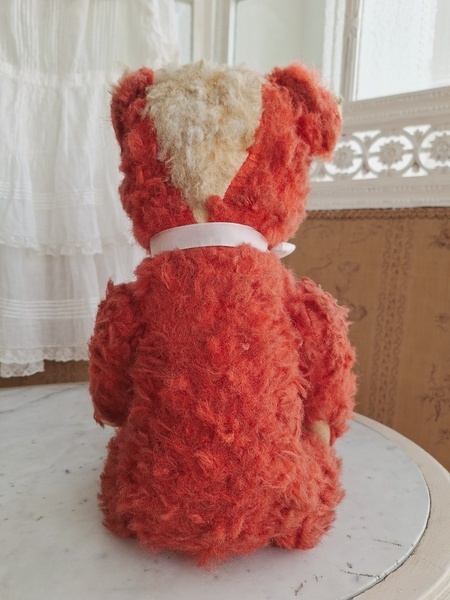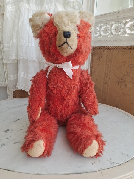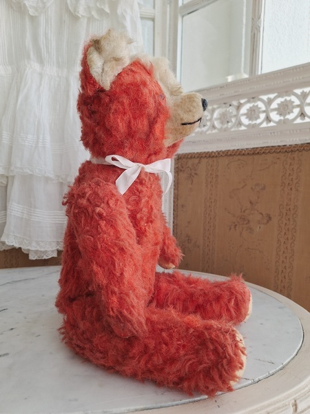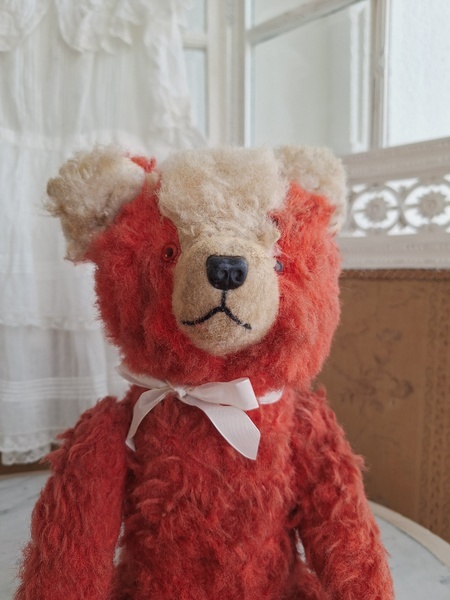アンティークレッドテディベアです。ピンクやブルーよりも珍しい赤いテディベアです。経年で少し赤みが薄くなっていますがちょうど良い色合いで可愛いですよ。中は藁、手脚はジョイントで動きます。目はプラスチックアイです。手と脚の裏のフェルトに痛みがありますが造りは赤い生地で仕上げた跡にフェルトの生地を付けられているので藁等が出るようなコンディションではないです。ドイツ/1950年代ごろ
