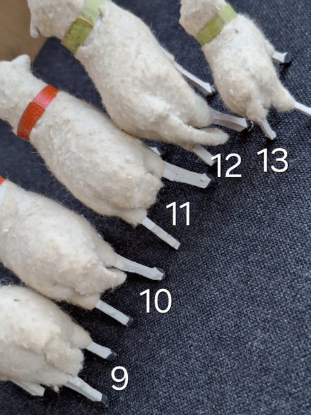 12(ライトグリーン)あごにヒビ、ペイントの剥がれ、向かって左の前足の上あたりに毛の痛み、脚の先にヒビ