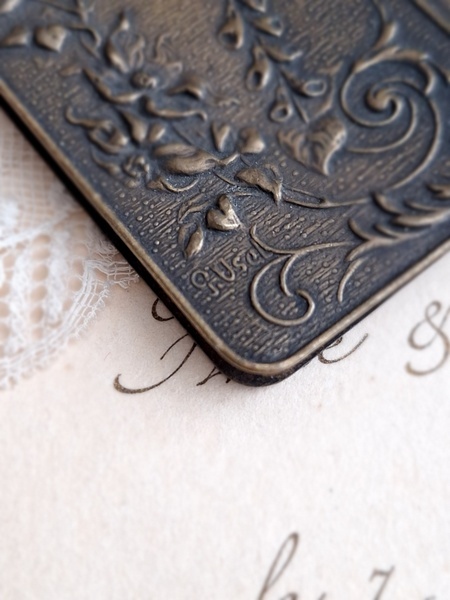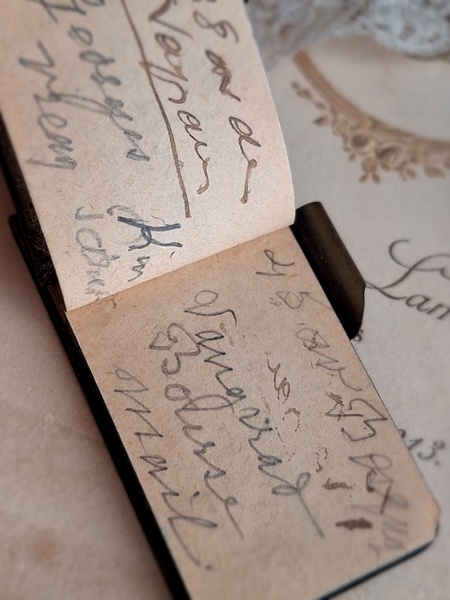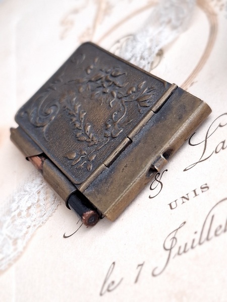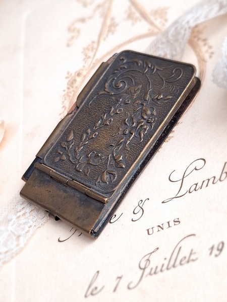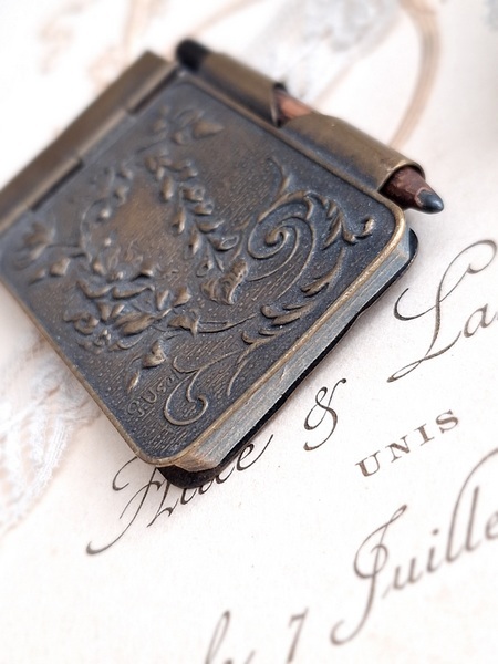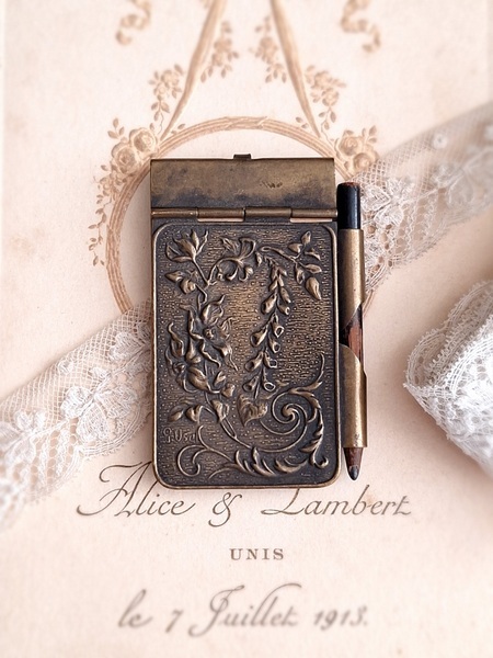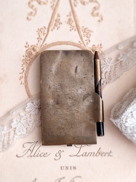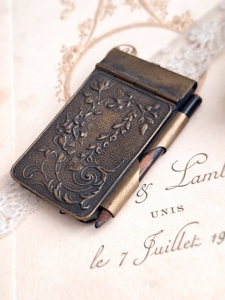 アンティークカルネ・ド・バルです。舞踏会で出会った人の連絡先を記載するのに使われていました。実用されていました。レリーフの素敵な鉛筆付きの物は少ないです。鉛筆が紛失していることが多いアイテムです。時を経て良い雰囲気になっています。フランス製/1940年代ごろ