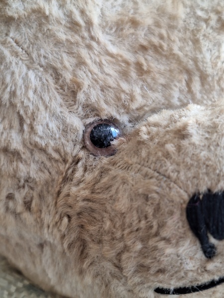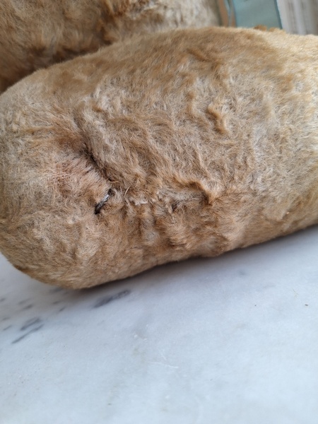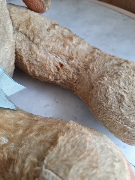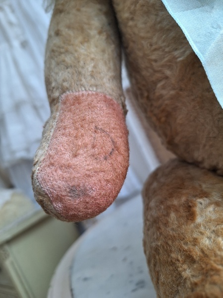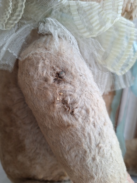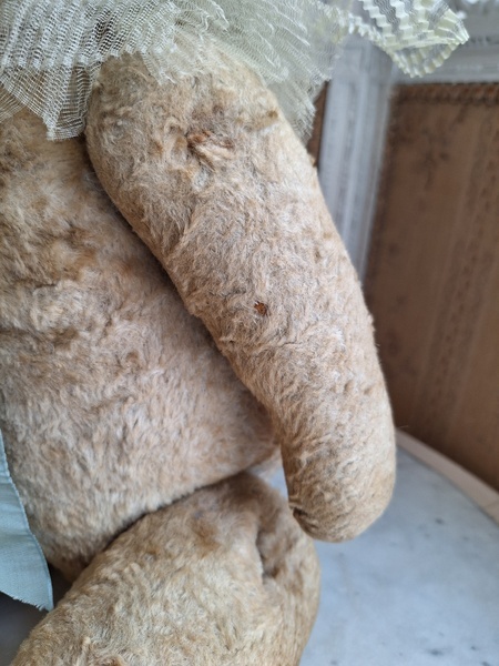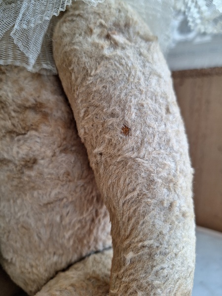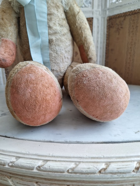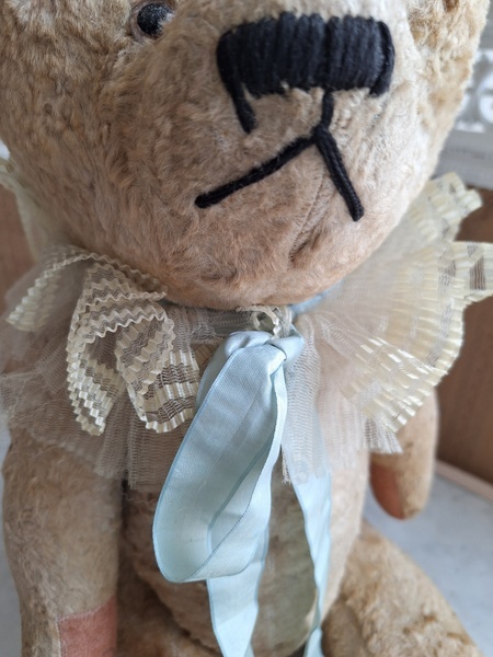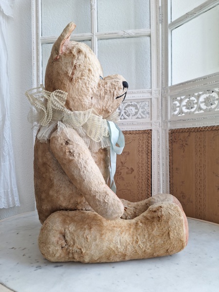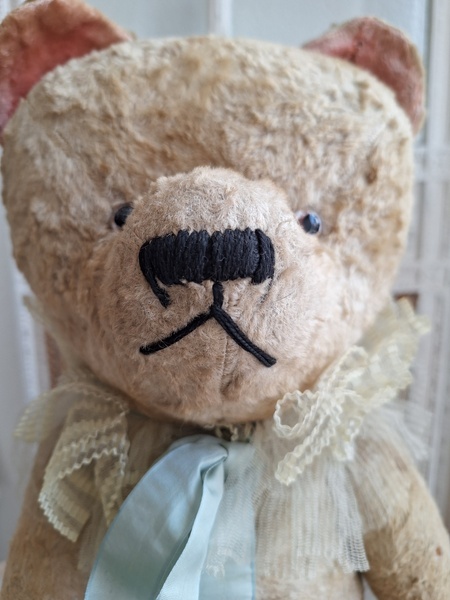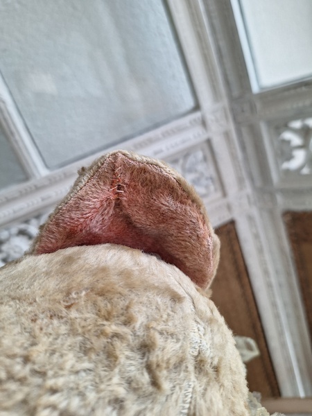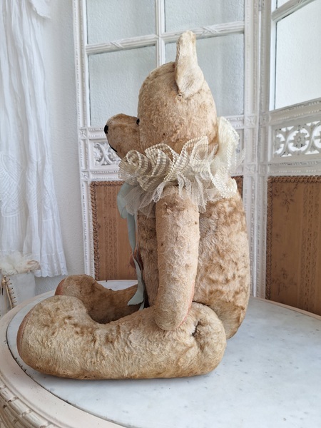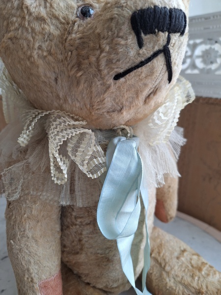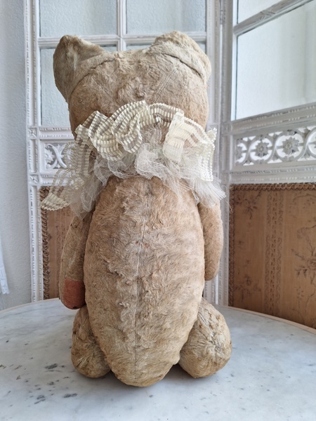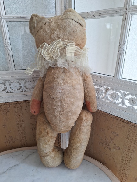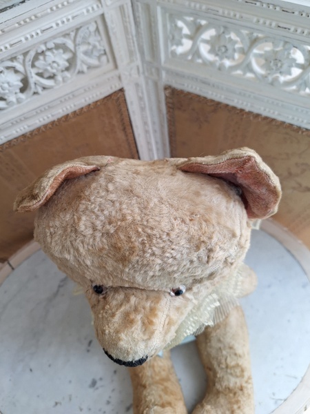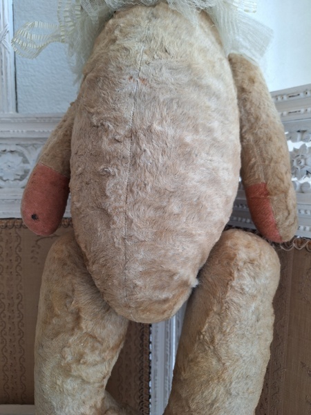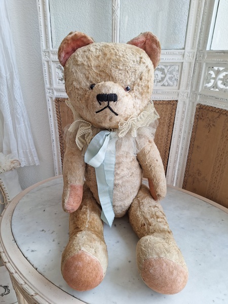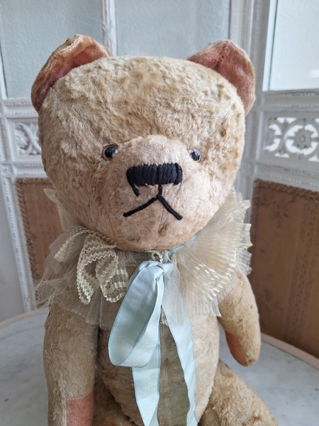 JPMテディベアです。持ち主が大切にされていたようで可愛い付け襟を身に着けています。ピンク生地のお耳と手脚が可愛いですね。目はガラス製、手脚はジョイントで動きます。片方の目の奥に薄いヒビが見られます。アンティークベアに多いコンディションです。鼻と口の刺繍は刺し直されています。他、良い状態です。フランス製/1950年代ごろ