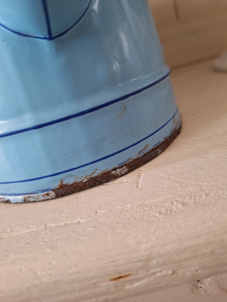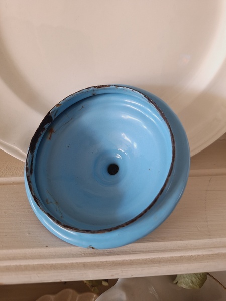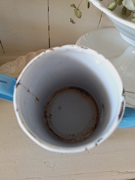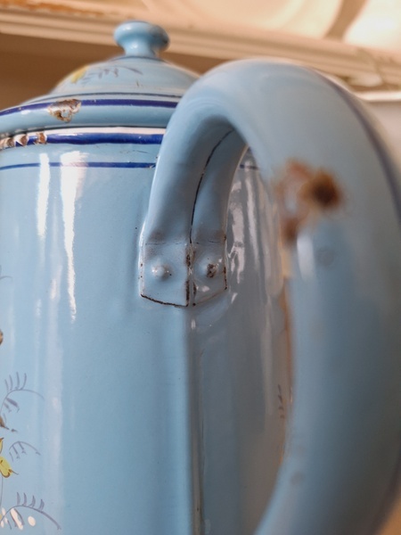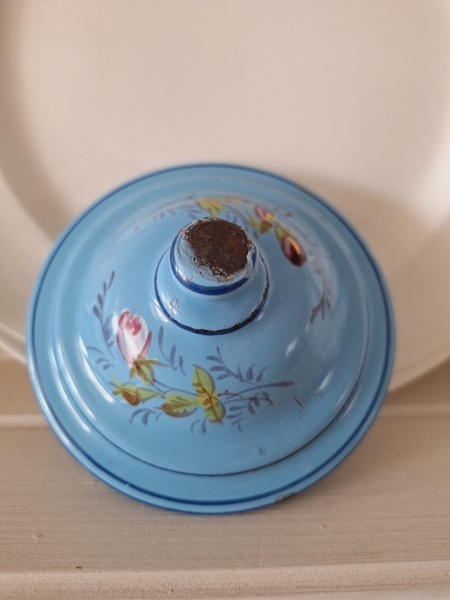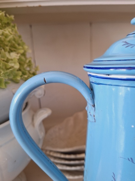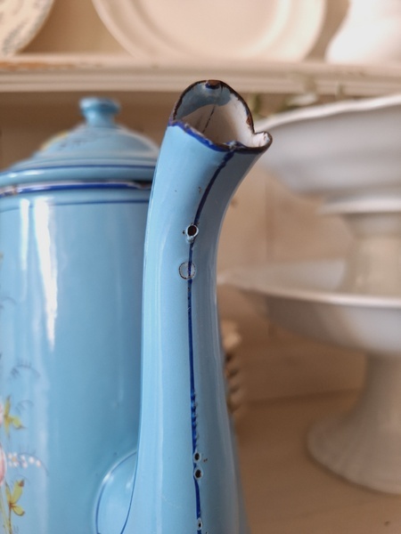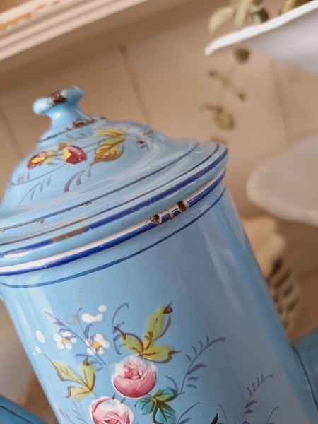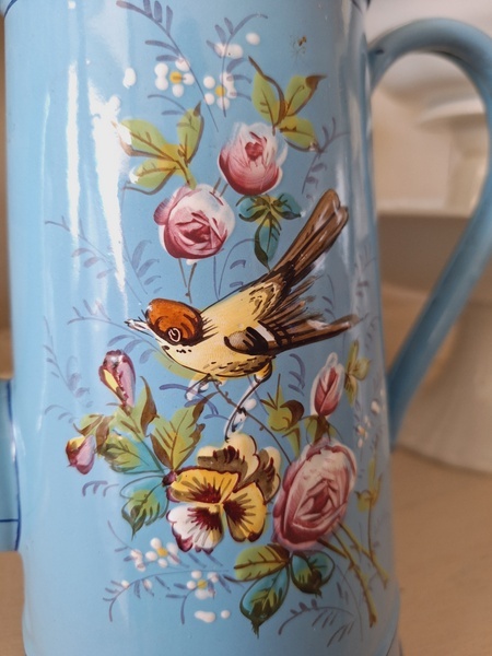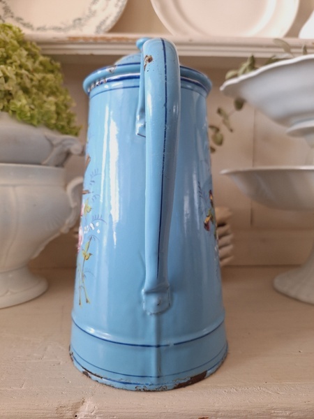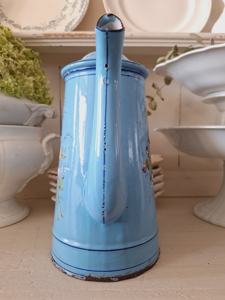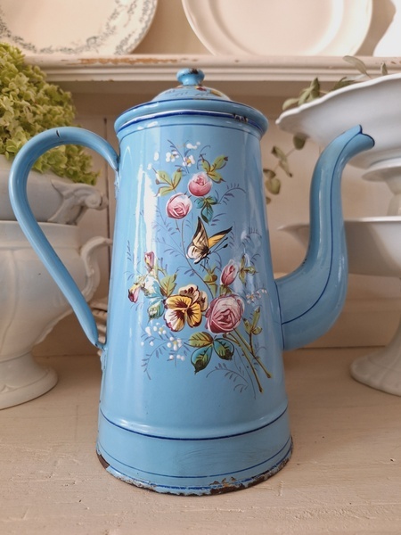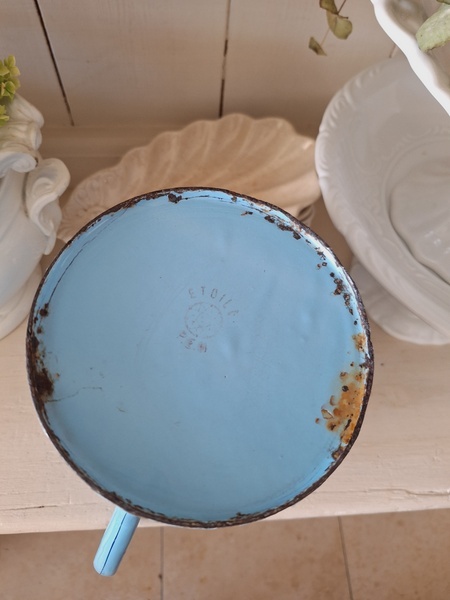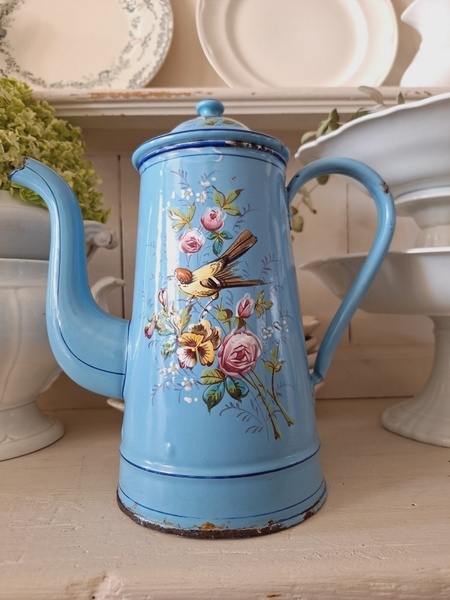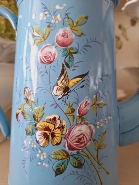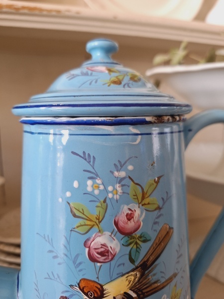 エトワール社手描き花柄ポットです。刻印は入っていませんがエトワール社のエナメルで描かれたポットです。ポット全体に鳥や蝶々と美しいローズ柄が描かれています。ホーローの欠けが若干見られますが柄は艶があり、柄は綺麗に残っています。フランス製/1900年代ごろ