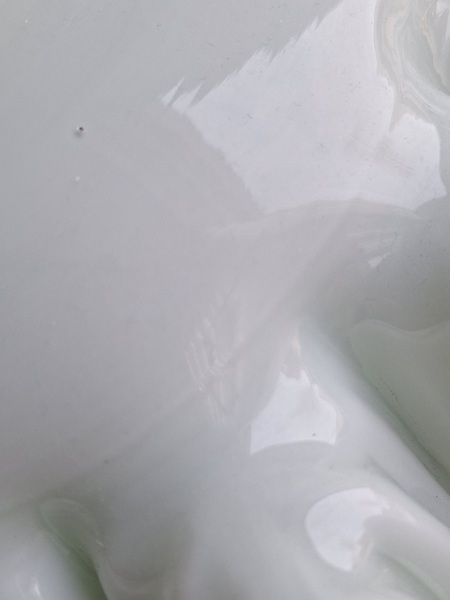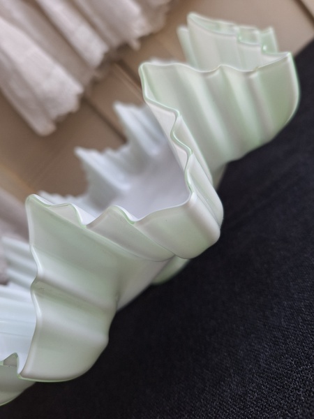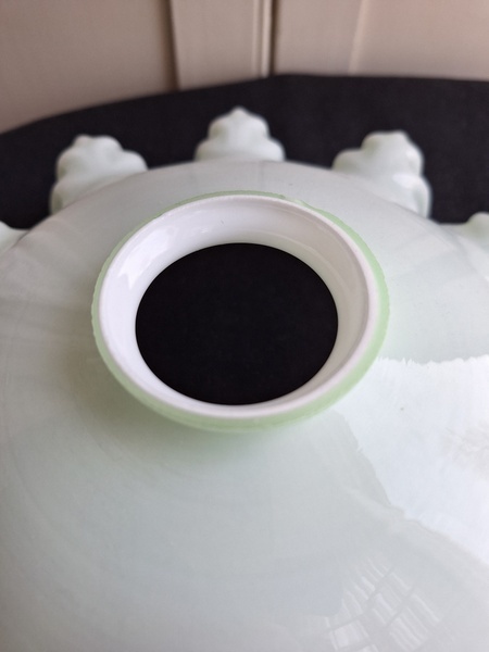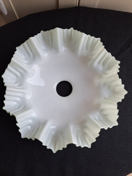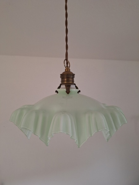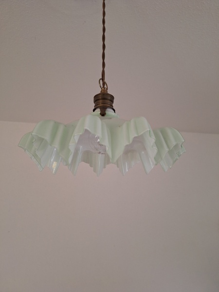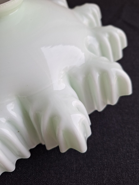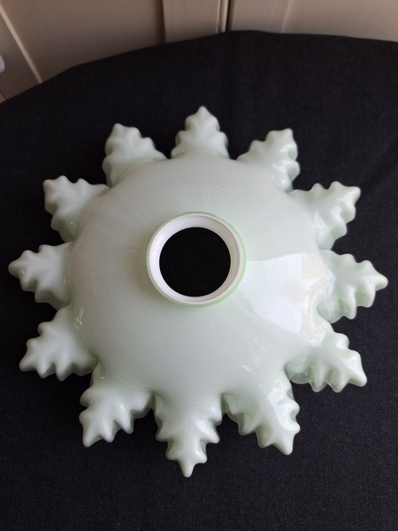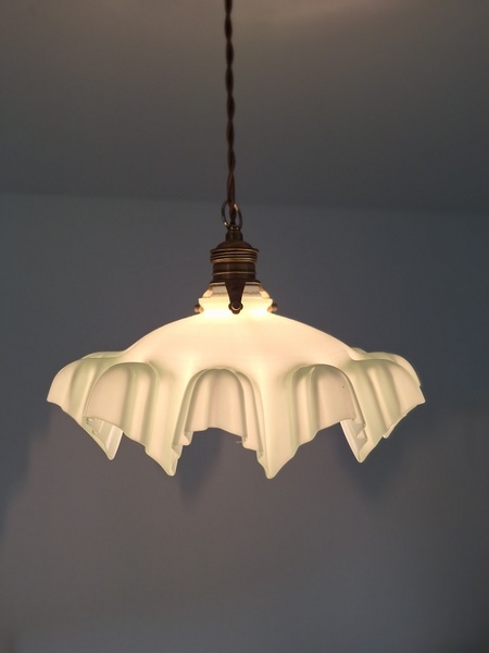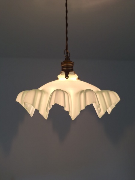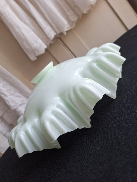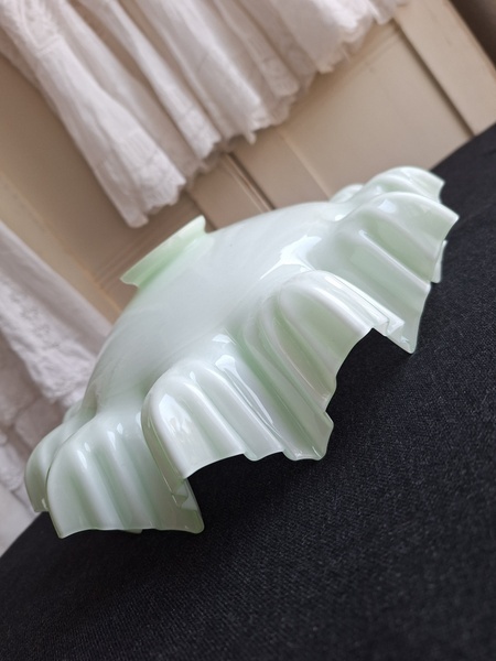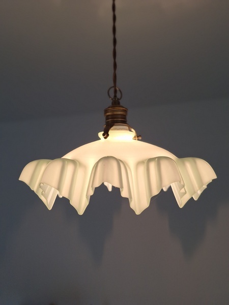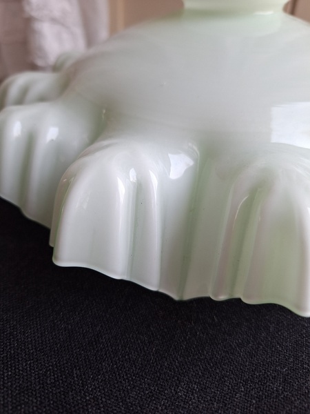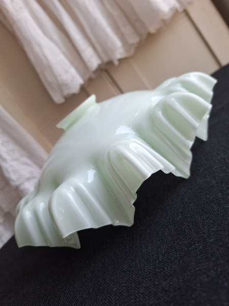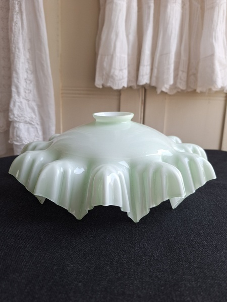 アンティークグリーンオパリンガラスシェードです。こちらのフォルムは久しぶりに出逢いました。この数年でぐっと数が少なくなり、相場が高くなっています。金具を取り付ける箇所にチップがあります。このシェードに多いコンディションです。金具内に隠れるので気にならないと思います。他、とても良い状態です。冬はランプの優しい灯りで過ごす時間が長くなりましたね。冬の穏やかな時間をシェードでお楽しみください。フランス/1940年代ごろ