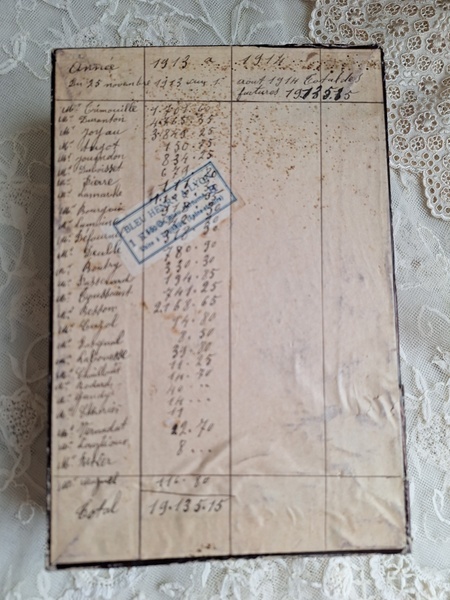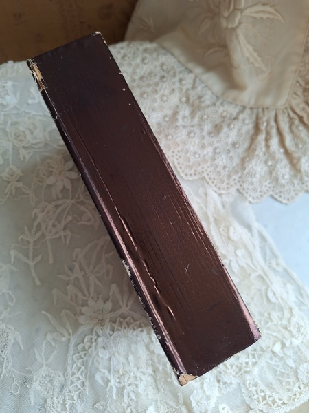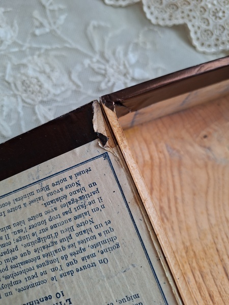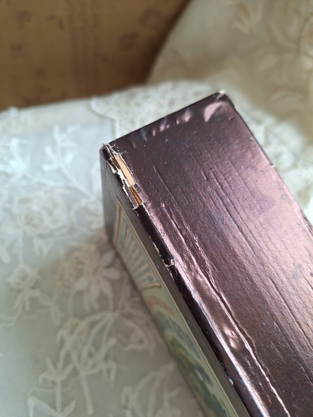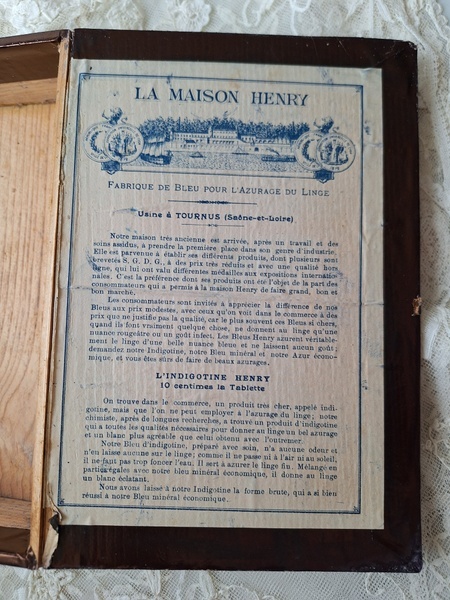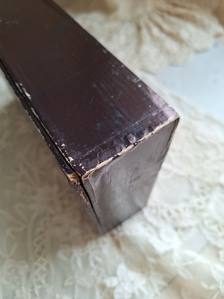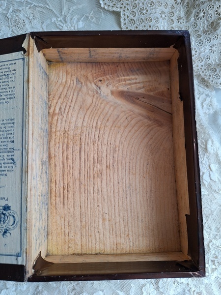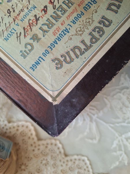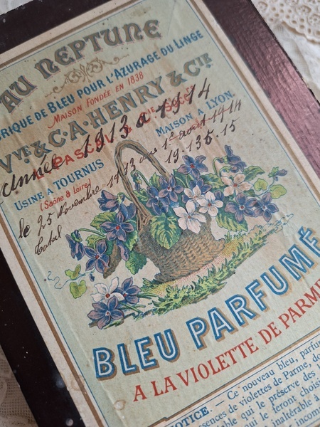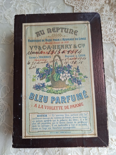ナポレオン三世すみれ柄ウッドボックスです。瓶入りの染色剤が入っていたボックスのようです。ボックス自体は木製でペーパーが貼られていますが素材と年代を考えるととても良い状態です。すみれ柄とロゴがおしゃれなボックスです。当時販売していた時のメモがボックスの裏に掛かれています。この雰囲気もとてもいい感じ♪でトータルで一目惚れしました。フランス製/1890-1900年代ごろ
