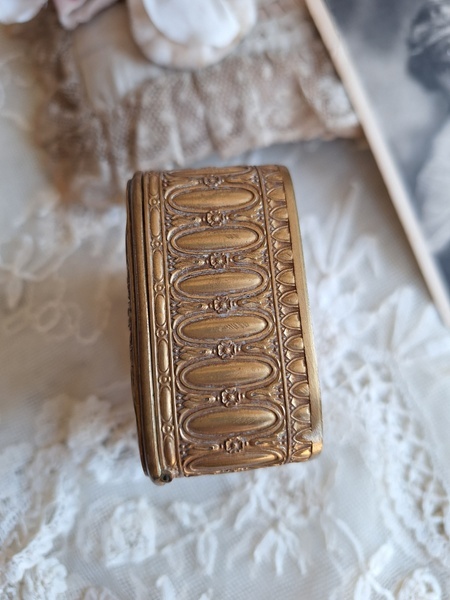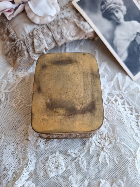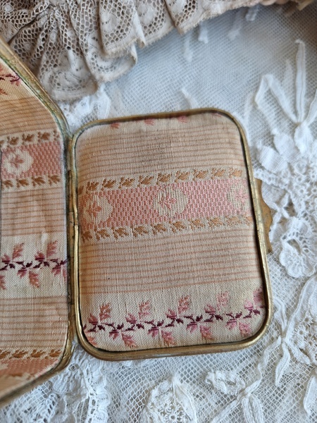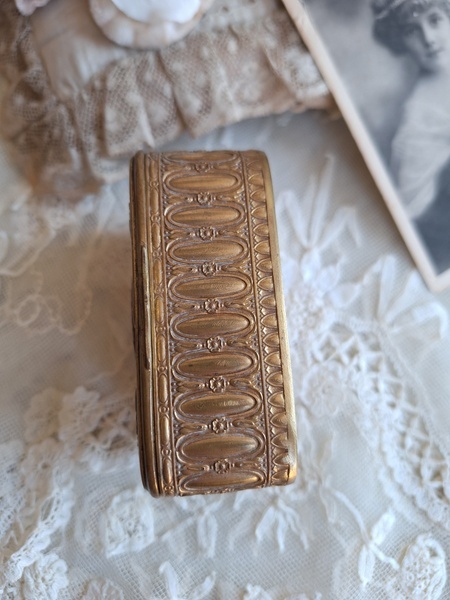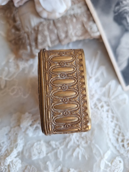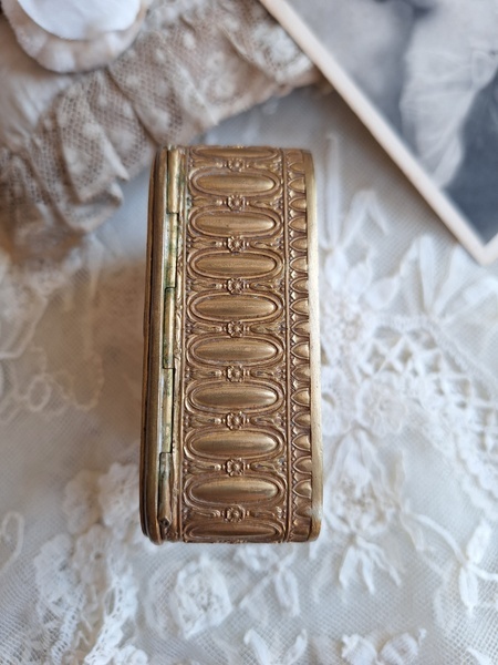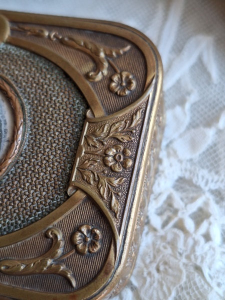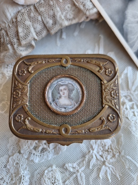 アンティークジュエリーボックスです。中はカルトナージュボックスのように花柄の生地のクッションで装飾されています。中央の貴婦人画の部分に白い汚れが見られますがレリーフが美しいボックスです。フランス