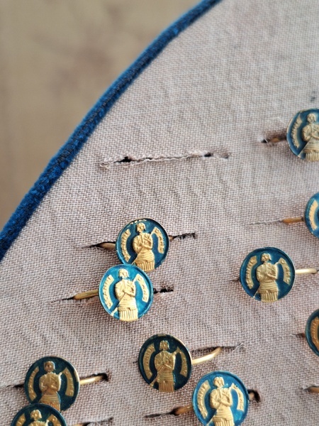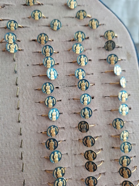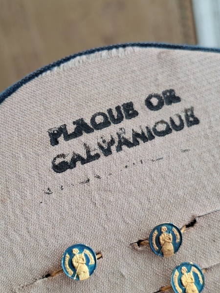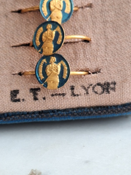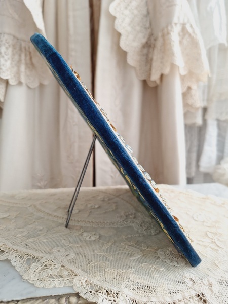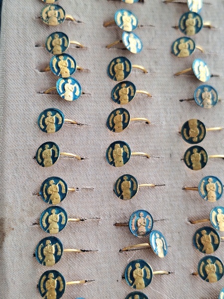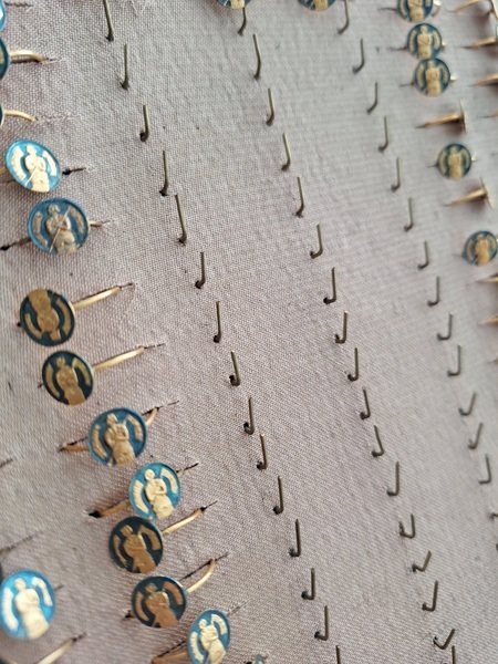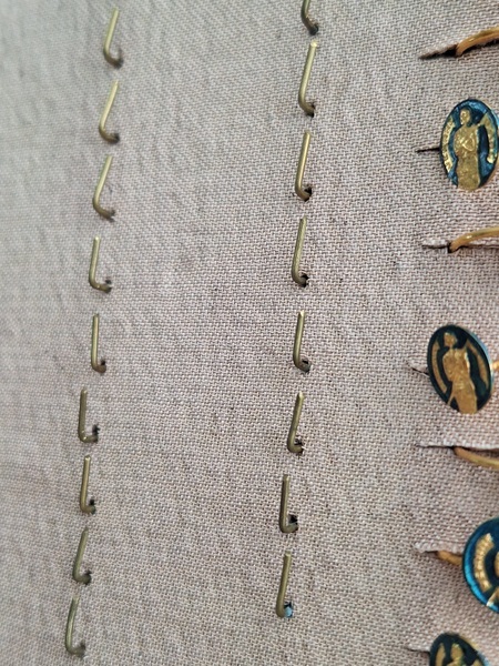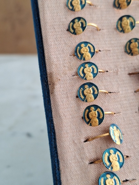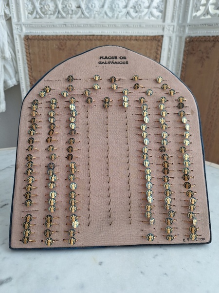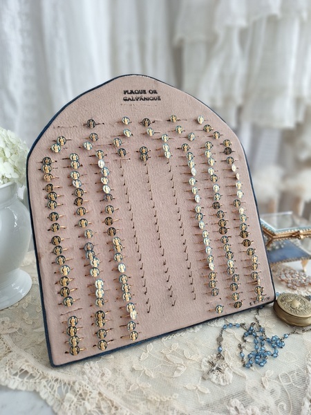 アクセサリースタンドです。小さなリングがたくさんついています。中央はフックがたくさん付いています。小さなチャームを掛けて販売していたようです。両側は小さなリングが付いていたのでそのままにしていますが幅が狭めなのでアクセサリーにタグなどを付けて、タグをリングを刺している穴内に固定して使っていただいても実用可能と思います。アクセサリー販売されている方にお勧めです。フランス製