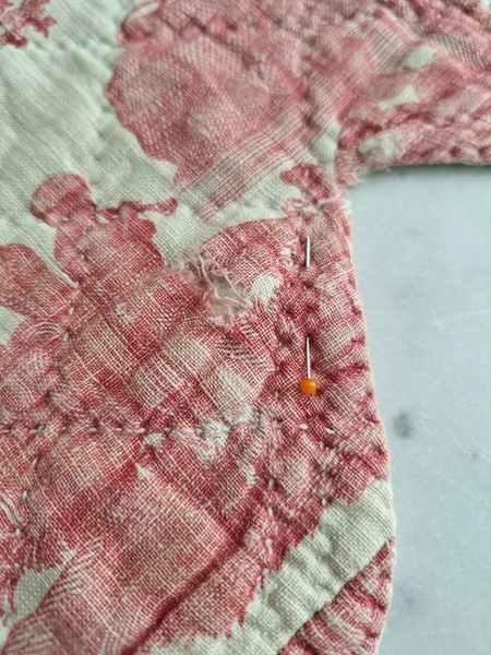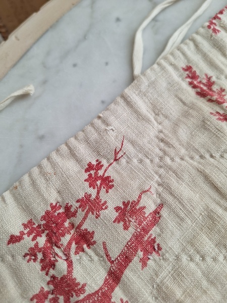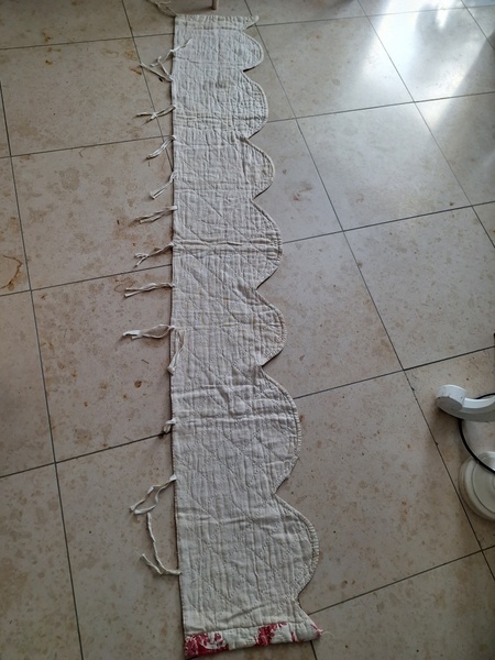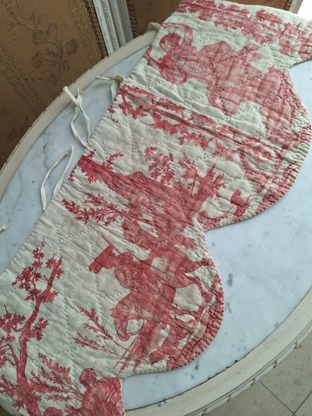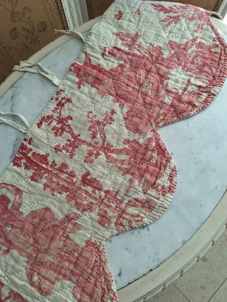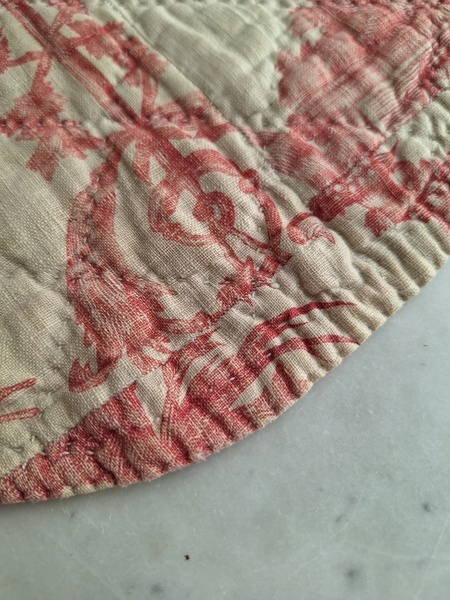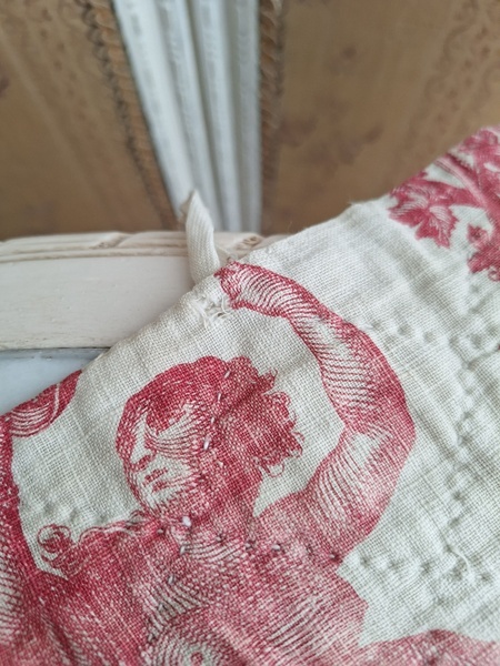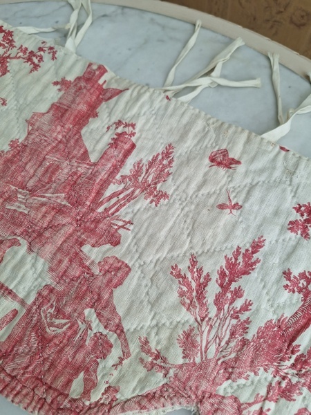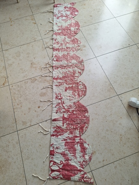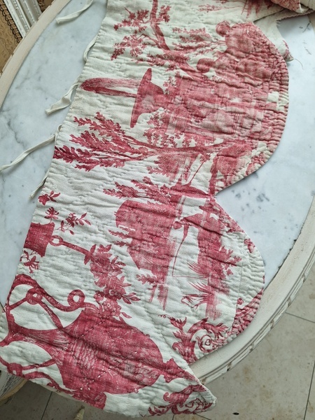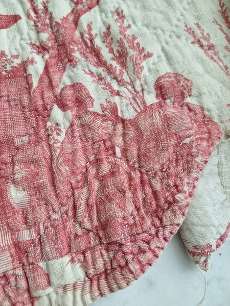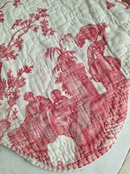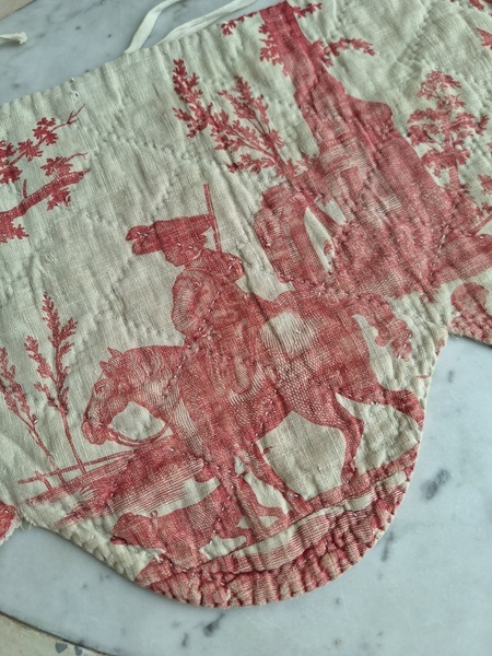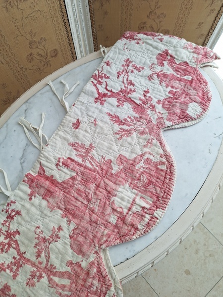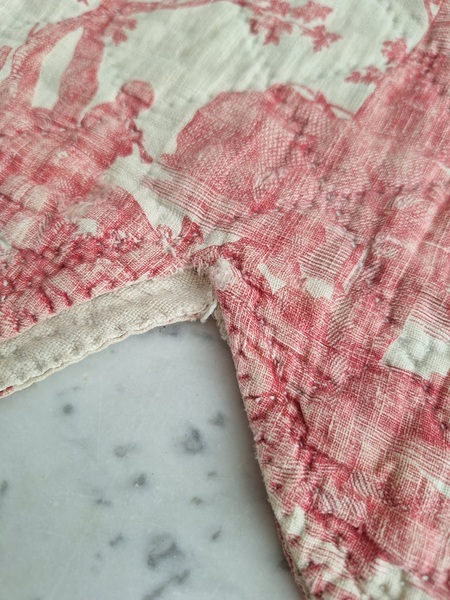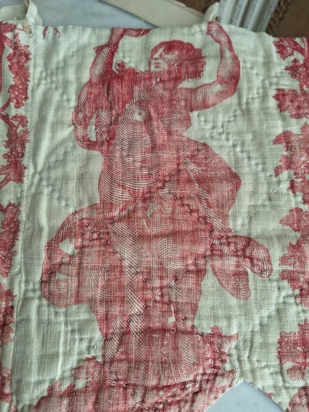 トワルドジュイキルト装飾カーテンです。キルトの装飾カーテンです。ベッドキャノピーなどに使用されていた物かと思います。人物の描写などとても良く描かれています。日本ではこちらのような柄はまだ人気が低いですが、ヨーロッパのアンティークコレクターの間ではこのような年代のキルト、柄はとても高価でやり取りされています。大変古い物で19世紀後期のハンドワーク品です。最後の画像のような痛みがありますが年代を考えるととても良い状態です。フランス製