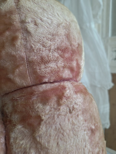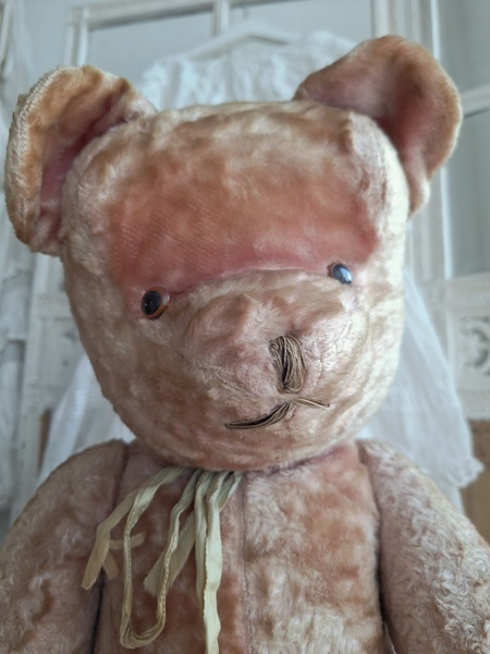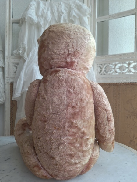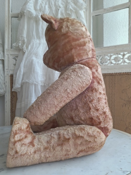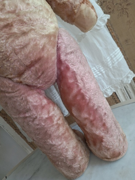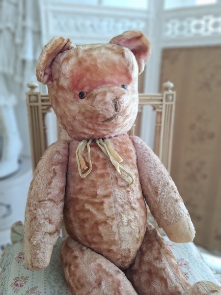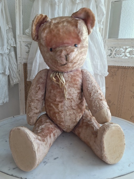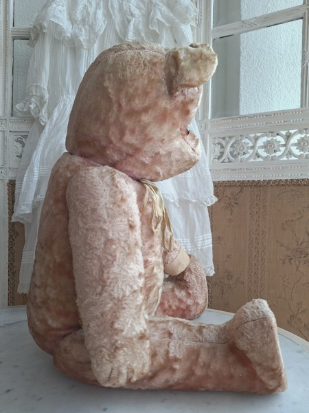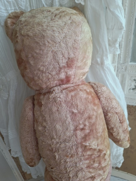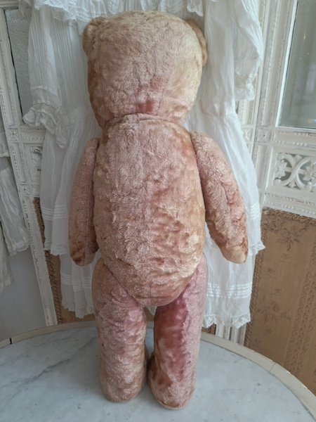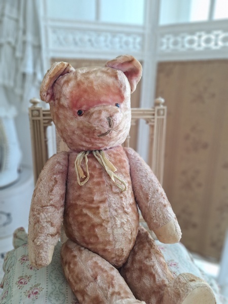ピンクテディベアです。大きなテディベアです。股の辺りがオリジナルのお色ですが時を経てピンクが淡いお色で何とも言えない雰囲気です。ご覧のように特に痛みなども見られず大きなサイズの子としては良い状態と思います。目はプラスチック製、中は藁、手脚はジョイントで動きます。ベルギーでの買い付けですがオランダ製かもしれません。