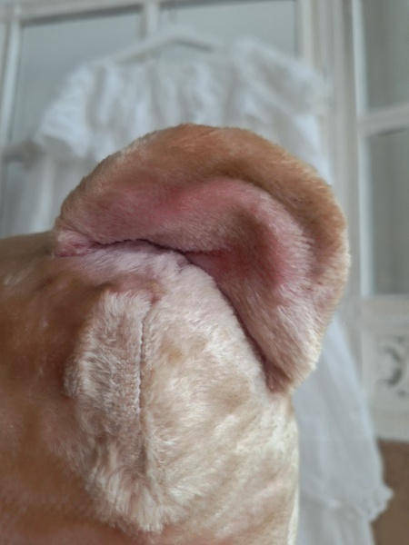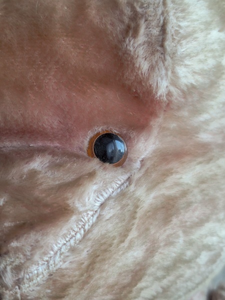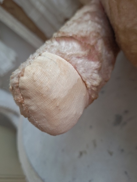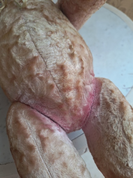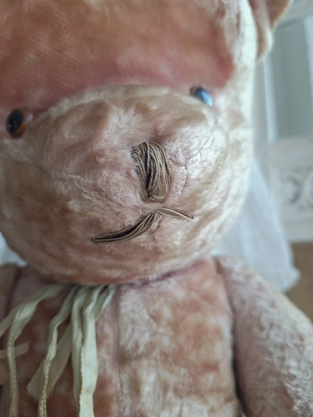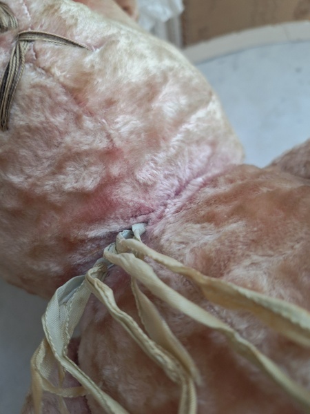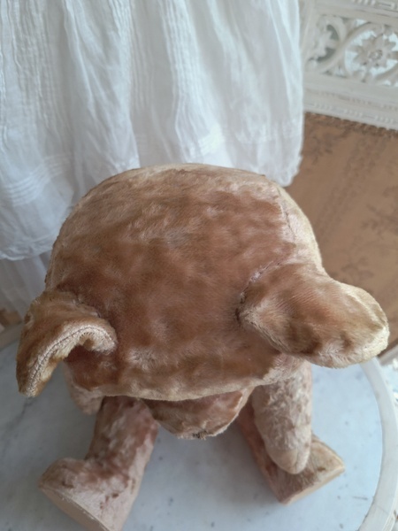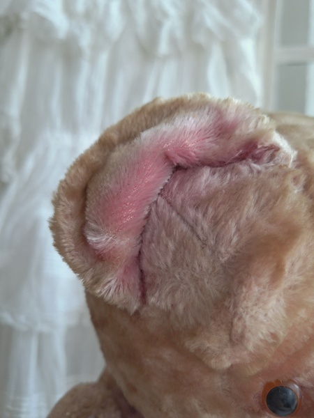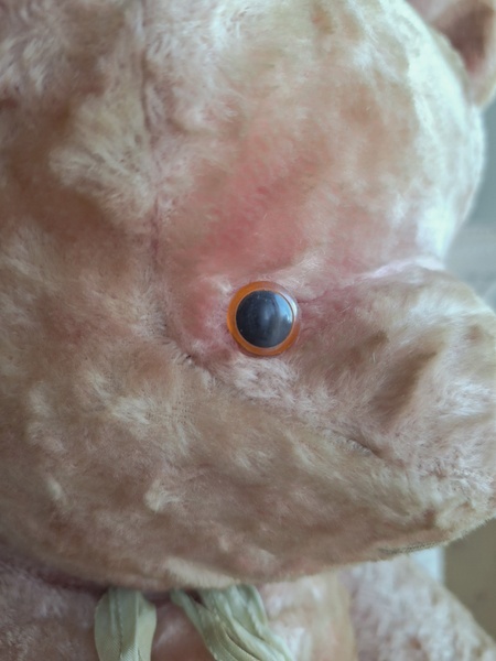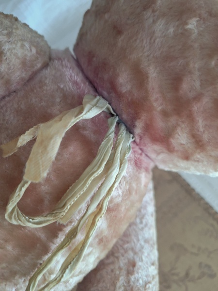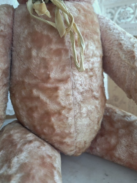 ピンクテディベアです。大きなテディベアです。股の辺りがオリジナルのお色ですが時を経てピンクが淡いお色で何とも言えない雰囲気です。ご覧のように特に痛みなども見られず大きなサイズの子としては良い状態と思います。目はプラスチック製、中は藁、手脚はジョイントで動きます。ベルギーでの買い付けですがオランダ製かもしれません。