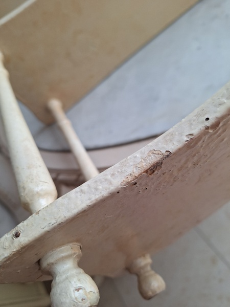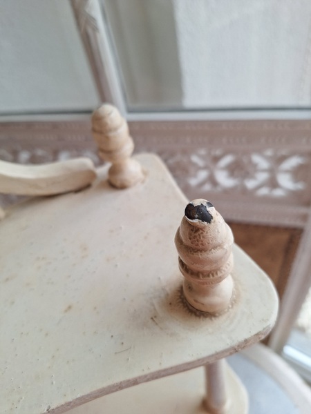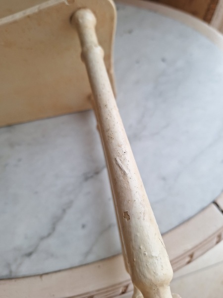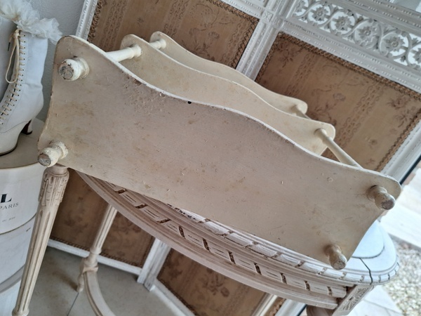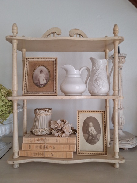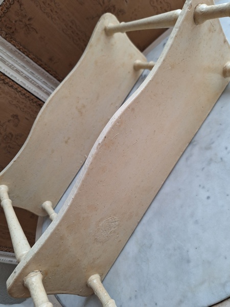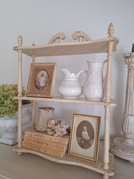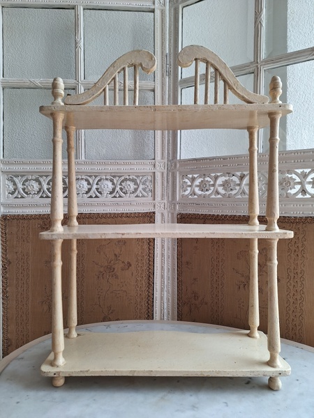フレンチシャビ―シェルフです。アイボリー系のペイントで所々ペイントが剥がれている雰囲気のあるシェルフです。独り立ちしますのでテーブルやキャビネットの上に置いて使っていただけます。壁掛けにされたい方はフックは無いので後ろ側上にL型などのフックをご用意くださいね。シェルフ自体は古い物でオリジナルはナポレオン三世系の黒だったようです。フランス