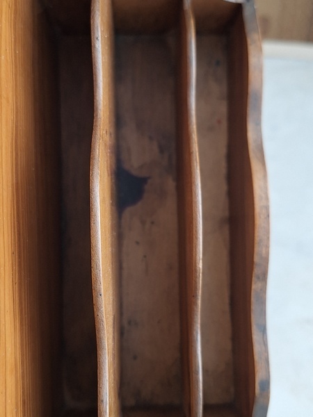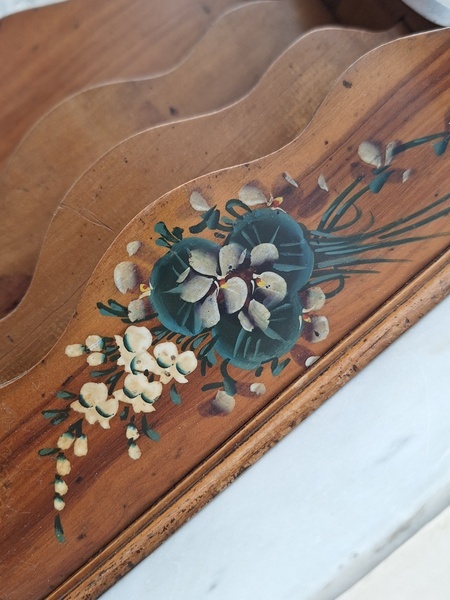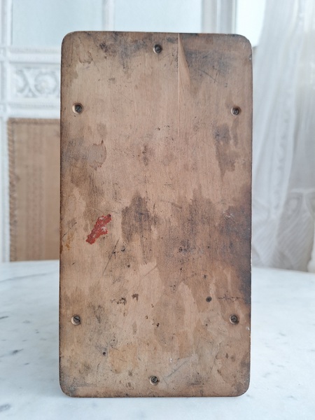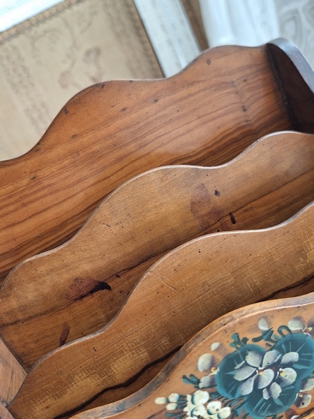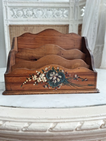 モシュリンヌすみれとミモザ柄レターホルダーです。20年買い付けで各地を周っていますがボックスは多いアイテムですがレターホルダーは数回も見かけた事がありません。一か所ご覧のようなヒビは見られますが他、良い状態と思います。フランス
