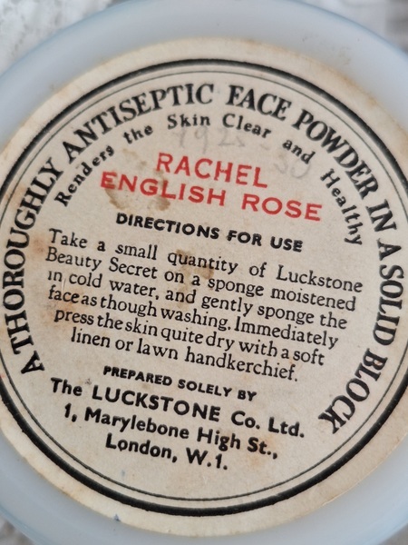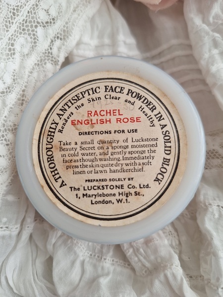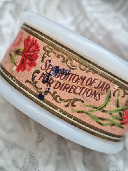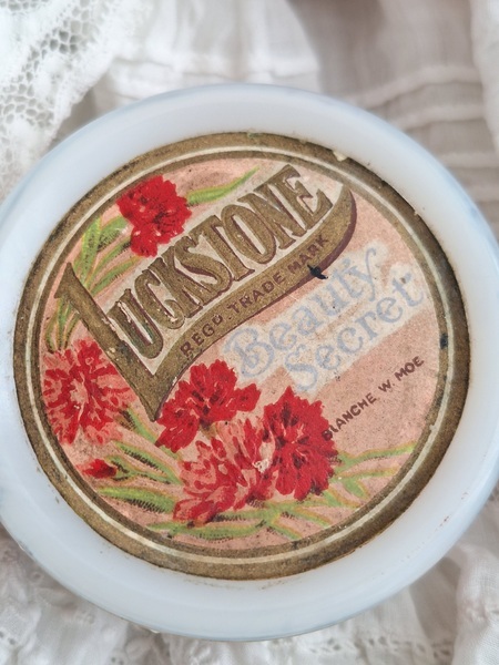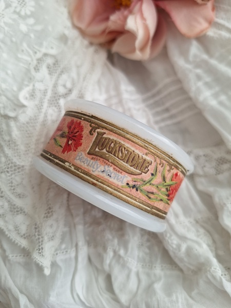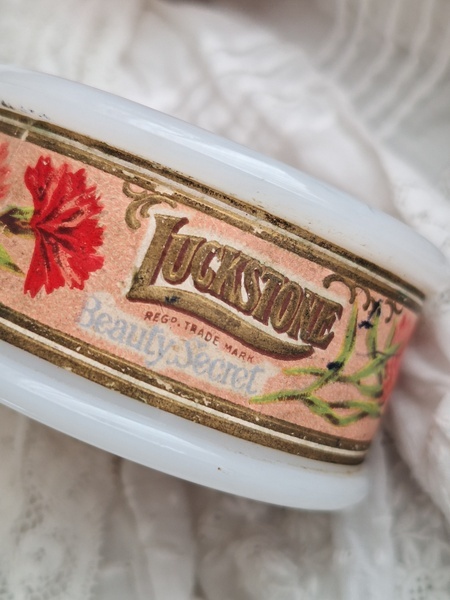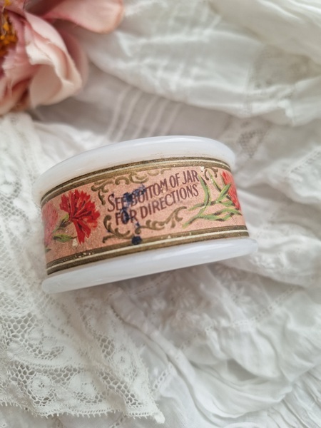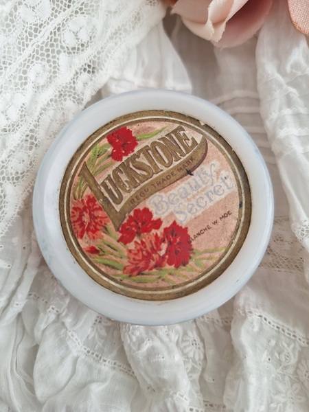 ミルクガラスパウダージャーです。ヴィンテージのミルクガラスジャーの中にはパウダーが入っています。未使用です。パッケージがおしゃれですね。イギリス製