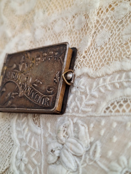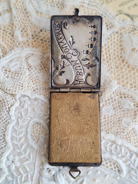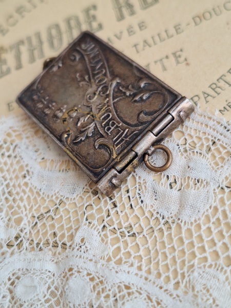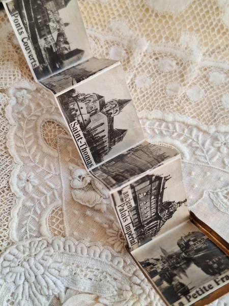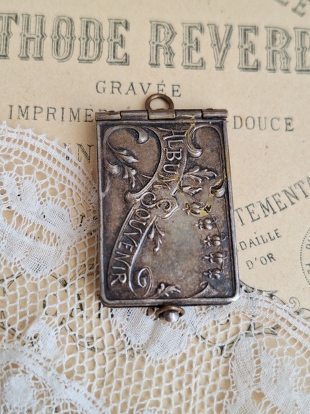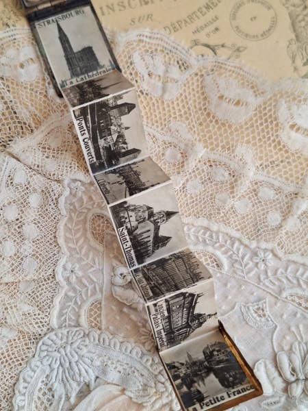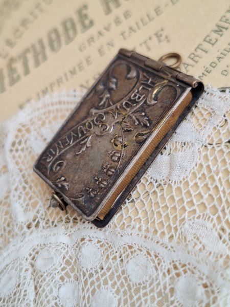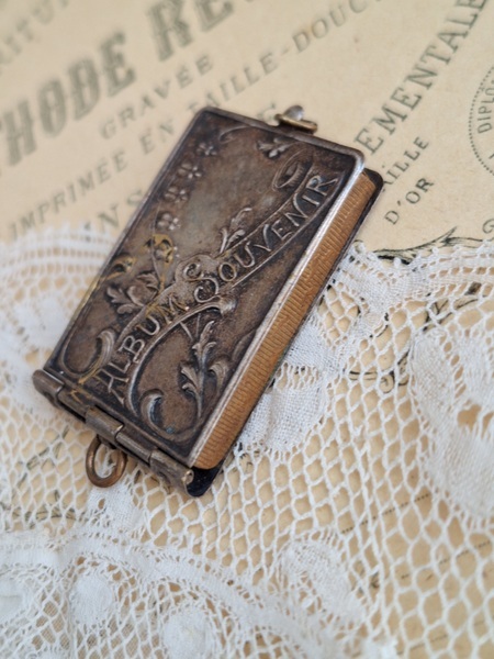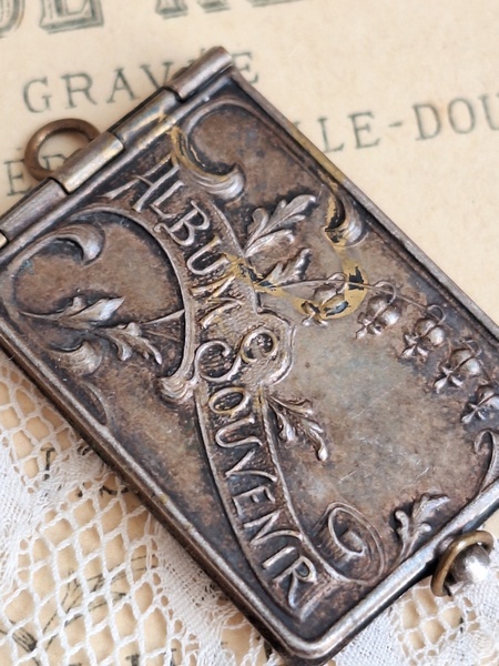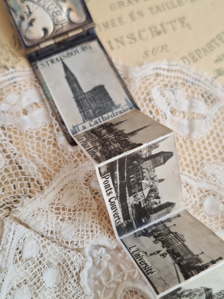 すずらんペンダントトップです。ダンスカードと同じ造りでこちらは観光地の写真が入ったアルバム式のペンダントトップです。ストラスブールのすーべーニール品で名所の写真が付いています。ストラスブールの周辺はフランスで最も美しい村に認定された村がいくつかあります。拡大するとゴールドの色合いが見られますが肉眼で見るとあるか分かりません。フランス製