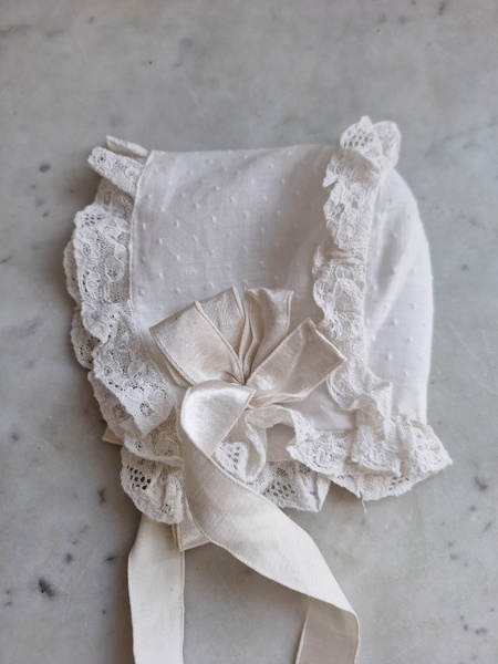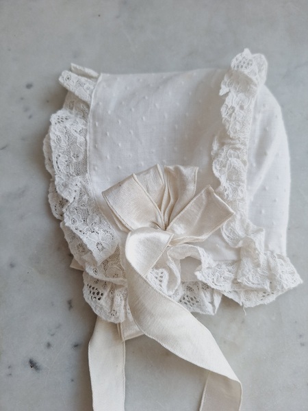 トッド柄ベビードレス&ボネです。お揃い柄のセットです。ドレスは下地が付いています。全面のれーふのフリル、後ろ側は大きなリボンが付いていてとっても可愛いですね。レースに小さな汚れ、ドレスの方は大きな痛みも見られずどちらも良い状態です。ボネも可愛いです♪フランス