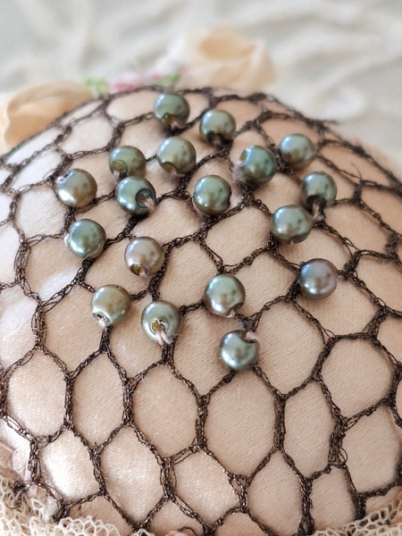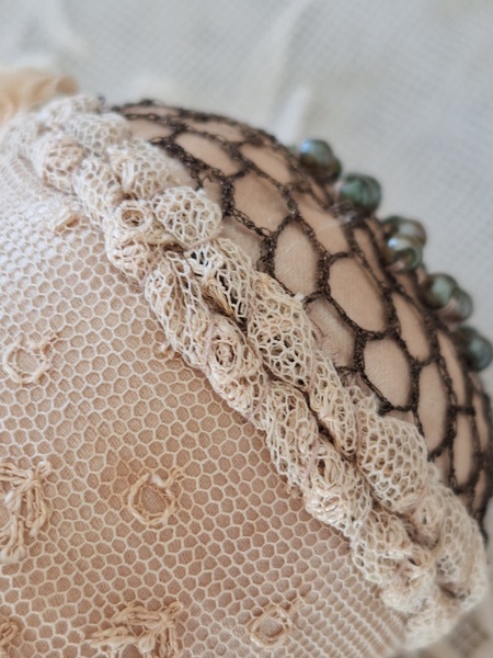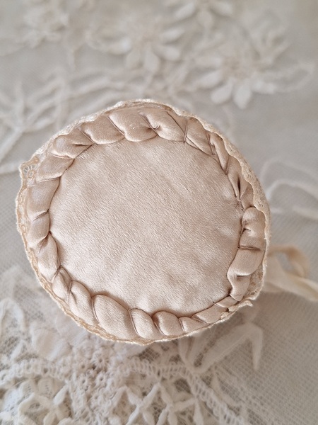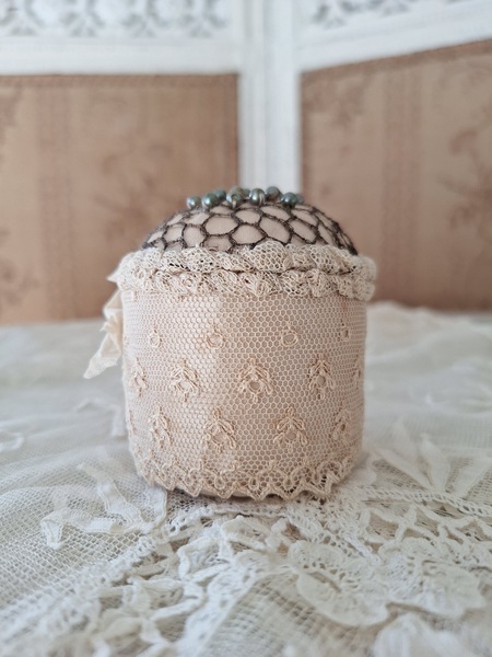 アンティークレースピンクッションです。シャンパンカラーの生地にレースが使われたクッションです。ヨーロッパのアンティークディーラーさんがアンティーク素材を使って作られた物です。彼女の作られたクッションやレースパ二エはこちらでも人気があります。いつもレースパニエやクッションのご紹介ですが今回はピンクッションです。グリーンのパーツはピンではなくビーズで装飾されています。