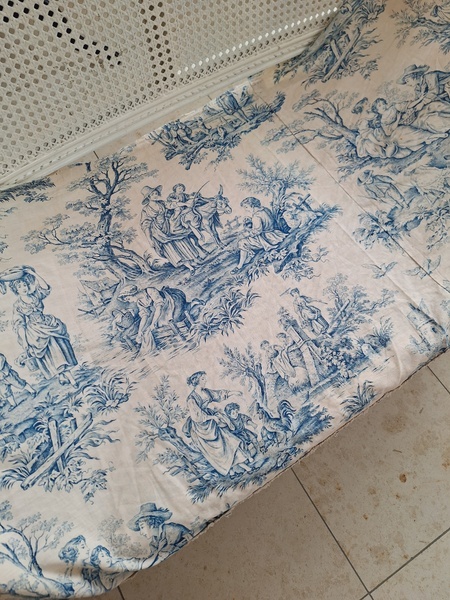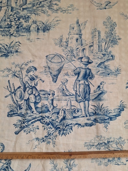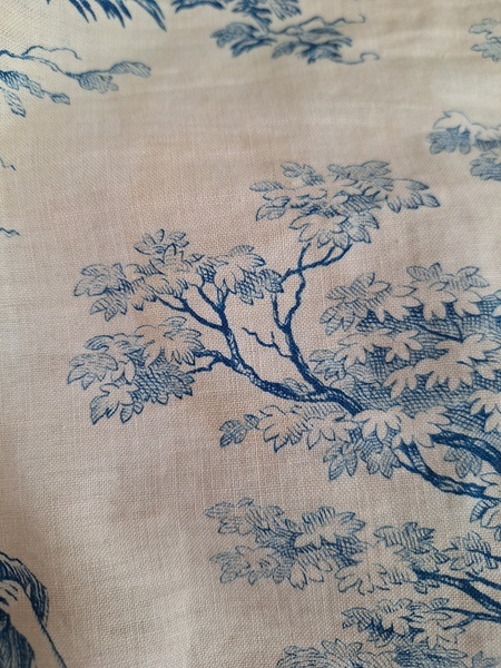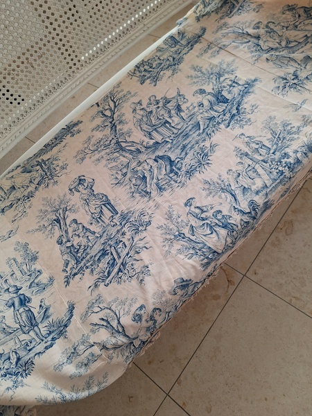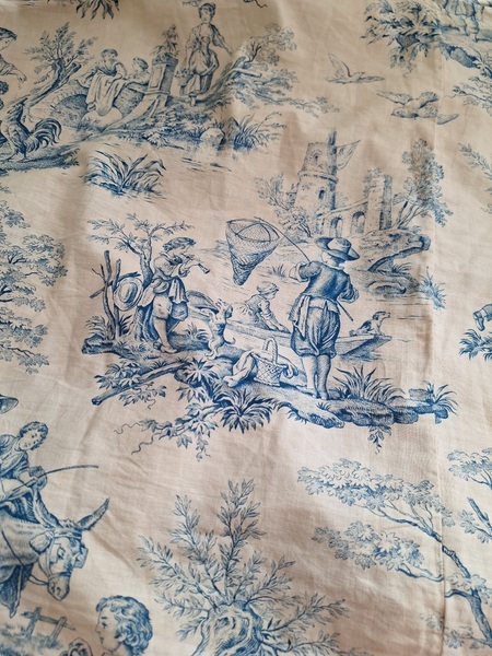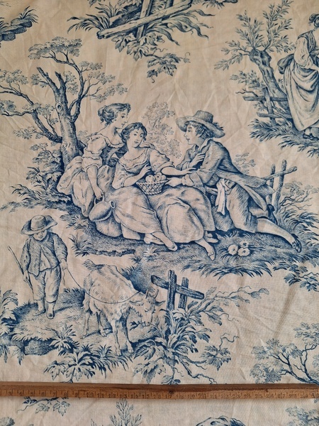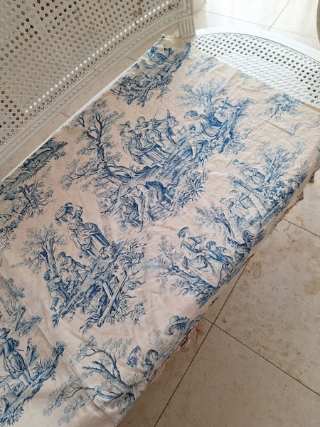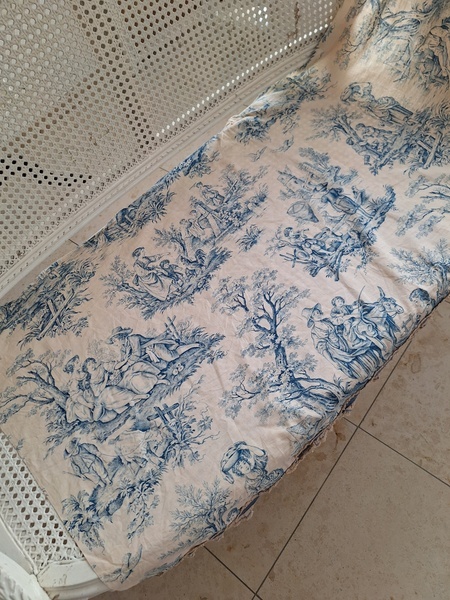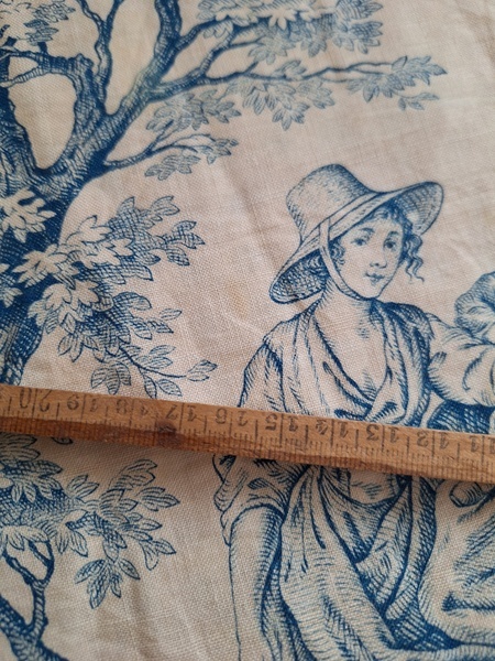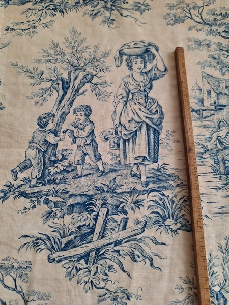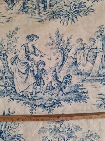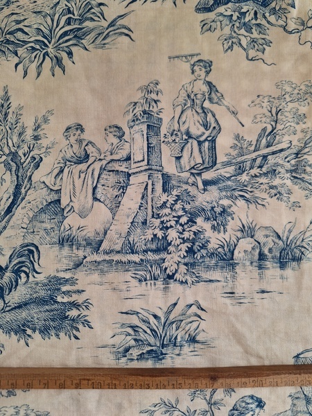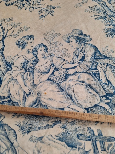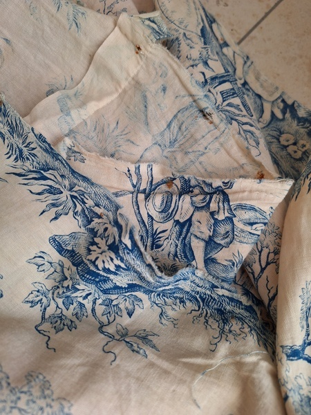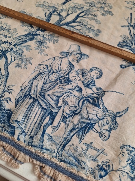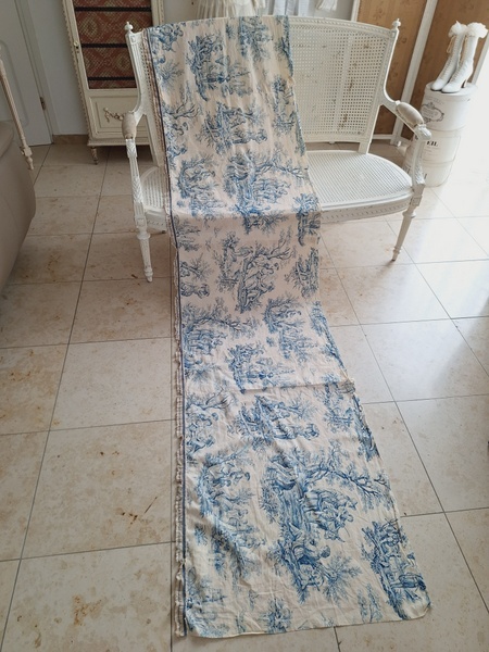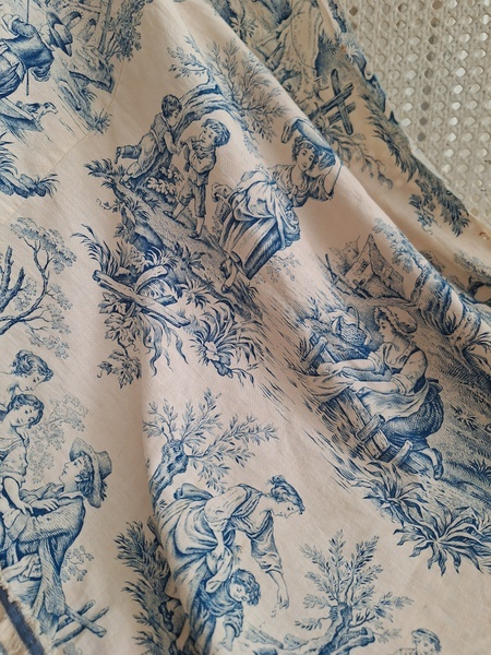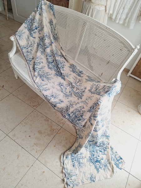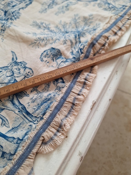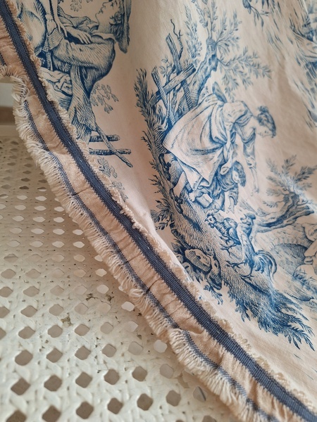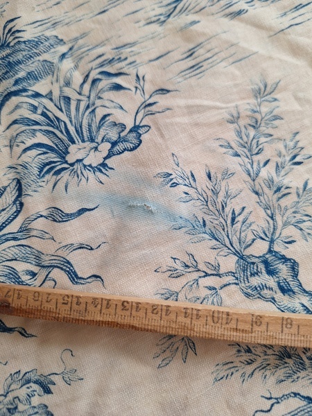 トワルドジュイ柄端切れカーテンです。古手のカーテンです。ベッドキャノピーなどの装飾に使われていたカーテンかと思います。目立った痛みや汚れはありませんが若干色が滲んでいる箇所があります。気になる方は横長ですので滲んでいる所はカットしてリメイクなどにされても。フランス/1900年初頭