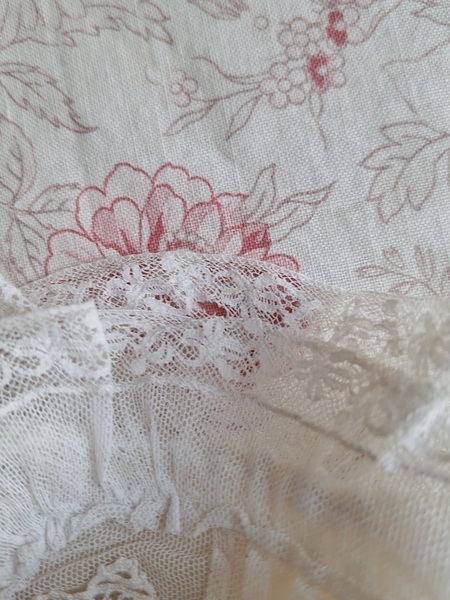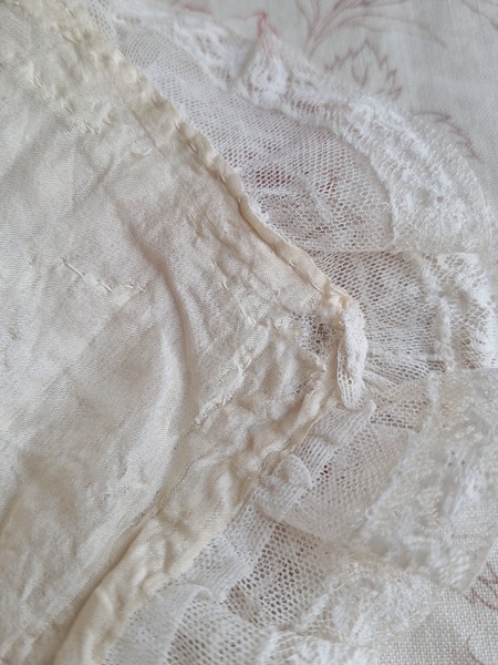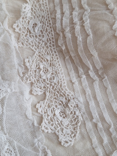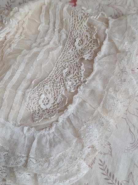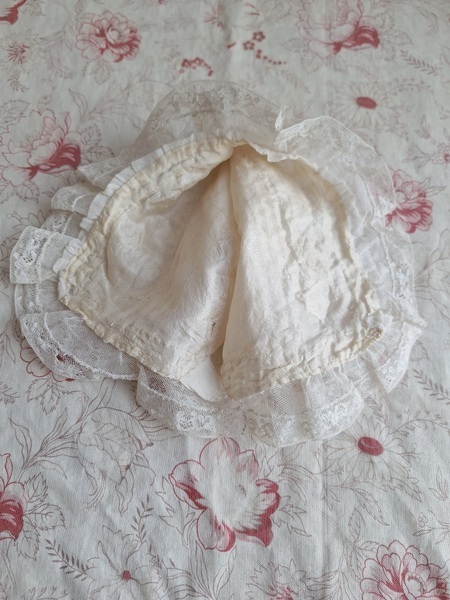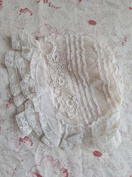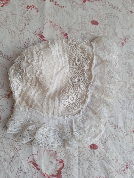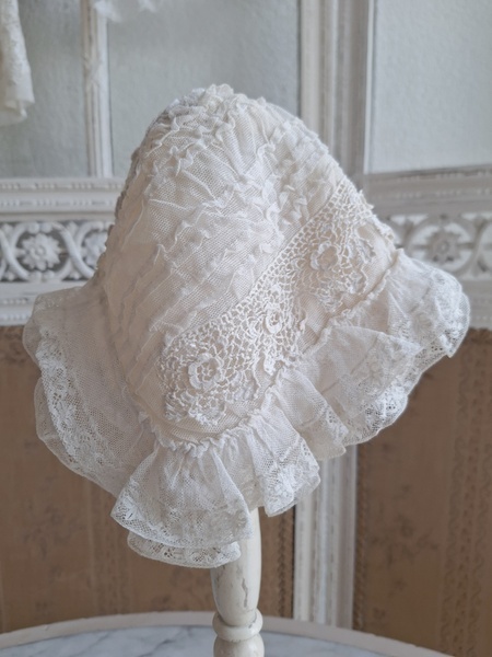 レースボンネットです。クロッシェ編みとのコンビネーションが可愛いボネです。レースのフリㇽががたっぷりです。レースにご覧のような痛み、内側のシルクに痛みがありますが全体的に良い状態です。フランス