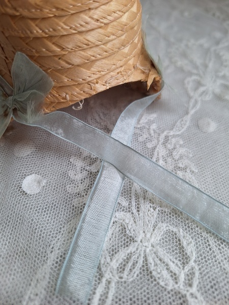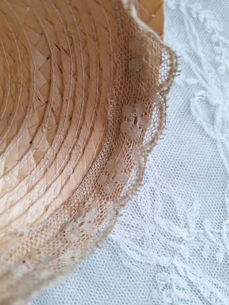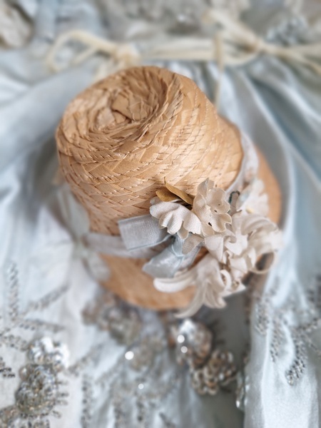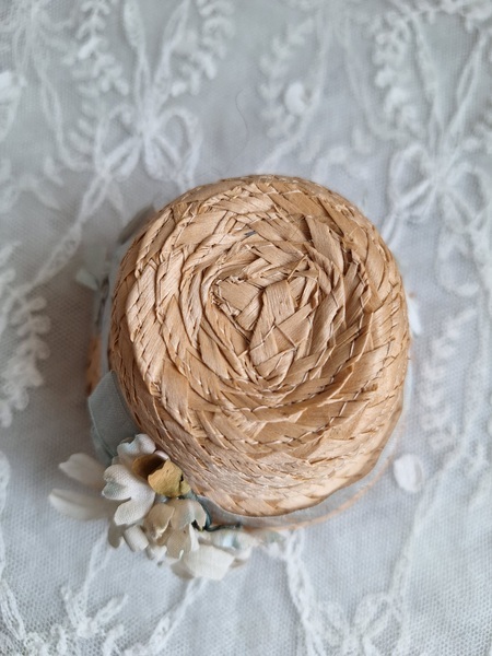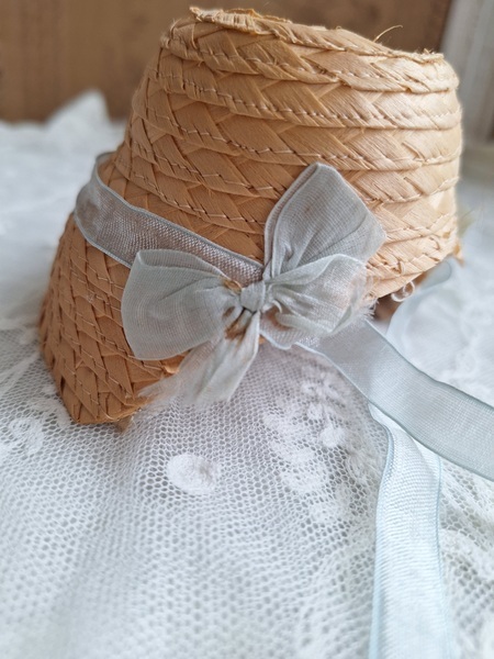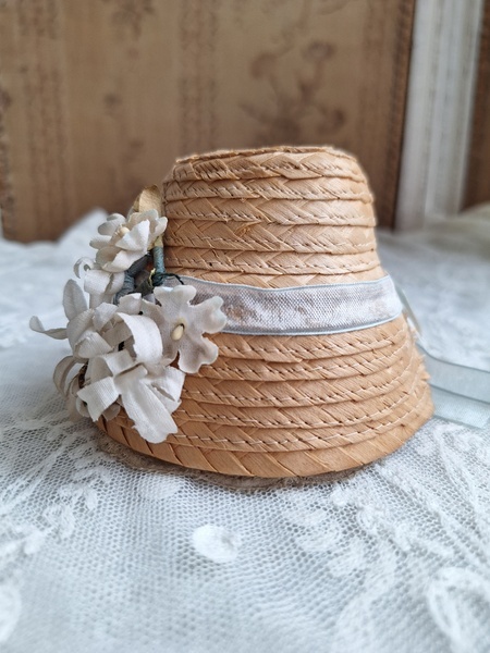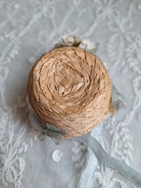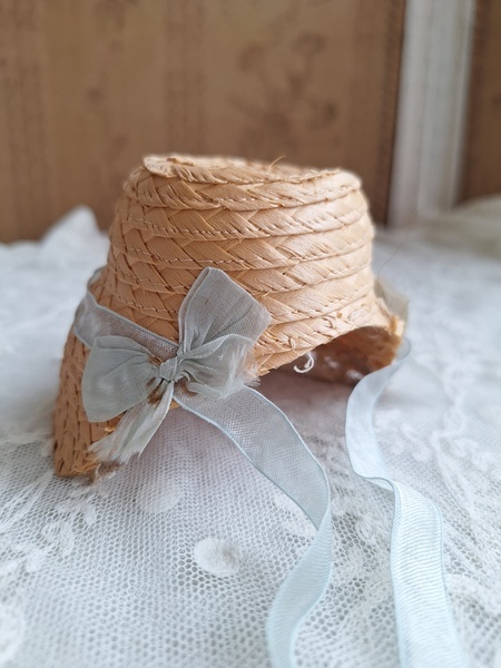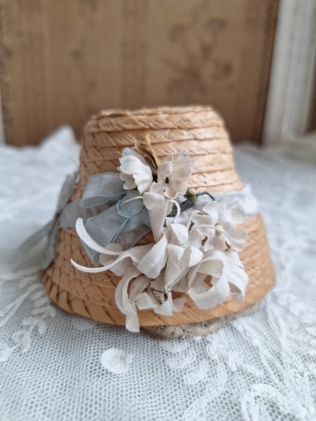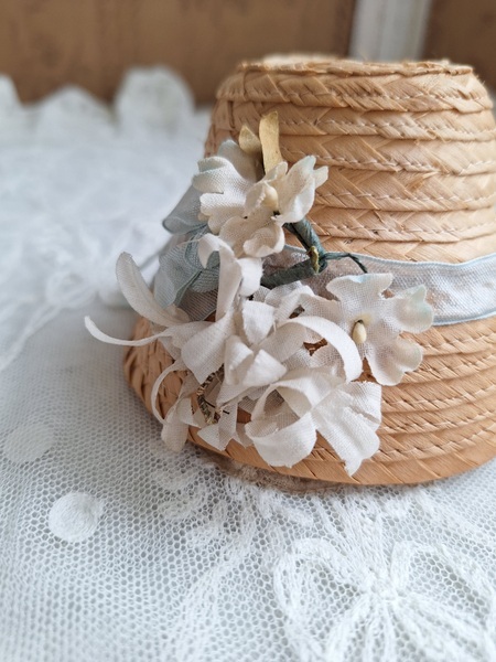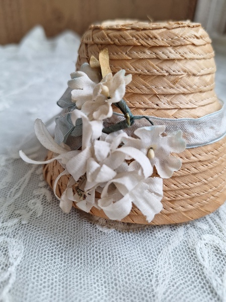 ドールストローハットです。布花とブルーのリボンが可愛いハットです。良い状態です。フランス/ヴィンテージ