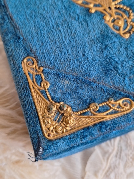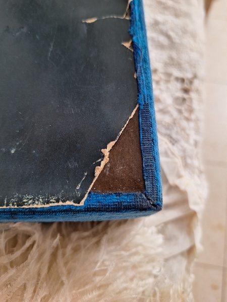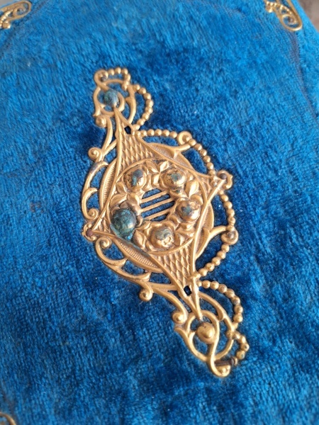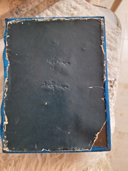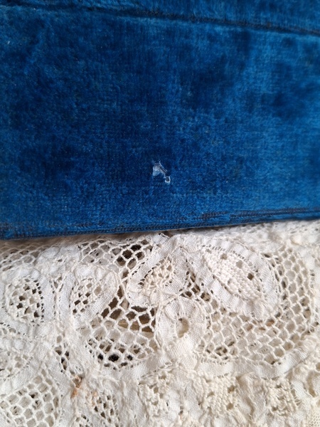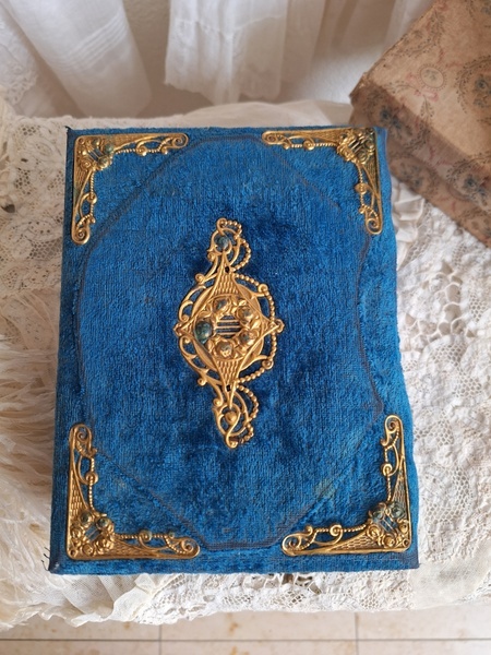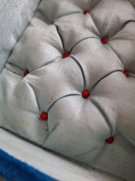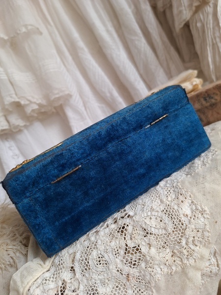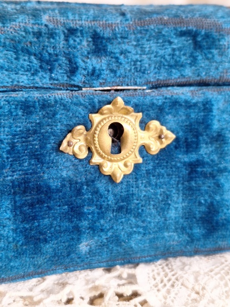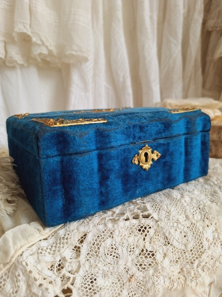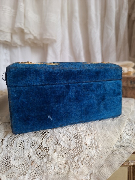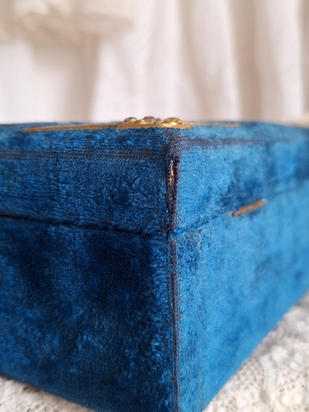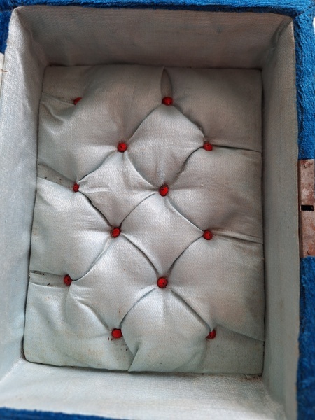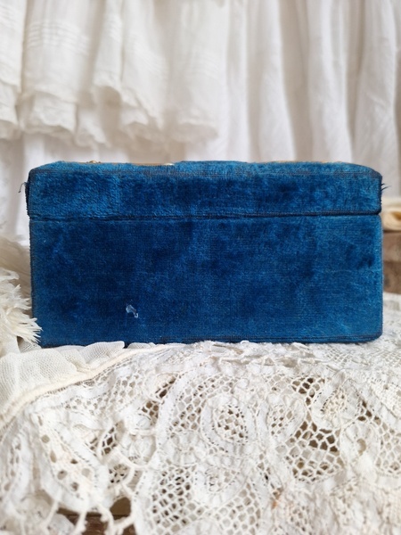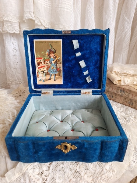 クロモスカード付ブルークッションボックスです。もともとはソーイングツールかネイルツールが入っていたボックスかと思います。薄いブルーのクッション付きです。クロモスカードは持ち主がアレンジされたのかな?このボックスにとても似合っていて可愛いですね。ミニョネットのお部屋にされても素敵かも。フランス製