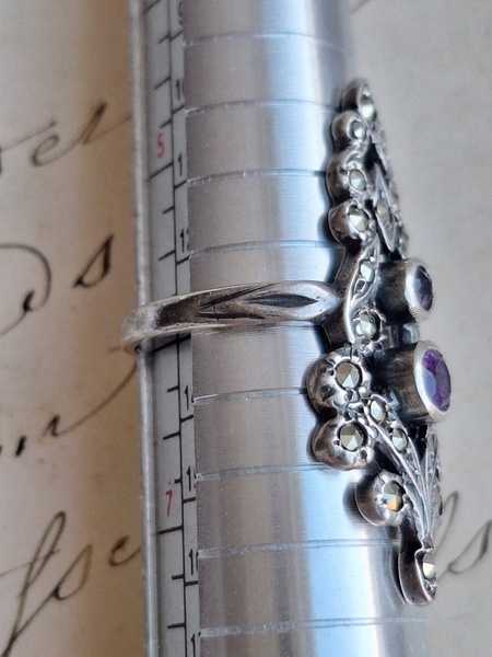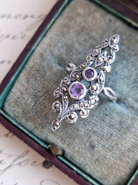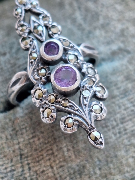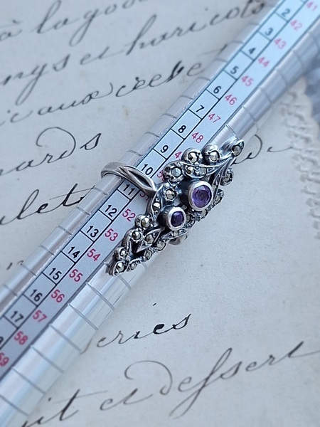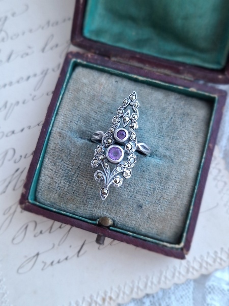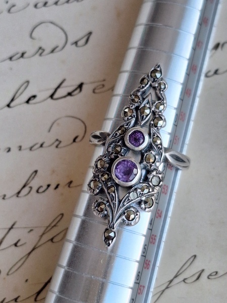 アメジスト&マーカサイトリングです。土台はシルバーです。普段使いには華やかなと思いますが特別な日、パーティーなどで身に着けていただくと手元が映えると思います。指にフィットするひし形のようなフォルム、中央のアメジストにマーカサイトの細かな装飾がとても印象的なリングです。アメジストの豊かなパープル色と多様な輝きで精神を癒し安定してくれるパワーストーンともして知られていますね。マーカサイトはヴィクトリアンアールデコ時代にかけてダイアモンドの代用品として流行りました。真鍮のような金属光沢と深い輝きが特徴です。画像は薄く見えています。リングサイズ棒でアメジストやマーカサイトのお色を確認ください。リングボックスは非売品です。リングサイズ棒で撮影しているドイツ/1930年代ごろ