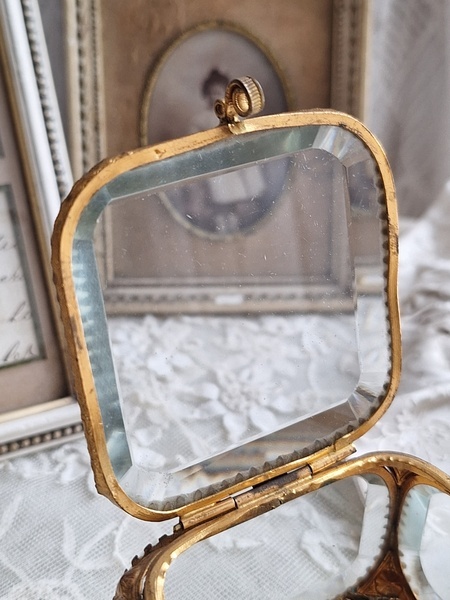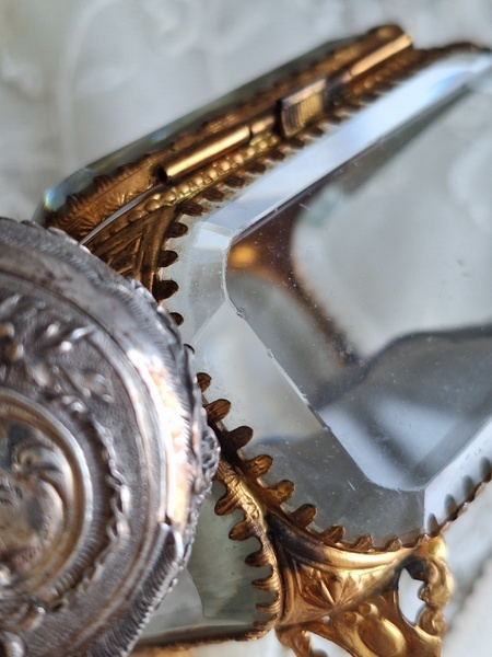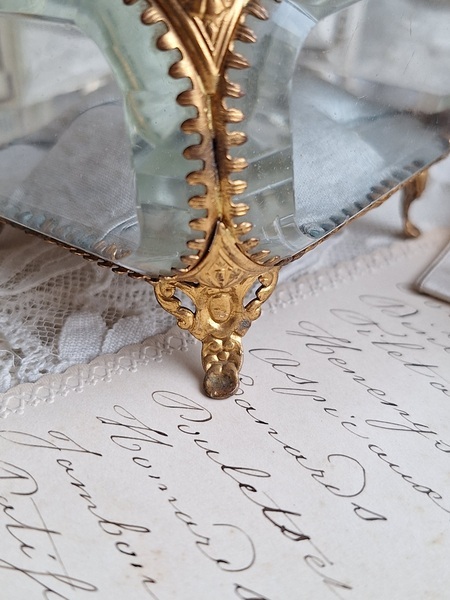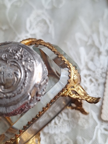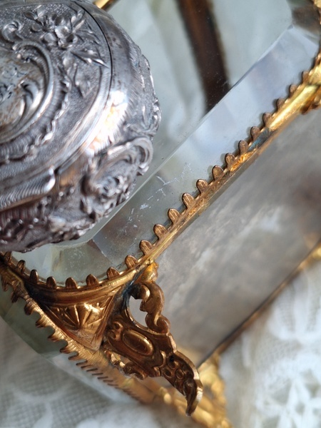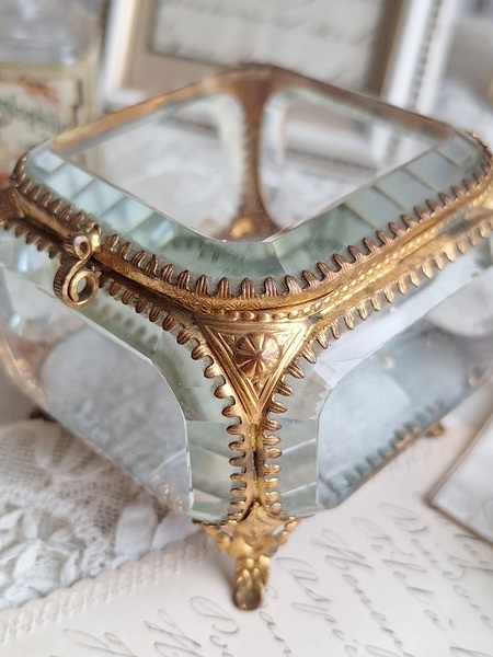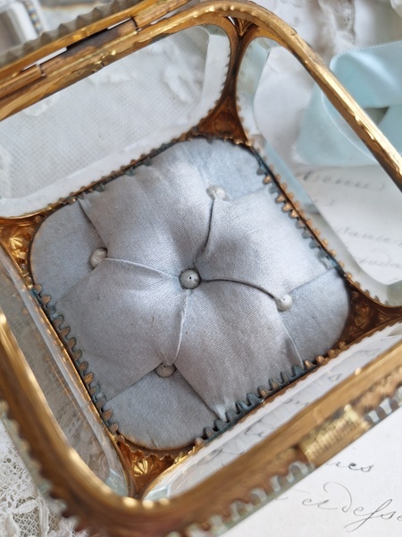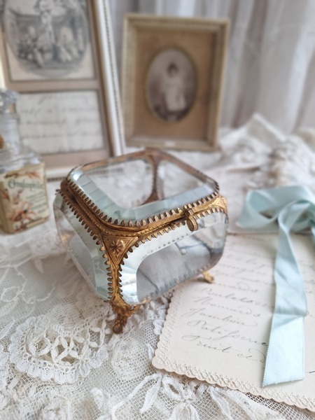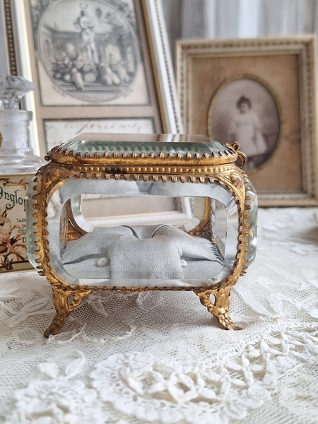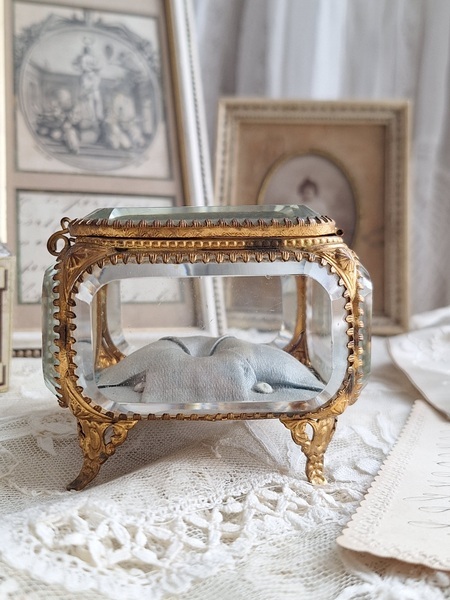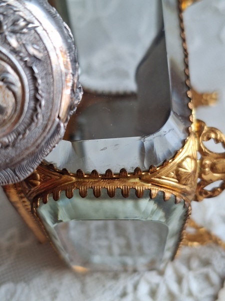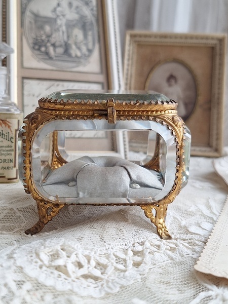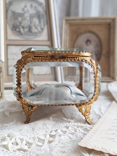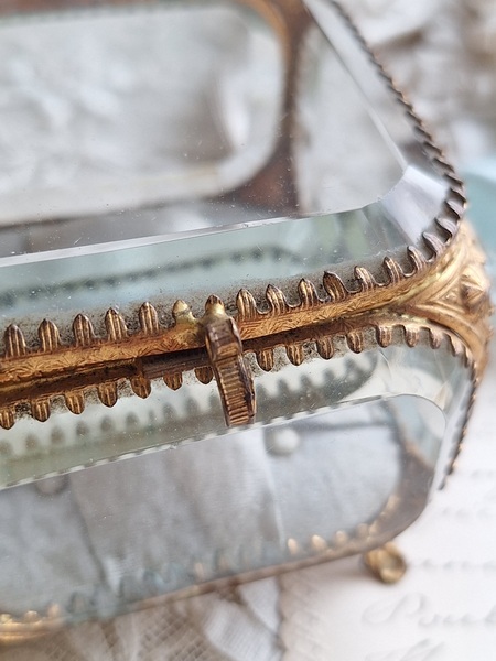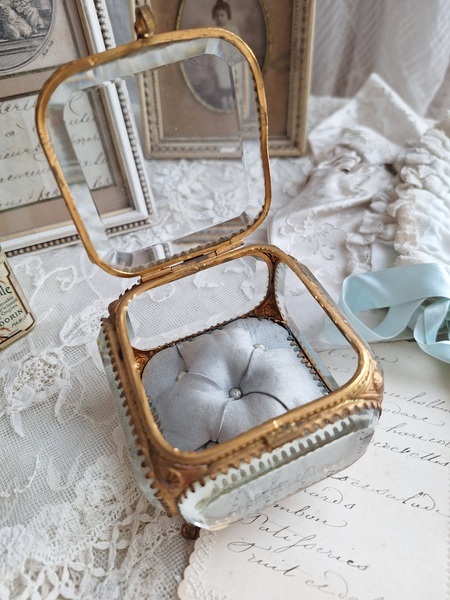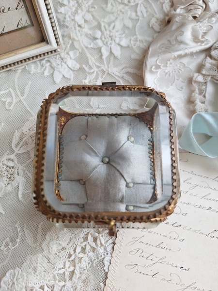 アンティークガラスジュエリーケースです。ブルーの綺麗なシルククッションです。クッションの状態はご覧のように良いです。ご覧のような傷等は多少見られますが拡大している画像ですので使っていただく際に気になる傷は無いと思います。最後の画像で欠けているように見えますが製造工程からガラスの表面がこのように見えています。触ってくぼんだりはしていません。ケース内の内側のコンディションです。底は金属板でガラスは厚く品質の良いケースです。スーベニール品をアレンジされているジュエリーケースも増えていますがこちらは品質のあるケースです。フランス/1900年初頭