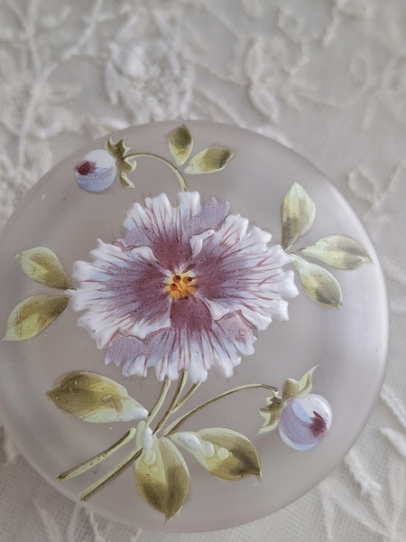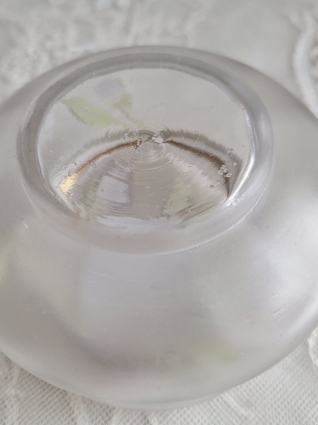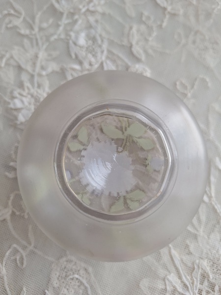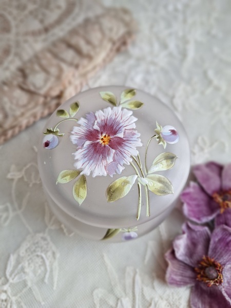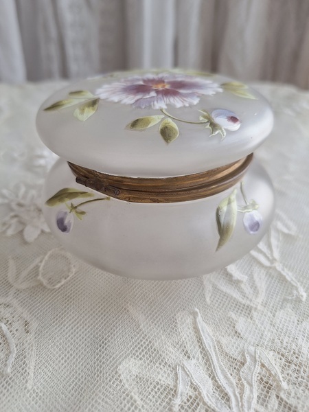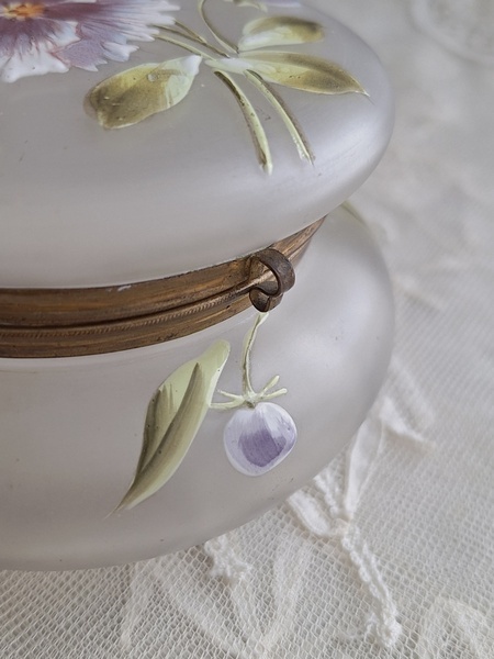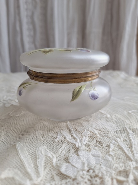 ガラスパウダージャーです。紫の可愛い花が蓋全体に描かれています。状態は良いです。こちらもフランスやベルギーでは高値で扱われていてなかなかお手頃なのが手に入りにくくなりました。ジュエリーケースとして使っていただいても。フランス