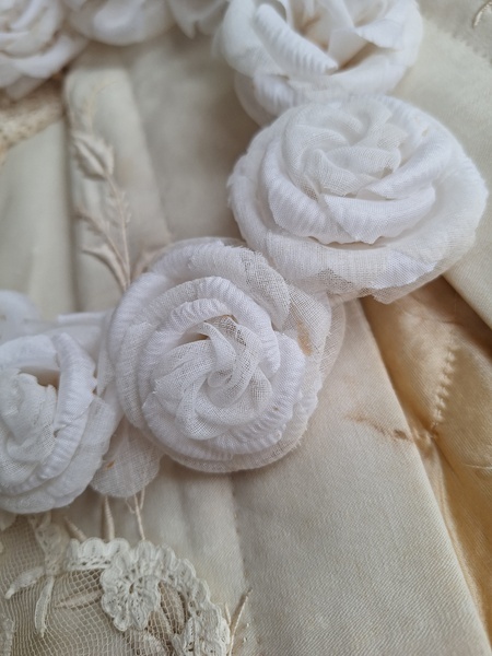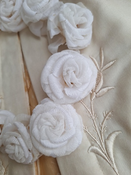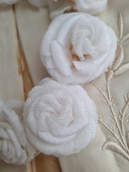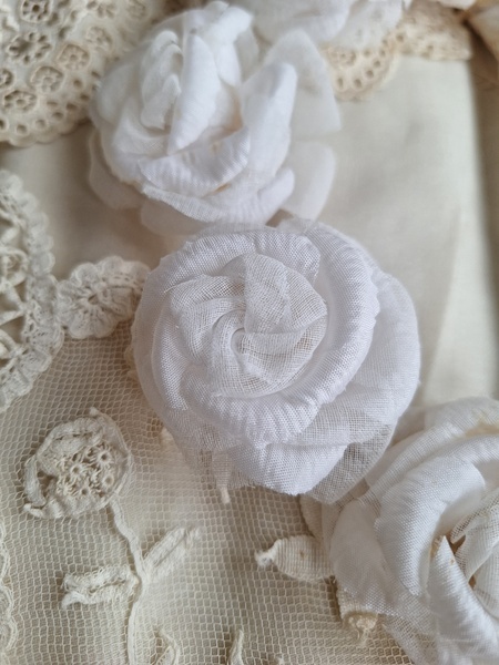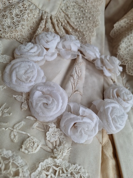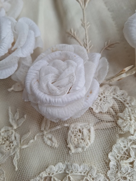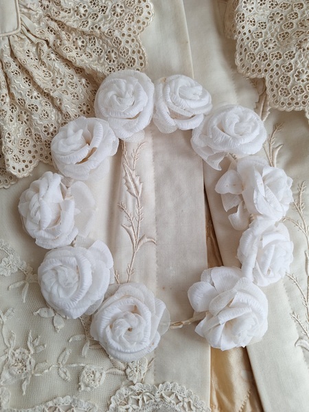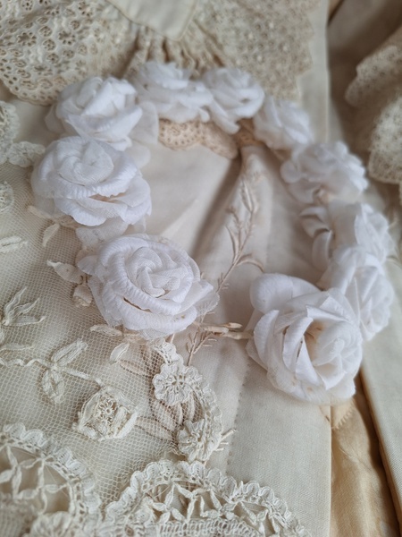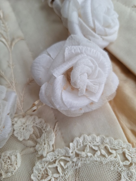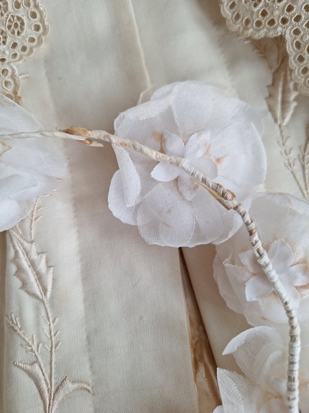 アンティーク布花冠です。コットンの優しい雰囲気の花冠です。シルクも素敵ですがこちらの温かみのある雰囲気が気に入りました。純白です。ベールなどと一緒に飾られても。フランス/1940年代ごろ