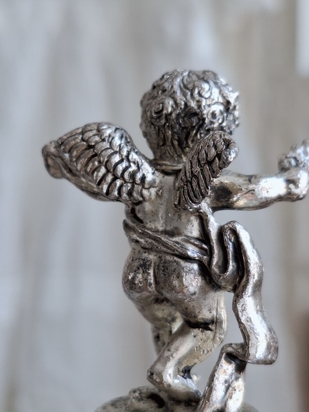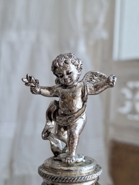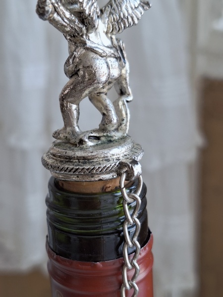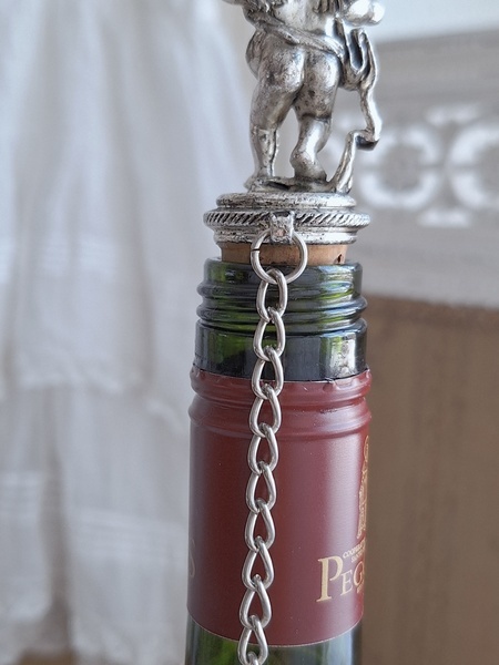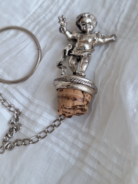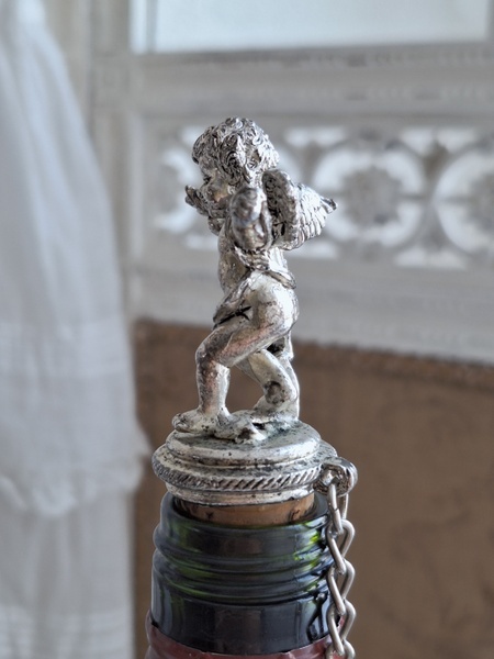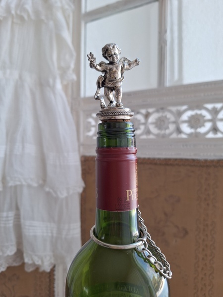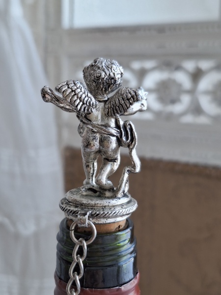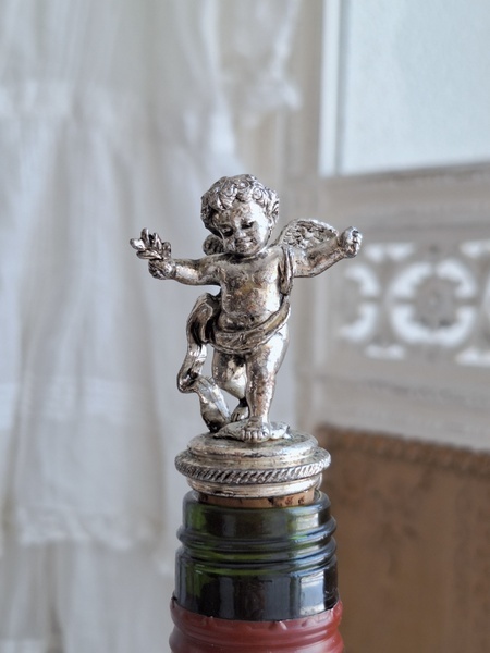 天使のワインストッパーです。内側のコルクの先が欠けています。撮影時に押し込んでいませんが押し込んだ状態で逆さにしても外れる事はないです。天使の部分は見た目よりずっしり重みがあります。実用は不可ではないですがお気入りのボトルに飾っていただいても。ベルギー/ヴィンテージ