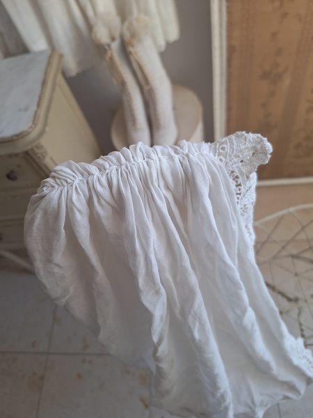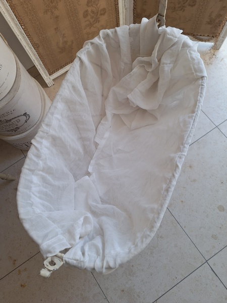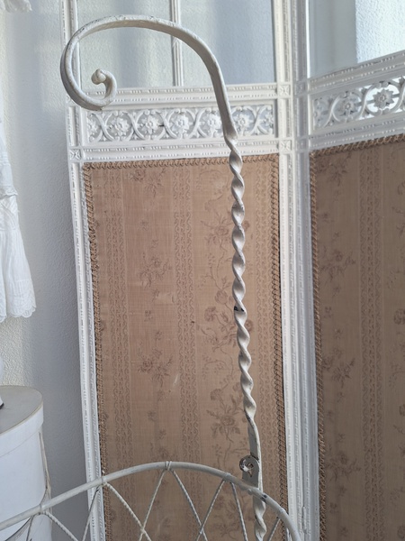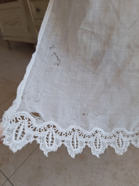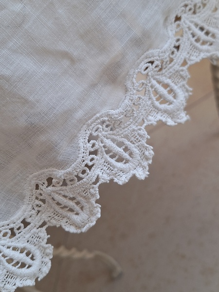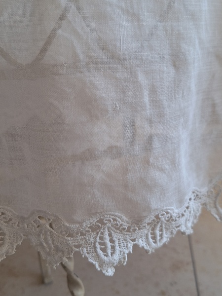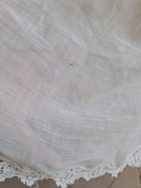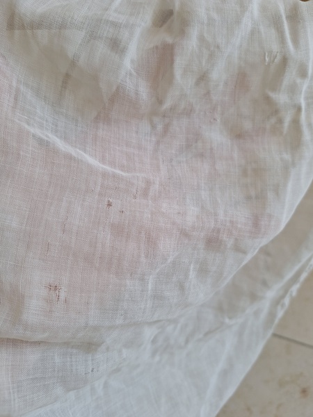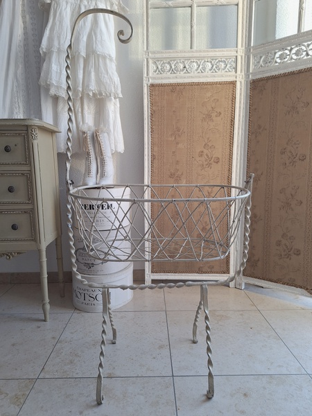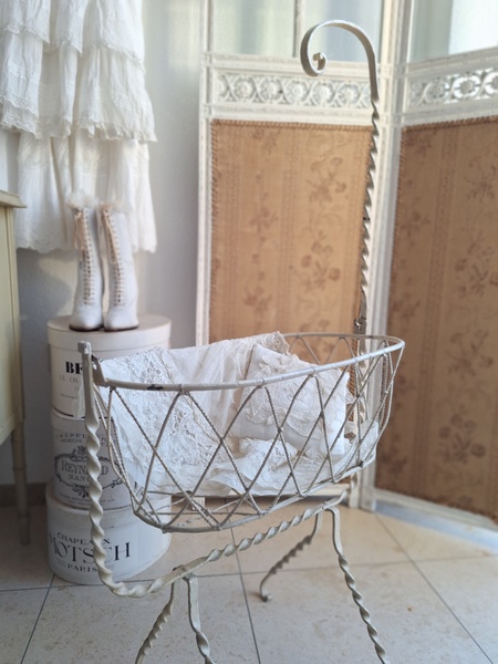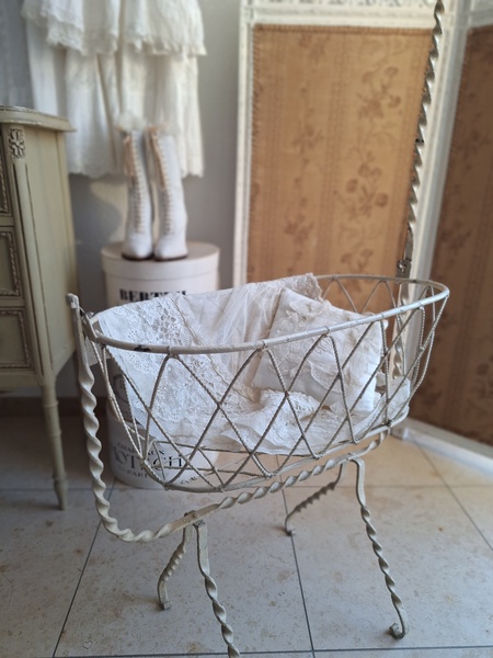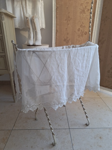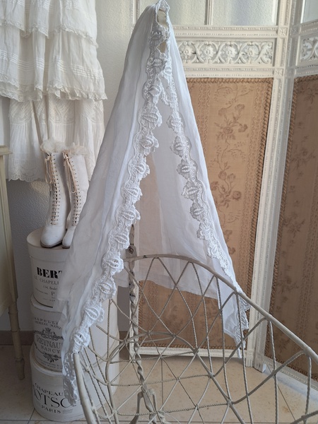 アイアン天蓋ドールベッドです。カーテン付ですが小さな痛みがあります。ポールにかけるカーテン、左右にかけるカーテンが2枚です。左右にかけるカーテンは長めに作られていますので大きな痛みの部分は端なのでカーテンを寄せてもらったら気になる感じは無いと思います。ベルギー