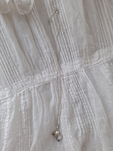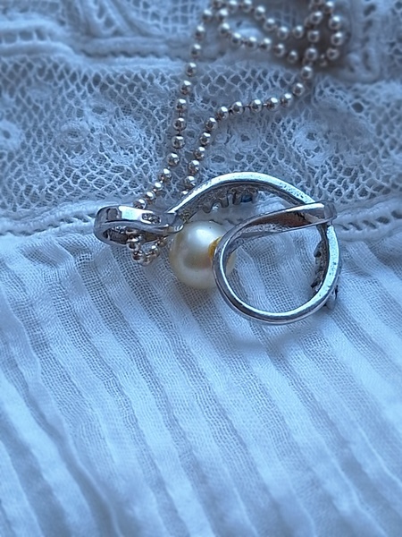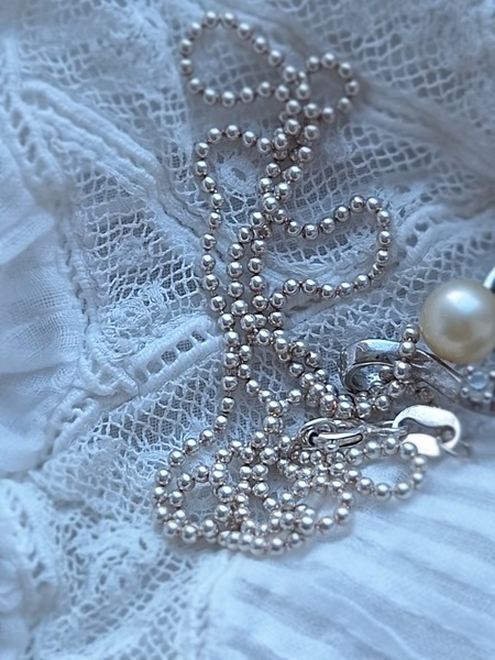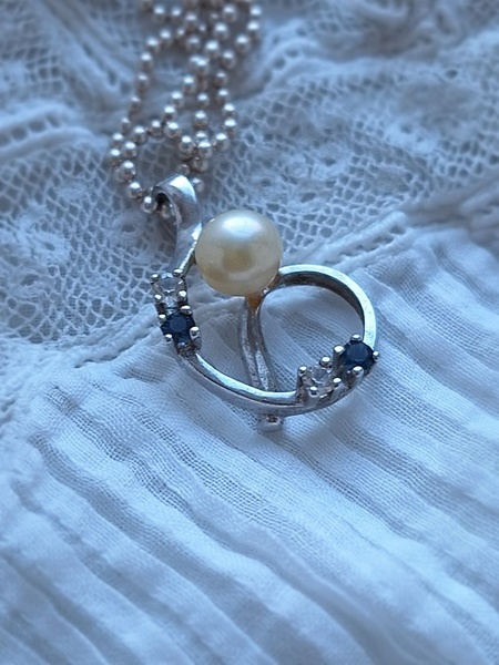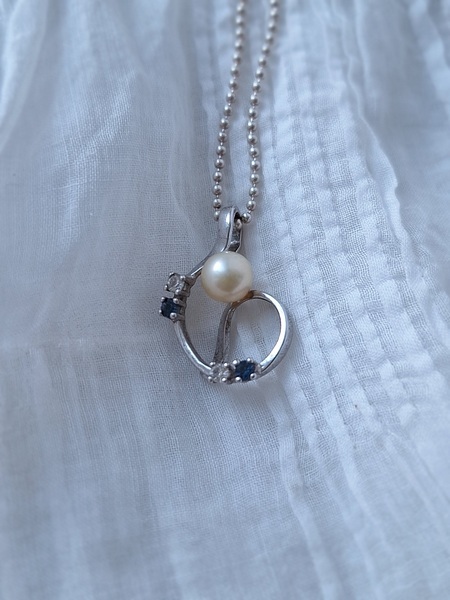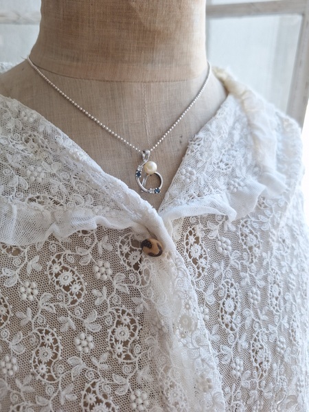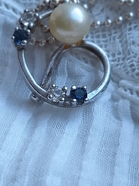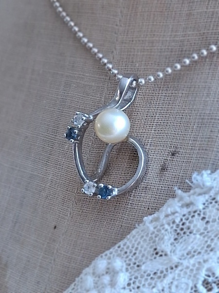 パール装飾シルバーペンダントです。ペンダントトップはシンプルでありながらデザイン性が高いフォルムでエレガントなパールに涼し気なブルーと透明のガラスで甘さを抑えたデザインですね。シルバーはトップもチェーンもどちらも刻印があります。チェーンはそれほど古い物ではないようですがヨーロッパでは純銀のシルバーも最近は7,000円くらいで販売されていますのでトップも付いていますのでお手頃価格と思います。ベルギー/ヴィンテージ