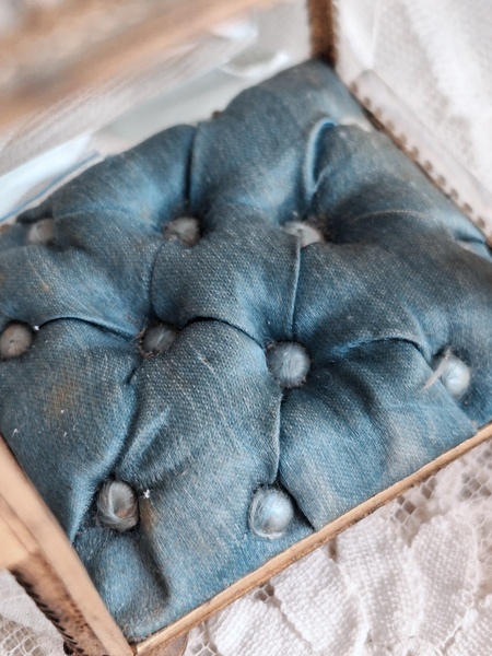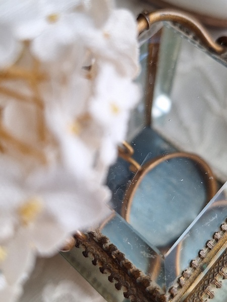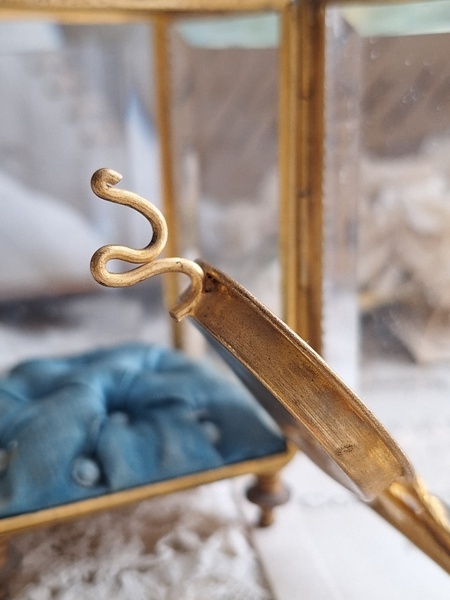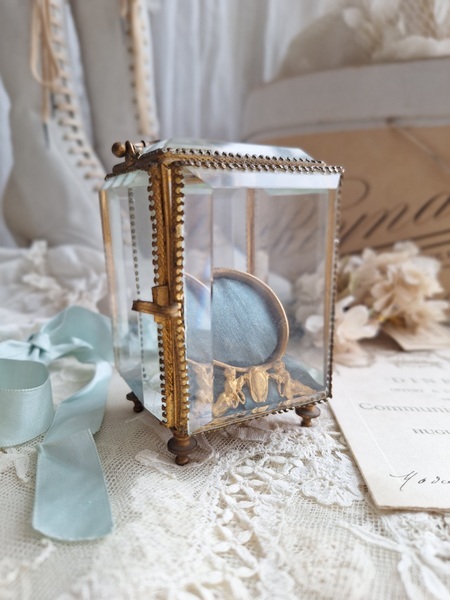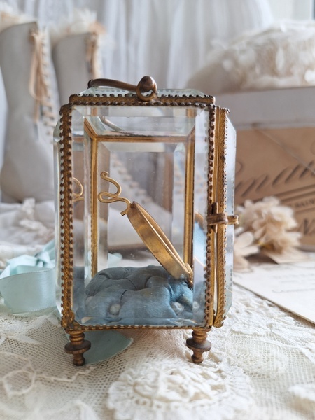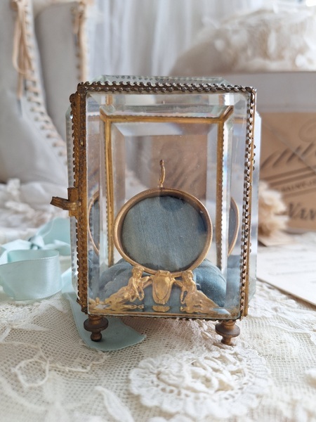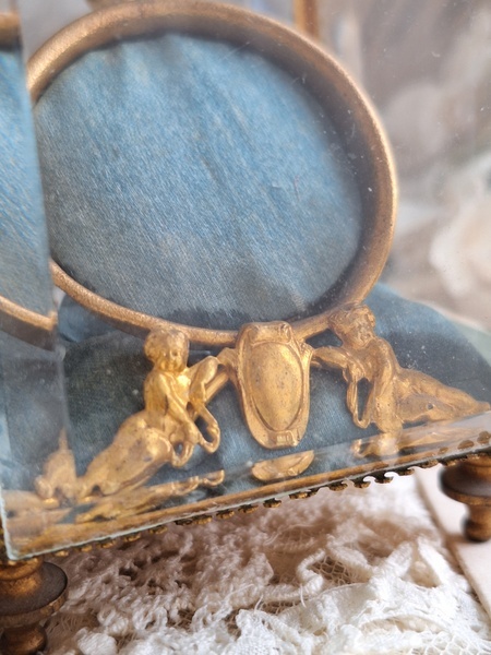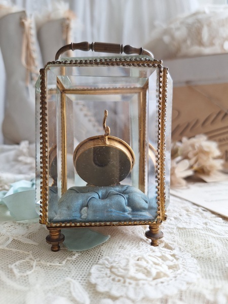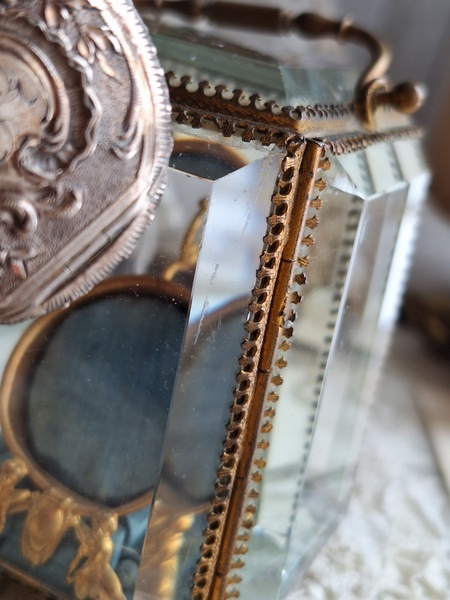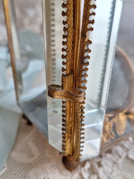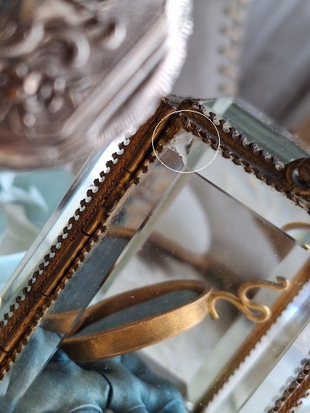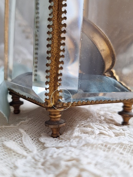 天使の懐中時計ガラスケースです。長い間買い付けをしていますがこちらのケースは初めて見ました。2人の天使が向き合った装飾が愛らしいですね。最後の方の画像でガラスに傷があります。こちらは角度に寄って見える物で拡大をしていますので実際にはほとんど気づかない程度と思います。ケースの向かって左面の後ろ下、右面の手前上にご覧のような過度にチップがあります。こちらも拡大していますので実際にはほとんど分からないと思います。ガラスのケースはどうしてもこちらのようなコンディションがよく見られます。他、持ち手が気持ち歪んでいるかなと言う感じです。フランス製