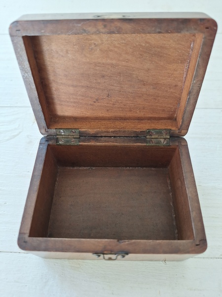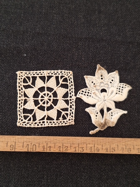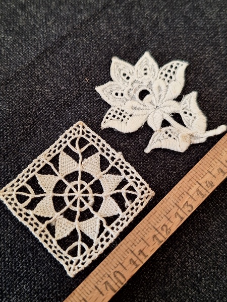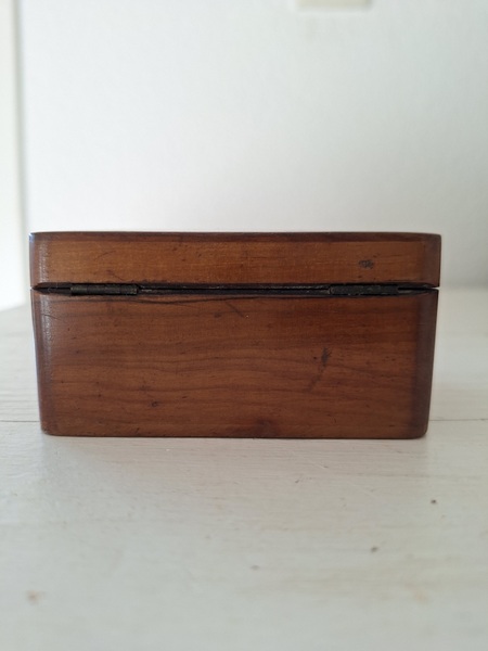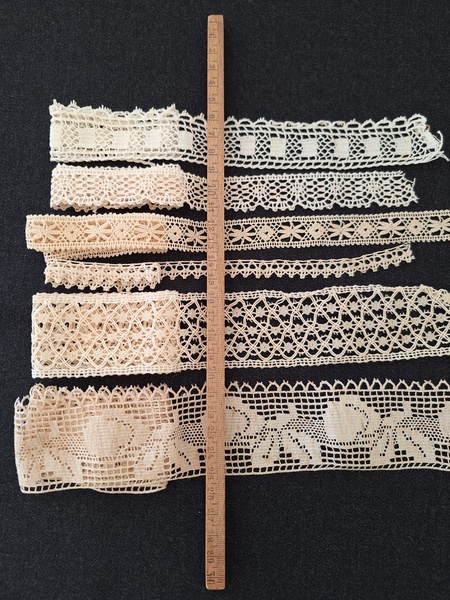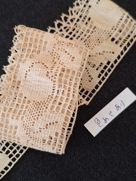 モシュリンヌボックス付レースです。残念ながら蓋の留め具のパーツが一つ欠損しています。リボンやレースなどでアレンジされても。ご覧のようなレースが付いています。多少色褪せ、痛みはあります。フランス製